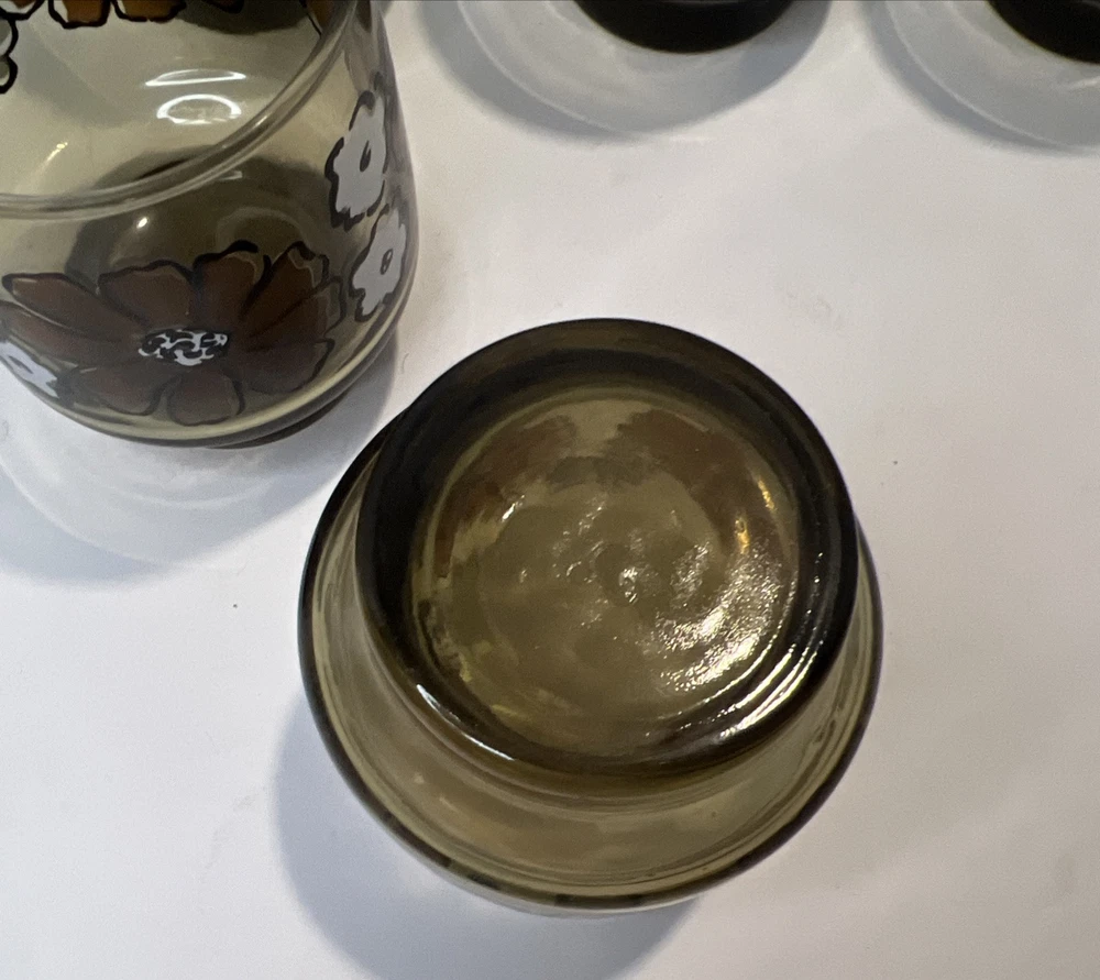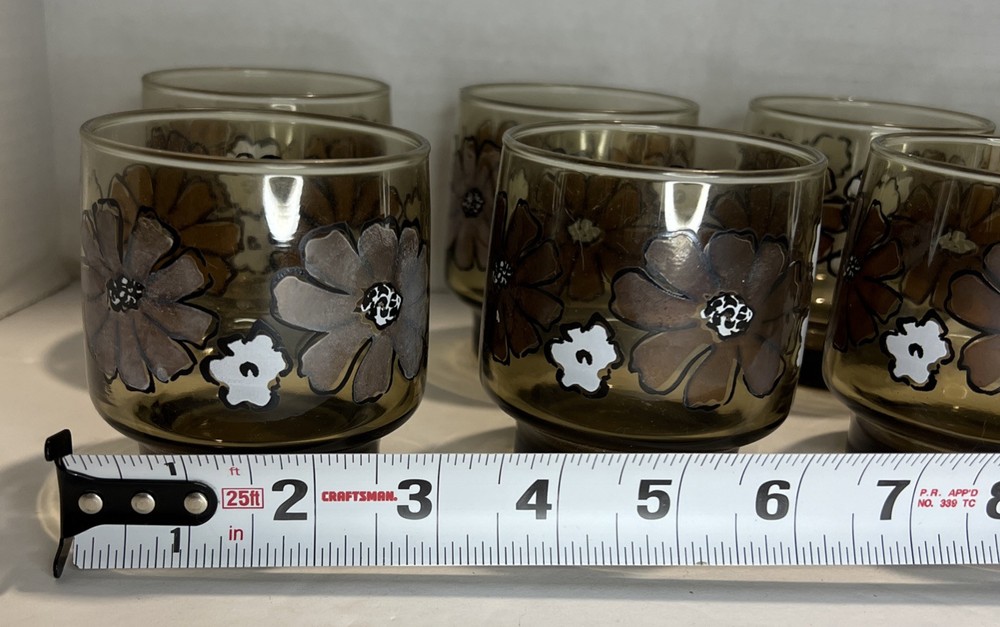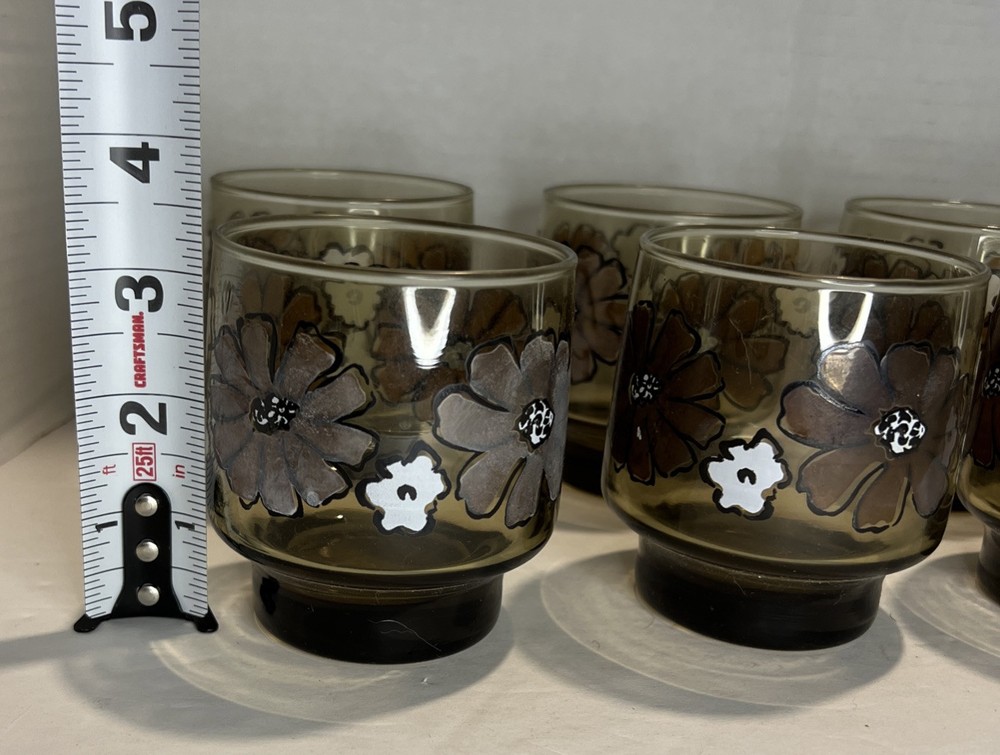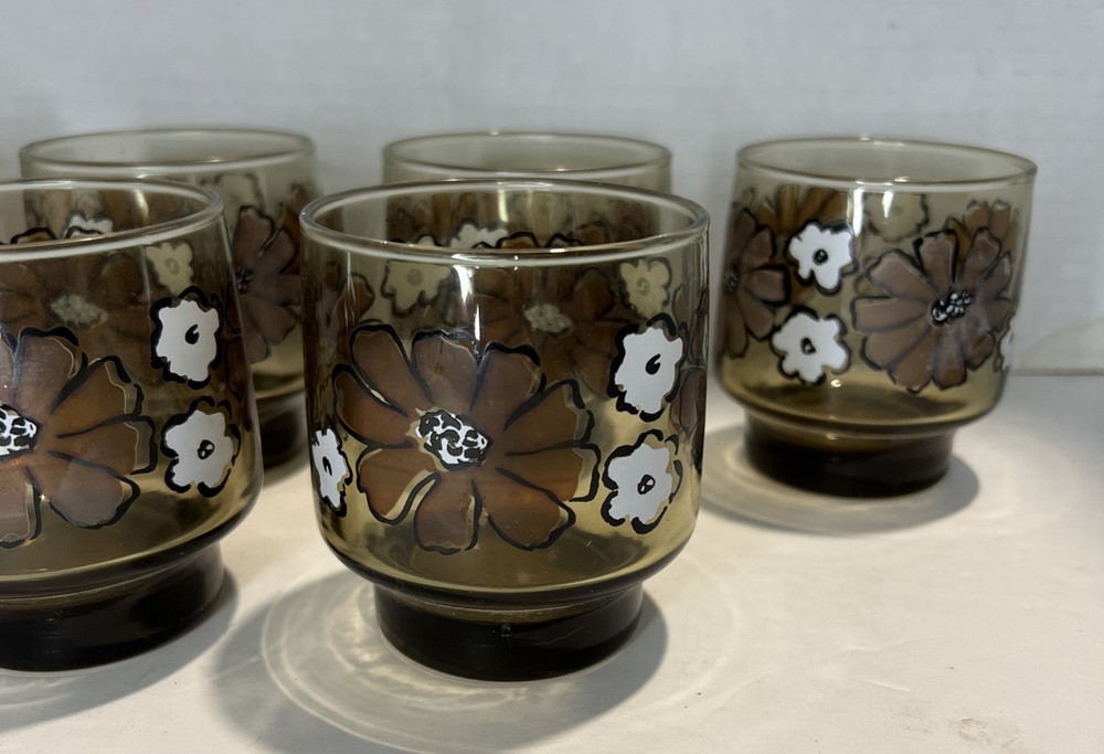 Libbey Camellia Daisy Tawny Brown Glasses Juice Set of 7 Vintage 1970s. Please see pictures. In great used condition. Check out the rest of the Libby Camellia glasses I have listed. BF L28