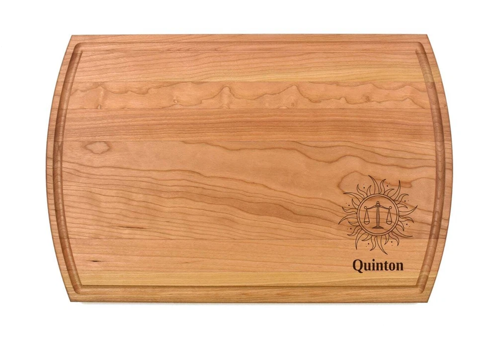 Design: Personalized Leo Cutting Board or Charcuterie Serving Tray All items ship via USPS - please make sure your address is correct :-) Whether used as a charcuterie serving tray for snacks or cutting board, our bamboo, walnut and cherry custom boards are the perfect addition for the home and make the perfect gift for your loved one celebrating a birthday, anniversary, new home, wedding, etc! *** FEATURES *** • SIZES: We have multiple styles and sizes available. To see our current sizes available, click the drop-down menu. The photo slide contains a photo showing each side by side. Please note, the board with the juice groove only has the groove on the front side of the board. • THICKNESS: Bamboo Boards - Approximately 1/2" Thick; Walnut & Cherry Boards - Approximately 3/4” Thick • UNIQUE: Every board is unique with the grain and coloring varying throughout - no board is the same! • CARE INSTRUCTIONS: Hand wash only with warm water. Do not soak. Please apply mineral oil throughout the board’s life. • PERSONALIZATION/CUSTIMIZATION: Do you want the text placed differently on the board? Please don’t hesitate to contact us. All personalization notes can be entered in the personalization box when checking out. • SHIPPING: All cutting boards ship within 2 to 5 business days. • WHOLESALE ORDERS: Please don’t hesitate to contact us for information about wholesale orders. Processing times for larger orders may change. • NOTE: Colors can vary a bit on different monitors and screens. Any props included in photos are not included. Please be sure to double-check your address to make sure it is accurate for USPS delivery. If a package is returned to us due to an invalid address, the buyer is responsible for all additional shipping charges. We appreciate you supporting small business – best wishes! For items ordered with simple edits, we do not send proofs since the layout doesn't change from the example(s). However, in the event there are requests that change the layout from the example(s), we do send proofs for approval before making the product. If you'd like a proof before we make the product, please note so in the personalization box.