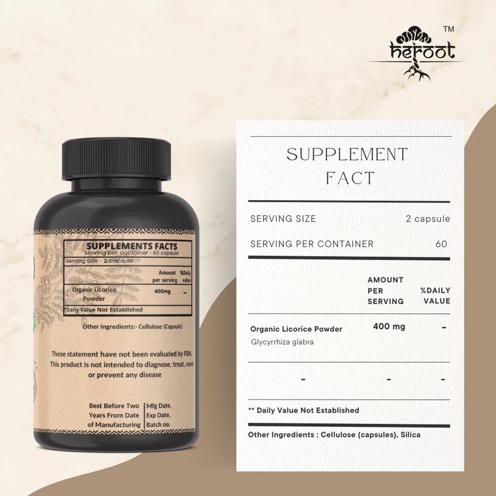 Heroot Organic Licorice 400mg Capsules Licorice Vegetarian Capsules is an ayurvedic medicine that supports in the respiratory and digestive wellness. It is found to be effective against functional dyspepsia, which includes not only heartburn but also a natural remedy for nausea, indigestion and stomach pain. It has anti inflammatory properties and is soothing herb that is used as natural remedy for ulcers and can be a beneficial leaky gut supplement. Key Ingredients: Organic Licorice Powder Key Benefits: Supports in respiratory & digestive wellness Useful as anti-oxidants and immunity booster Anti-inflammatory properties provide relief to a irritated sore throat Useful in Acidity & as Mild Laxative Known helpful for menstrual and fertility related concerns Soothes the pain related to eczema and other dermal related concerns Directions For Use: As a dietary supplement, take one capsule per day with water or as recommended by your healthcare provider. Safety Information: Store in a cool dry place Keep out of reach of children If you are pregnant or lactating or prone to any food allergy or under any medical condition consult your healthcare practitioner before use Disclaimer The above description is for information and knowledge purpose, not a healthcare professional advice. Please consult your doctor and/or pharmacist before you take this vitamin. Pregnant or lactating women, diabetics, hypoglycemics, and people with known medical conditions and/or taking drugs, should consult with a licensed physician and/or pharmacist prior to starting any supplementation program. The above statements have not been evaluated by the Food & Drug Administration. Shipping and Handling Shipping time will be 1 business day after the cleared payment We will ship by Indian Post service Shipment will take 15-30 days. Few more days for your local customs delay and formalities. For Express service additional charges will be applied. For any reason you wish to leave Negative or neutral feedback, Please contact us first and let us mutually resolve it. We care for your satisfaction and will make sure that you are happy with the transaction to post us 5**** ratings in all areas. ***Customs Information*** Heroot will not be liable for packages refused or held by customs for delivery. We request that you contact customs office and ask about import regulations and restrictions before placing your order. It is importsnt for you to become familiar with customs policies for your specific country before ordering. Customs regulations differ by country and not knowing their regulations can result in your order incurring high import duties, the delivery being delayed or even returned. Please check with your customs office to see if your country permits the shipment of the products you are planning to order from us and if any additional licenses or permits are needed. Please note: if your order is returned to us due to banned/ restricted products policy, a wrong address, refusal to pay customs fees, refusal to accept the order or because no one was there to accept the delivery of your order, we will refund your order as follow: you will be refunded the total amount of the order, minus the original shipping charge.