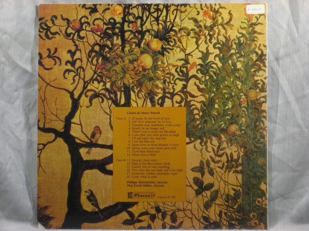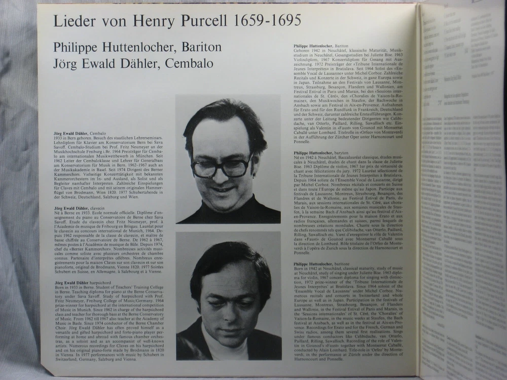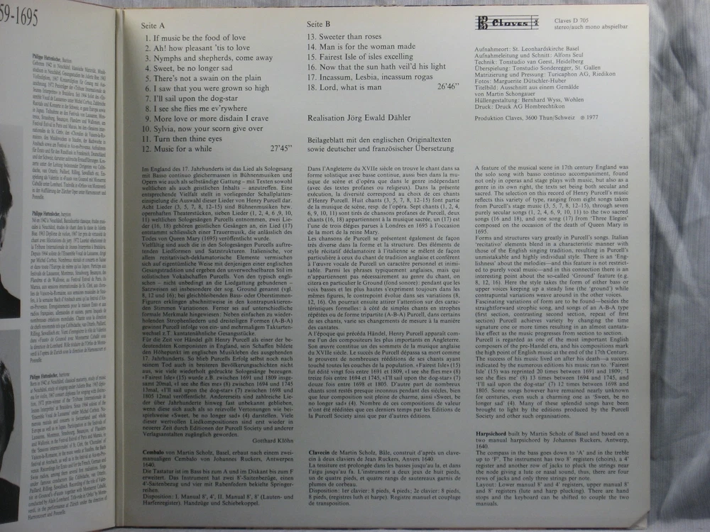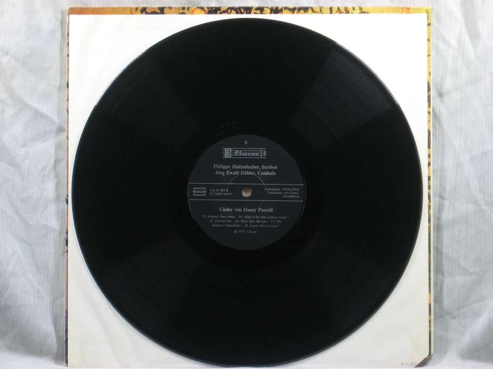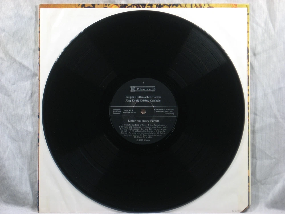 This 1977 Swiss import stereo album from Claves Records (D 705) features performances of several songs by Henry Purcell. Performers include Philippe Huttenlocher (Baritone) accompanied by Jörg Ewald Dähler (Harpsichord). Album notes are in German, French and English by Gotthard Klöhn. The outer sleeve shows a corner cutoff at lower right (Photo 1) and a small collection index sticker in the upper right corner of the back . (Photo 2) This is one of many titles from an extensive collection of classical LPs and CDs that we will be listing here. All have been carefully stored for many years, played only on premium equipment, and show little to no wear. NOTES: Album sleeves may have a small index sticker, usually in the upper right corner of the back, which was applied when the album was first purchased for this private collection. Please be sure you know the Shipping charge to your address before bidding. See the Shipping and Handling section of this listing for all rates, including international Shipping charges. Please do not copy any part of this listing without permission.