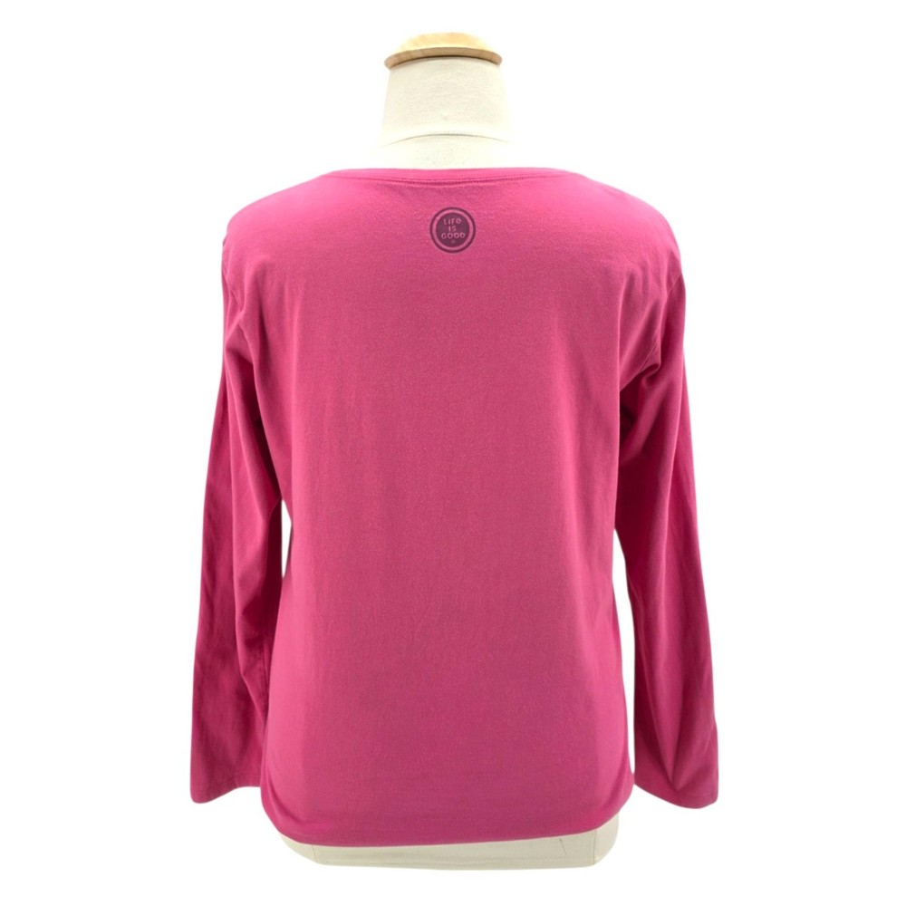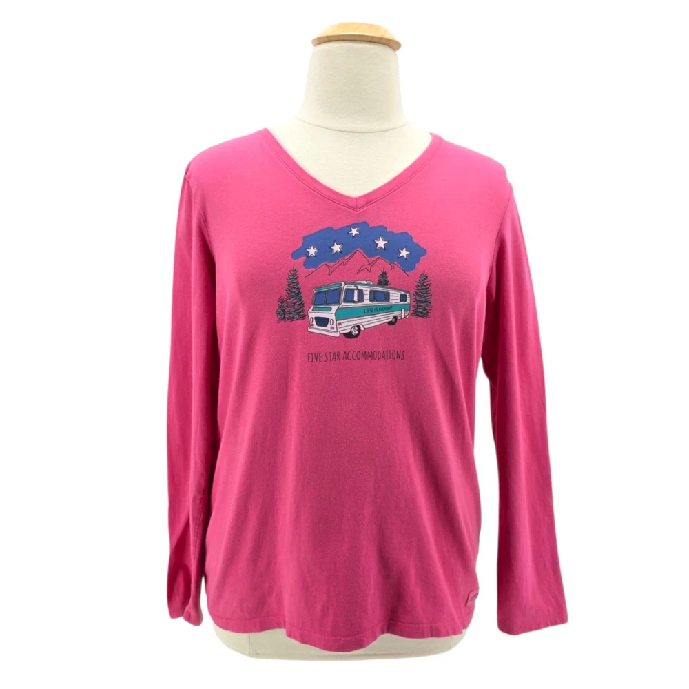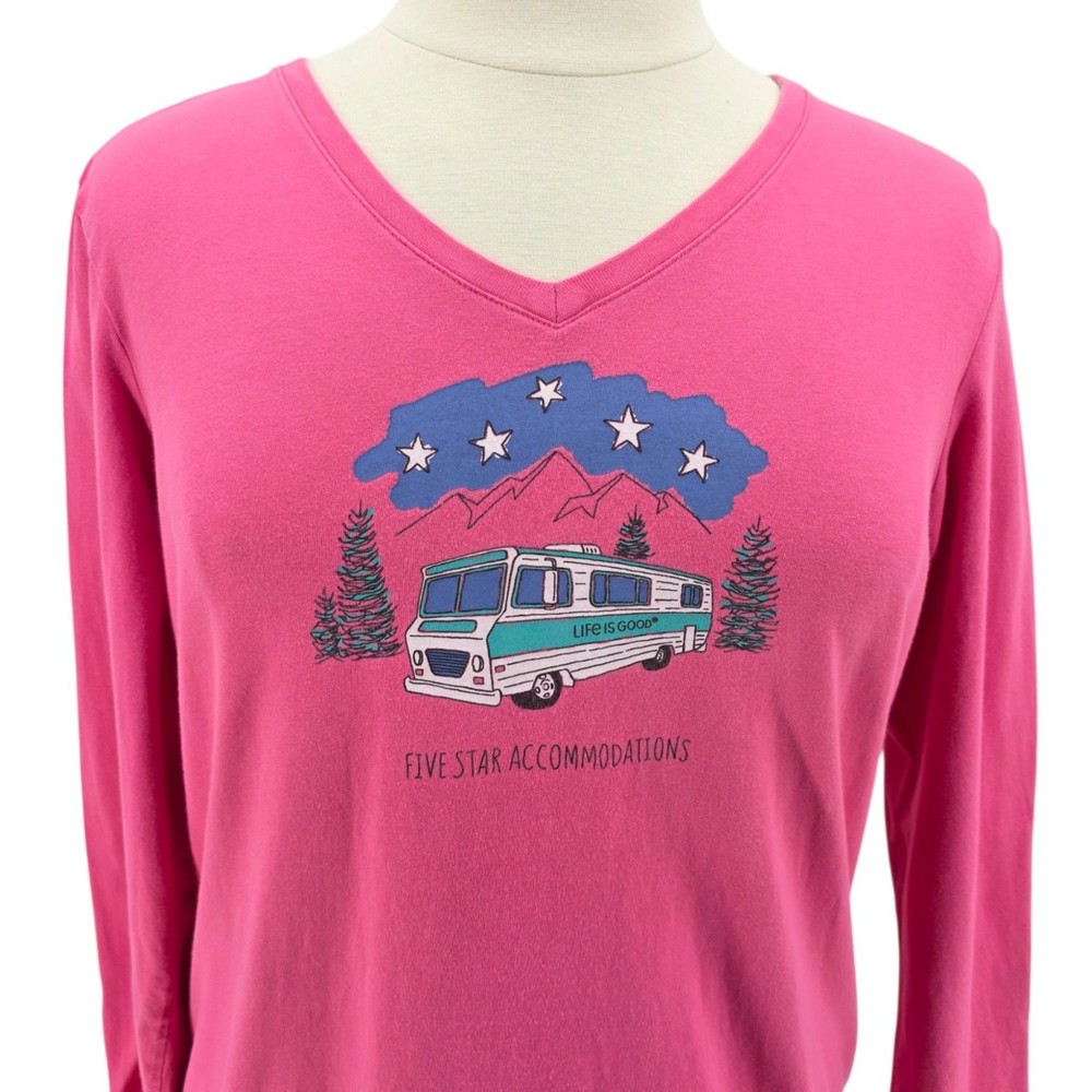 Life Is Good Womens XL Top Crusher Tee Five Star Accommodations RV Camping Pink V-Neck Women's Size XL - X-Large Long sleeve V-neck t-shirt - top - tee - shade of pink. Five Star Accommodations spelled out with camping scene graphcis - RV stars & tree. 100% Cotton. Made in Peru. Condition: Pre-Owned, No Flaws Measurements: Approximately 23.5" armpit to armpit & 26" long