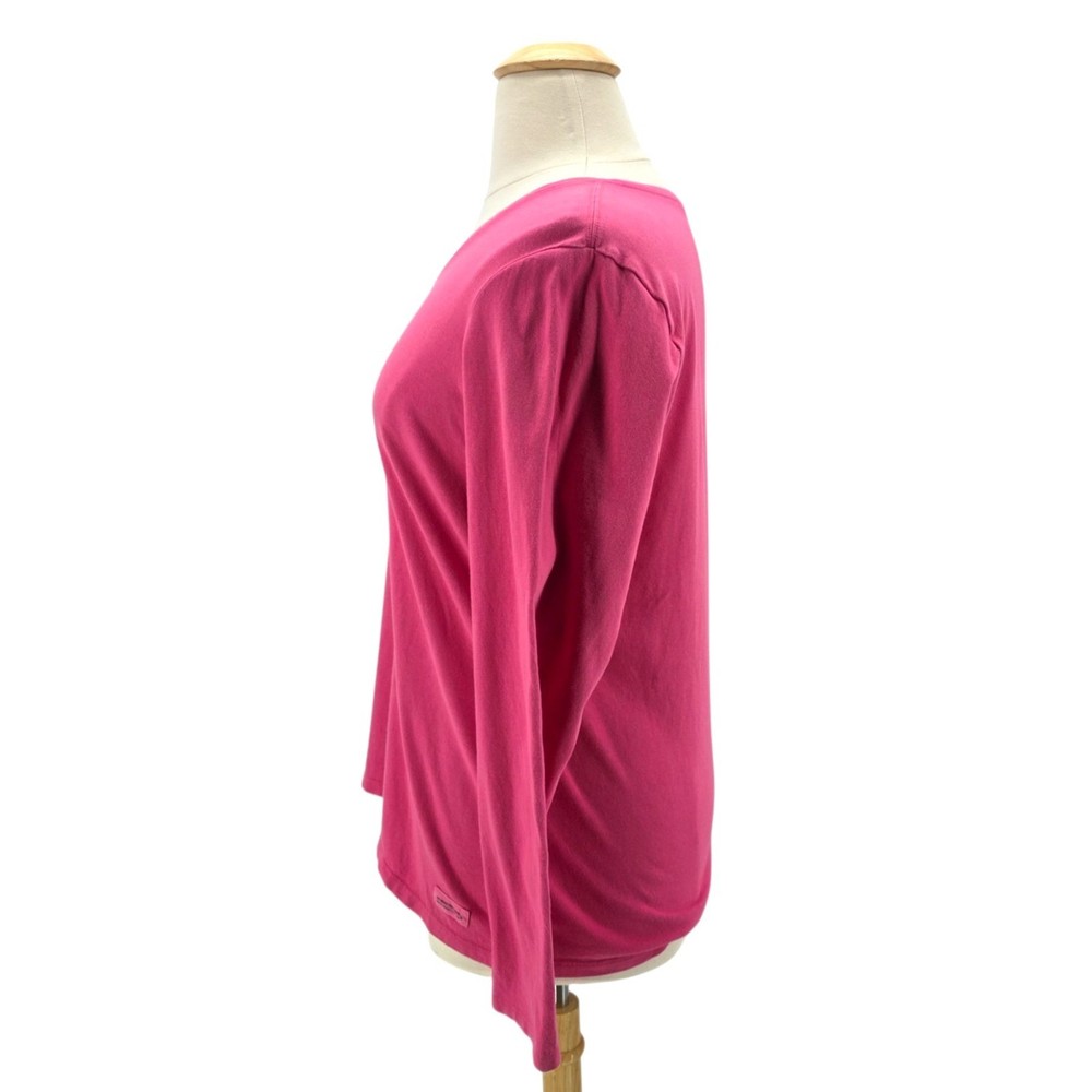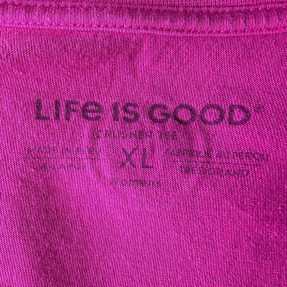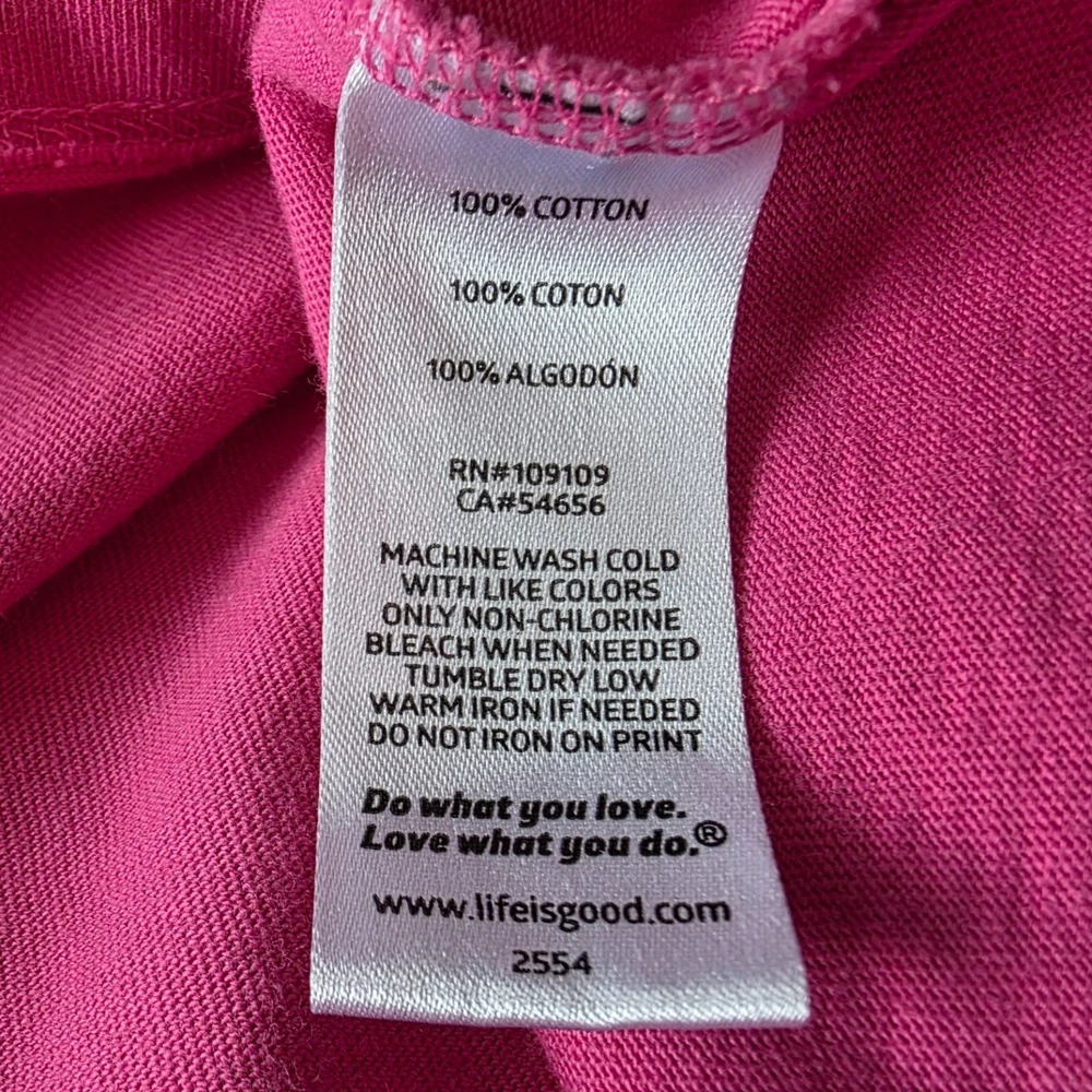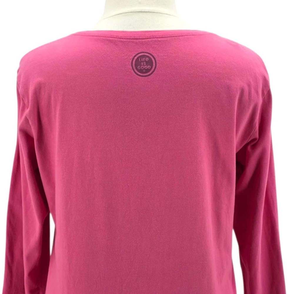Life Is Good Womens XL Top Crusher Tee Five Star Accommodations RV Camping Pink V-Neck Women's Size XL - X-Large Long sleeve V-neck t-shirt - top - tee - shade of pink. Five Star Accommodations spelled out with camping scene graphcis - RV stars & tree. 100% Cotton. Made in Peru. Condition: Pre-Owned, No Flaws Measurements: Approximately 23.5" armpit to armpit & 26" long