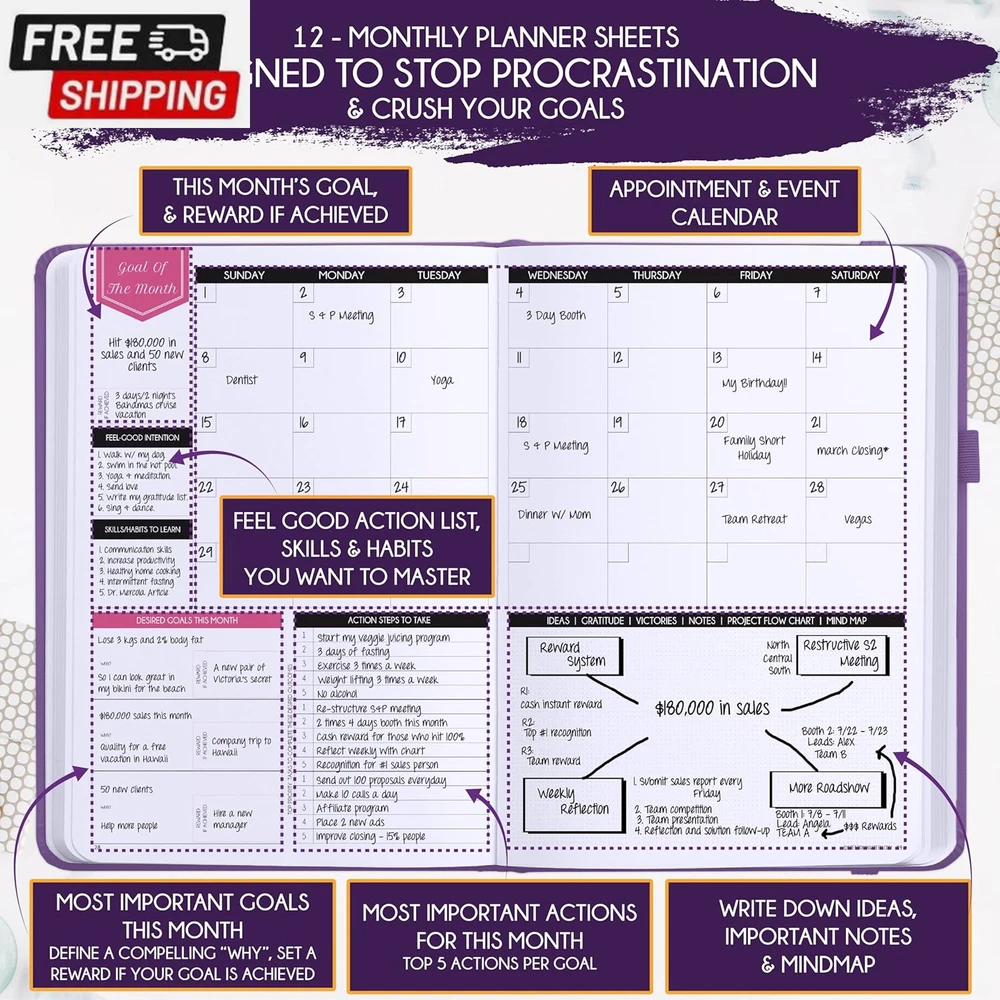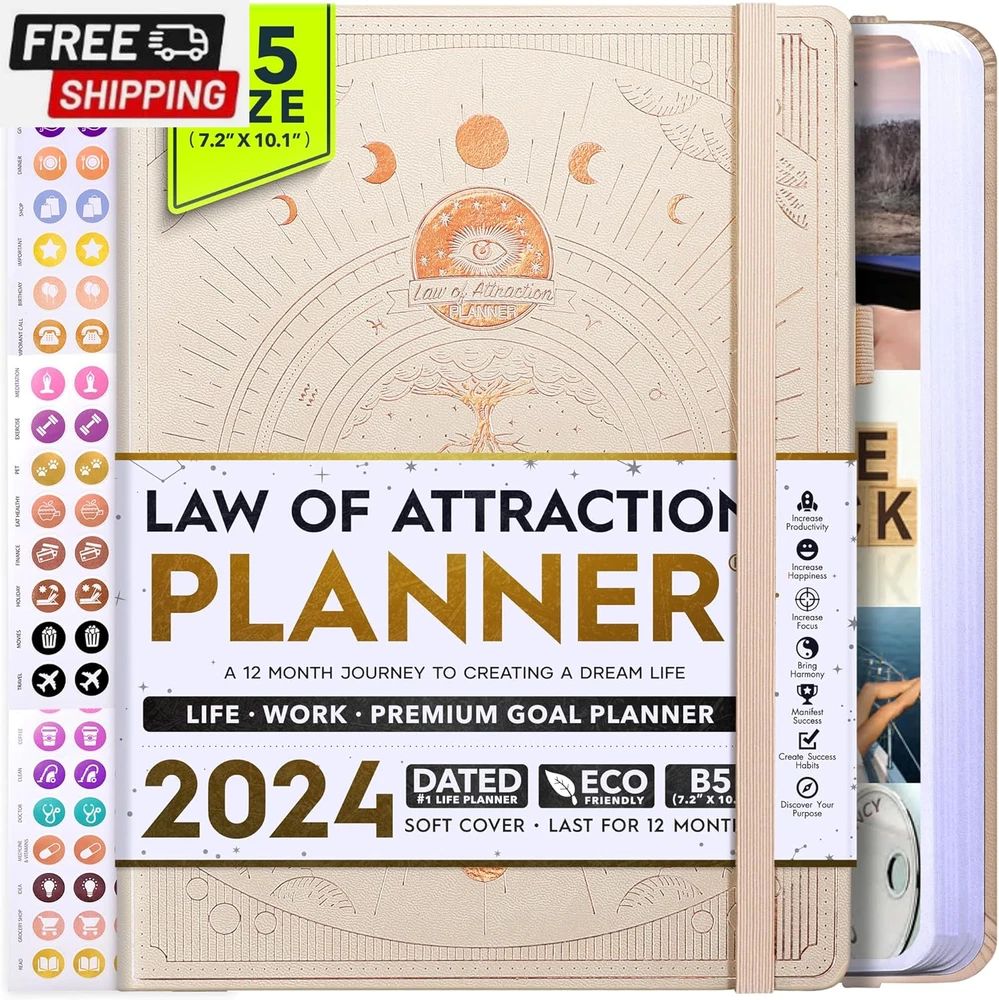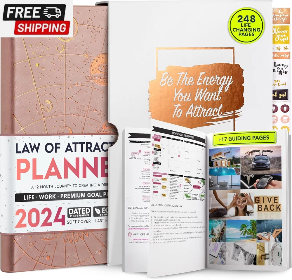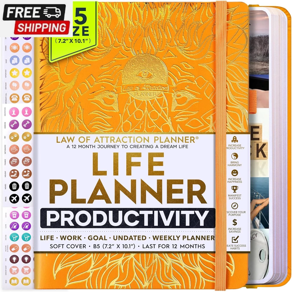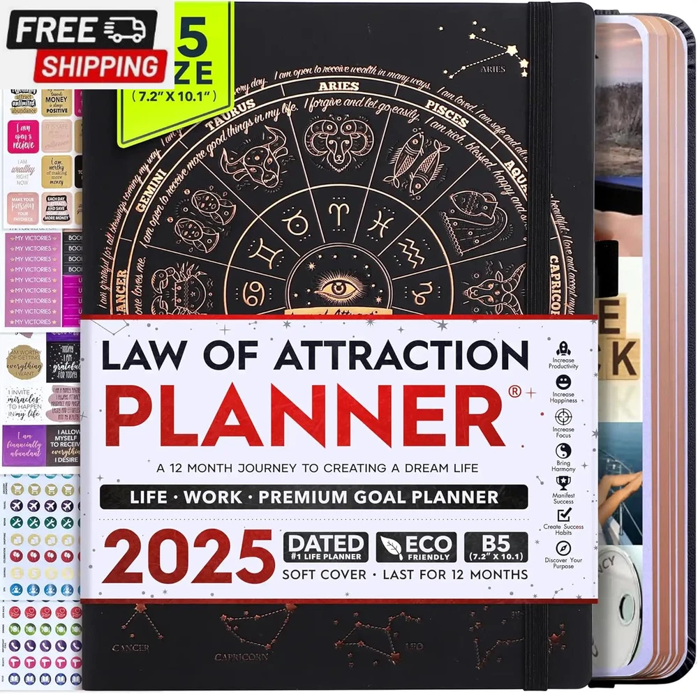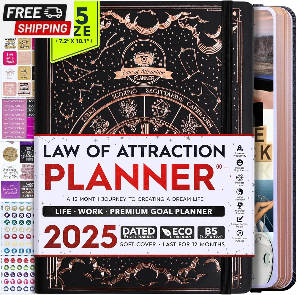 Life Planner - Undated Deluxe Weekly and Monthly Planner, a 12 Month Journey to Increase Productivity, Happiness & Enhance Organization | Life Organizer, Gratitude Journal, Agenda Planner, to Do List, Gift Box & Stickers - Start Anytime UNDATED PLANNER - All the success tools you need to create the life you always wanted. Sunday start pages, B5 Size (7.2 x 10.1 inches), thick paper 100 gsm, 248 pages of life transformation, 52 weekly, 12 monthly planning overviews & reflection, 30 dotted journal pages, up to 295 productivity stickers, habit trackers, mind maps, out foldable vision board, morning, evening routines. This life planner is UNDATED daily planner, undated weekly planner and undated monthly planner giving you the freedom to start your journey whenever suits you best. INCREASE PRODUCTIVITY AND HAPPINESS - This is a deluxe life goal planner showing you how to become the best possible version of yourself on a mental, physical & interpersonal level using the law of attraction vibration guide. This planner is a daily planner, monthly planner, weekly planner, productivity planner, goal planner, business planner, to do list planner, planner notebook & gratitude journal all-in-one. ACHIEVE YOUR GOALS USING THE LAW OF ATTRACTION - Learn how to set big goals, be happy and manage your time well, and follow the same methods millionaires around the world use to set goals and achieve them. This monthly planner undated planner, life planner, hourly planner, yearly planner, work planner, schedule planner or appointment book. It's a perfect planner for women and men. REDUCE OVERWHELM, STRESS AND FIX PROCRASTINATION - Follow a unique 8 step system that will help you bring back harmony, clarity, and peace in your life while achieving your goals. This planner is perfect for birthday gift, mother's day, anniversary gifts, and christmas gifts. LUXURIOUS & TOP QUALITY- Ideal for both women and men, perfect for entrepreneurs, professionals, college students, and everyone who has a burning desire to turn dreams into reality. No questions asked money-back guarantee. Product Description UNDATED DAILY PLANNER READY TO CREATE THE LIFE YOU ALWAYS WANTED WITH THE BEST LIFE PLANNER ON THE MARKET? The ONLY Law of Attraction Planner 2025 comes with Udated Daily Planner options that helps you find your Purpose, Eliminate Procrastination, Anxiety, Overwhelm and Stress by Guiding you Through 8 Simple Steps To Maximize your Productivity, Increase Creativity and Passion for Crushing Your Goals! The Law of Attraction Planner is a Life planner - A Manifestation Journal aids you in manifesting your desires through the practice of keeping a Manifesting Journal - a Time Management Planner - a Self Care Journal - a Vision Board Journal - a Life Coach - Work Planner, Agenda and Personalised Organiser , All in one. It combines the manifesting abilities and spiritual guidance from the law of attraction that also includes all the tools to achieve your short and long-term goals like principles of wealth building, and self-motivation all integrated into a daily schedule planner. Experience the transformative power of a 3-minute Positivity Journal and Planner, designed to create a manifesto effect from day 1! The Law of Attraction Planner contains 248 life-changing pages with 45 journal pages, habit trackers, mind maps, out foldable vision board, morning & evening routines. It also has a pen loop and 2 bookmarks. THE LAW OF ATTRACTION PLANNER WILL BE YOUR SECRET "UNFAIR ADVANTAGE" 2025 Hourly Planner , THERE’S A SMARTER WAY TO PLAN YOUR BEST YEAR! A LIFE THAT’S WORTH IT, IS WORTH PLANNING Once you start using the law of attraction's unique 8-step process you will understand how high achievers can accomplish so much more success in the same amount of time everyone else has. The 8-Step Law of Attraction Roadmap guides you to improve in all areas of your life from your career, family, health, fun activities, habits, emotional, relationships, spiritual, and life goals. As you continue using the law of attraction planner you will forget Incomplete, LOW-QUALITY Planners That ARE MISSING IMPORTANT STEPS AND Will Never Lead you To True Success! The Law of attraction Planner includes special tools to help you achieve your short and long term goals and to help you find your passion and purpose in life. This is the only Planner with the key self-development processes found inexpensive personal development books and life coaching courses that have been divided into 8 steps for radical life transformation. Let’s take a look at the 8-steps inside the Freedom Mastery’s Deluxe Law of Attraction Planner that similarly priced but lower quality planners lack. The 8-Step Law of Attraction Roadmap guides you to improve in all areas of your life from your career, family, health, fun activities, habits, emotional, relationships, spiritual and life goals. Life planner - a Manifesting Journal - a Time Management Planner - a Self Care Journal - a Vision Board Journal - a Life Coach - all in one YOUR IDEAS AND PLANS DESERVE TOP QUALITY PLANNERS THAT LAST A LIFE TIME The Law of Attraction Blueprint life planner was designed to give you a new self-awareness personal planner and self-discovery daily schedule planner of your life as it guides you to attract what you desire. The Law of Attraction Planner is the first Planner to use a Reward Structure.(Step 1&2). Science has confirmed that using a Reward on completing a goal creates positive neural pathways to better habits. The daily planner 2025 guides you to find your purpose and passion and see on an organized notebook the vision of your future life . Writing your mission statement on an appointment book helps you clearly know what is most important to you with the help of a productivity planner so you are on the right path to using the power of the law of attraction in creating a happier life. BEST Goal Planner 2025 Vision Board The Law of Attraction daily planner follows the same methods used by bi