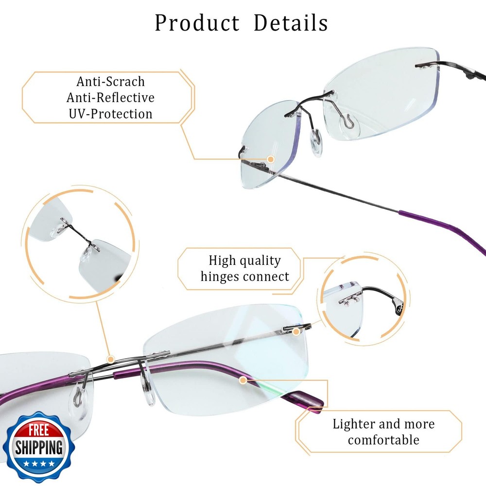 LifeArt Blue Light Blocking Computer Reading Glasses, Men’s and Women’s Rimless Frame, Anti Eyestrain, +2.25 Magnification Features Advanced Blue Light Blocking Lenses: Reflect and filter blue light with a 7-layer anti-reflective coating, reducing glare, preventing color distortion, and improving sleep by minimizing eye-strain during screen time. Superior Clarity & Durability: High light transmittance helps ensure no noticeable yellow tint, maintaining true colors, while the ultra-thin 10μm multi-layer coating enhances scratch resistance and lens longevity. Customizable Magnification Options: Available in strengths from +0.00 to +4.00, these magnified lenses provide sharp focus for close-up tasks like reading, working on laptops, or viewing screens. IMPORTANT: Please select the correct magnification so your order can be properly filled. The one you choose now is +2.25 Magnification Lightweight & Versatile Design: Classic rimless design with an ultra-lightweight build (0.28oz) create a comfortable, universal fit suitable for most face shapes and all-day wear. Refer to images for glasses dimensions. Premium Quality Assurance: Our eyewear is designed to meet the highest standards of durability and performance. We have a 30-day free return policy. Contact us anytime for support or if you experience any issues. Shipping Free & Fast Shipping: We offer free shipping to most of the USA with a normal delivery time of 3-7 days. However, due to the current situation, additional delivery time (up to 3 weeks) may be required for some items. Alternative Carriers: We may use alternative carriers (e.g., USPS, FedEx, UPS) to ensure your package arrives safely and on time. Due to the use of multiple carriers, we are unable to provide a tracking number automatically. Handling Time: Orders are processed and shipped within 1-2 business days of receiving cleared payment. Shipping Restrictions: Shipping to Alaska, Hawaii, Puerto Rico, Guam, and other US territories may incur shipping charges or delivery restrictions. Please contact us before ordering, or your order can be refunded/cancelled. State Restrictions: Certain items may not be shipped to California due to state regulations. Contact for Tracking Updates: If you require tracking updates or have any concerns about the delivery of your order, please feel free to contact us, and we will be happy to assist you. Return Policy 30-Day Hassle-Free Returns: If you are not completely satisfied with your purchase, you can return the item for free within 30 days of receiving it for a full refund or exchange. Easy Return Process: Contact us, and we will provide you with a prepaid return shipping label and detailed instructions. No Restocking Fee: There are no restocking fees for returns. However, the buyer is responsible for return shipping costs if the return is not due to a seller"s error. Refund Processing: Refunds will be processed within 1 business day of receiving the returned item in its original condition. Feedback Your feedback is extremely important to us. We strive to provide the best products and customer service possible. If you are satisfied with your purchase, please take a moment to leave us a positive review. If you have any concerns or issues with your order, please contact us before leaving negative feedback. We are committed to resolving any problems and ensuring your satisfaction. Contact Us If you have any questions or concerns, please feel free to reach out to our customer support team. You can contact us through the eBay messaging system. We are available Monday to Friday, 9:00 am to 5:00 pm EST, and we will do our best to respond to your inquiry within 24 hours. Thank you for supporting our small family business!