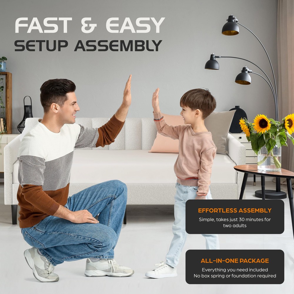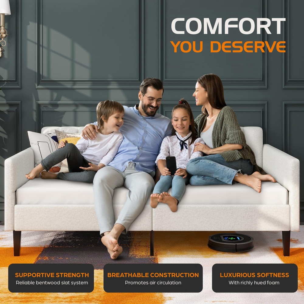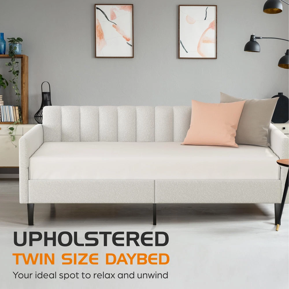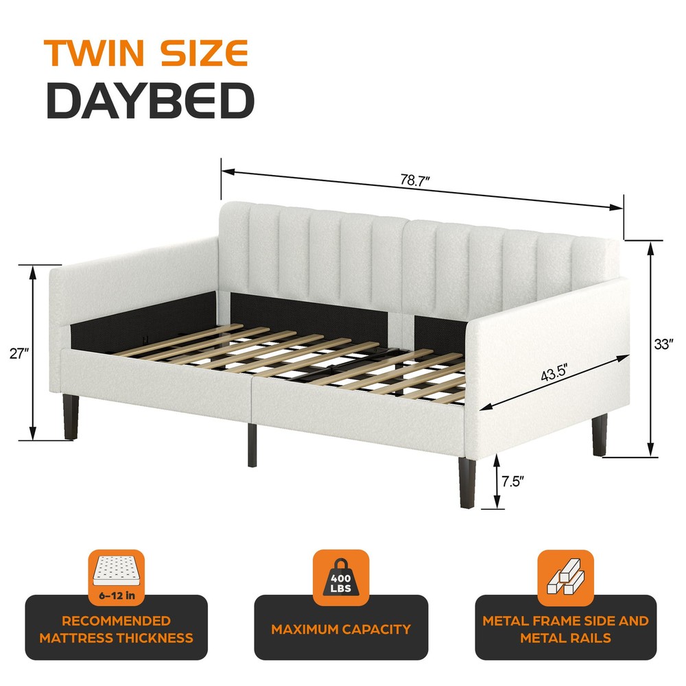 Twin Size Daybed: The LifeSky twin-sized daybed is compact & multi-functional, perfect for small living spaces, offers the flexibility of a bed and a sofa in one. It fits perfectly in living room, apartments, studios, or dorm rooms, providing a stylish and comfortable solution for sleeping and sitting(mattress not included). Upholstered Daybed: This daybed is upholstered in luxurious boucle fabric, featuring classic button tufting that enhances any decor. Its elegant design seamlessly blends into both modern and traditional settings, enhancing the visual appeal of your home or office. Metal Frame & Bentwood Slat System: Crafted with a sturdy metal frame reinforced by additional side rails, this daybed comfortably supports up to 400 lbs. The integrated bentwood slat system provides a reliable, squeak-free foundation, enhancing both mattress support and breathability for a restful sleep without the need for a box spring. Easy Assembly & Hassle-Free Setup: The LifeSky daybed is designed for simplicity, with clear instructions and all necessary tools included. Assembly can be completed swiftly in about 30 minutes by two people, making it easy to transform any room into a versatile living space. Versatility for Modern Living: Ideal for use in living room, bedrooms, family rooms, or guest rooms, this daybed serves as both a comfortable bed and a plush couch. Its adaptable design makes it suitable for daily relaxation or hosting overnight guests, catering to a range of modern living needs.
