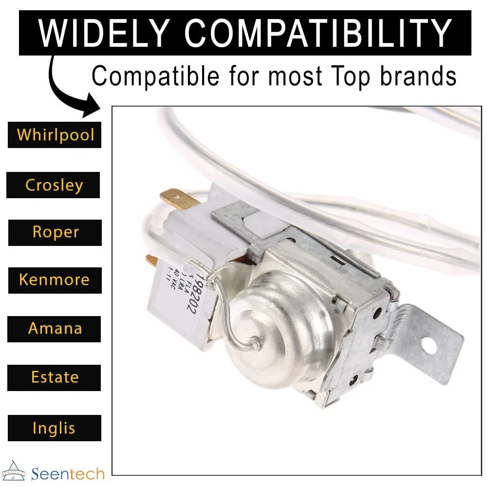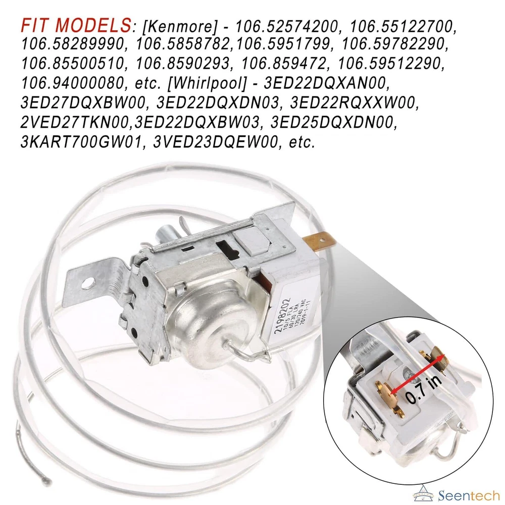 The 2198202 Refrigerator Cold Control is used in refrigerator units and freezers as a sensor. The thermostat senses the temperature increase in the evaporator during the cycle of defrosting and turns off when ice is melted. The tools needed for this repair project is a putty knife, Phillips and flat blade screw driver, 1/4 inch nut driver, and needle nose pliers. Remember to unplug refrigerator from power source as a safety precaution. Replaces part numbers: PS11739232, WP2198202VP, WP2198202, AP6006166, 1110552, 1115242, 1115243, 1115244, 1115245, 1129437, 2161283, 2161284, 2169112, 2169113, 2198201, 99989726, PS329884, AP3037004, etc. Works with most top name brands: Whirlpool, Kenmore, Sears, Roper, Estate, Crosley, Inglis, KitchenAid, Maytag, Amana. Works with the following models: 2VED27TKN00, 3ED22DQXAN00, 3ED22DQXBW03, 3ED22DQXDN03, 3ED22RQXXW00, 3ED25DQXDN00, 3ED27DQXBW00, 3KART700GW01, 3VED23DQEW0... 106.52574200, 106.55122700, 106.58289990, 106.5858782, 106.59512290, 106.5951799, 106.59782290, 106.85500510, 106.8590293, 106.859472, 106.94000080β¦ Fixes the following symptoms: Will Not Start. Fridge too warm Freezer section too warm Fridge too cold Please reach out to us if you have a question about compatibility. Comment below in the customer questions and answer section or send us a message on the Seentech storefront. Weβre happy to help ensure you select the right part number for your Refrigerator MODEL NUMBER: 2198202 Refrigerator Cold Control Thermostat EASY TO INSTALL: Brand new refrigerator temperature control replaces Whirlpool, Kenmore, Roper, Estate, Crosley, Amana, Inglis REPLACES PART NUMBER: 1110552, 1115242, 1115243, 1115244, 1115245, 1129437, 2161283, 2161284, 2169112, 2169113, 2198201, 99989726, WP2198202, WP2198202VP, PS11739232, AP6006166.. Works with the following models: Whirlpool - 2VED27TKN00, 3ED22DQXAN00, 3ED22DQXBW03, 3ED22DQXDN03...Kenmore0,0,0,,0... EASY TO INSTALL: Forget the repairman. Remove and replace the cold control thermostat in under an hour. You just need a Philips screwdriver, quarter-inch nut driver, and a small flathead screwdriver. ππ’π‘πππππ‘π§ π£π¨π₯ππππ¦ππ¦: Enjoy a 30-day return window on your purchase. Your satisfaction is our priority. If you have any questions, please don't hesitate to contact our customer service team.