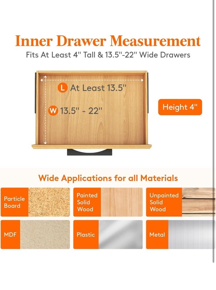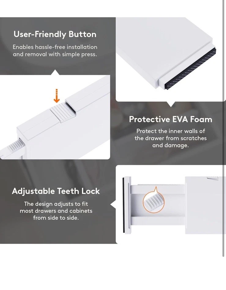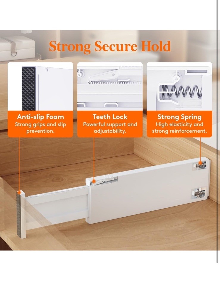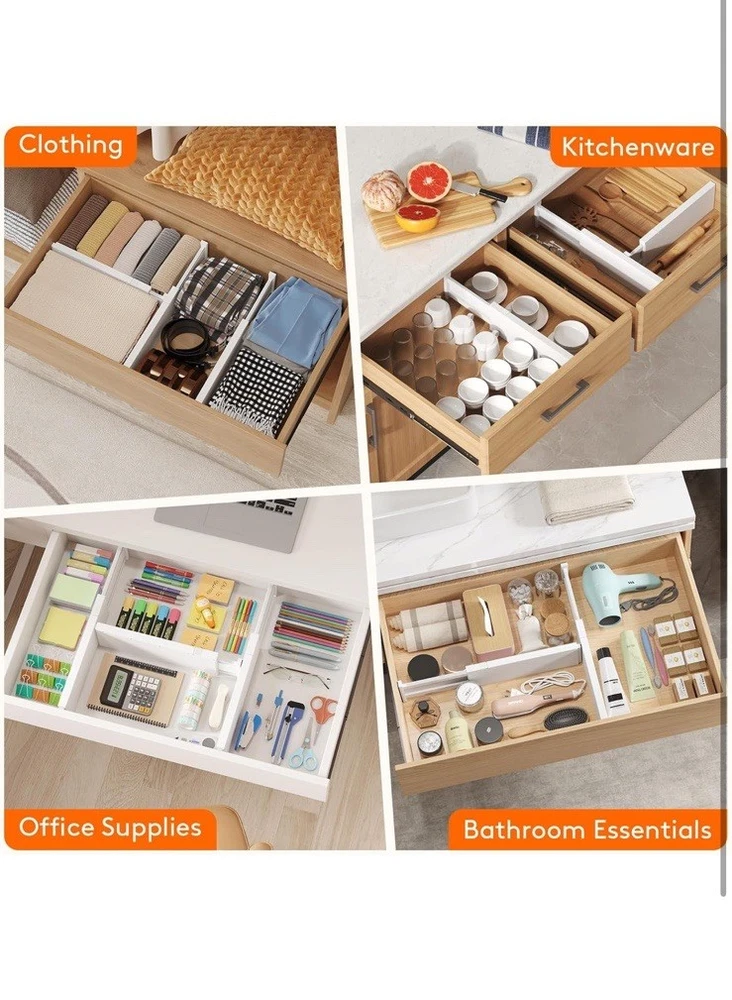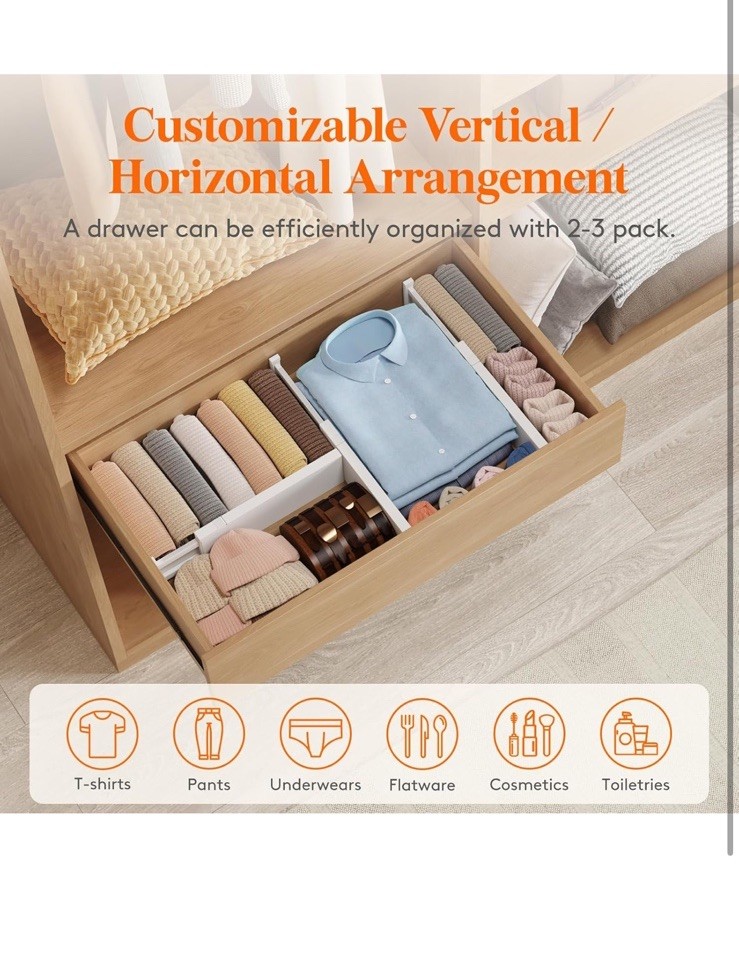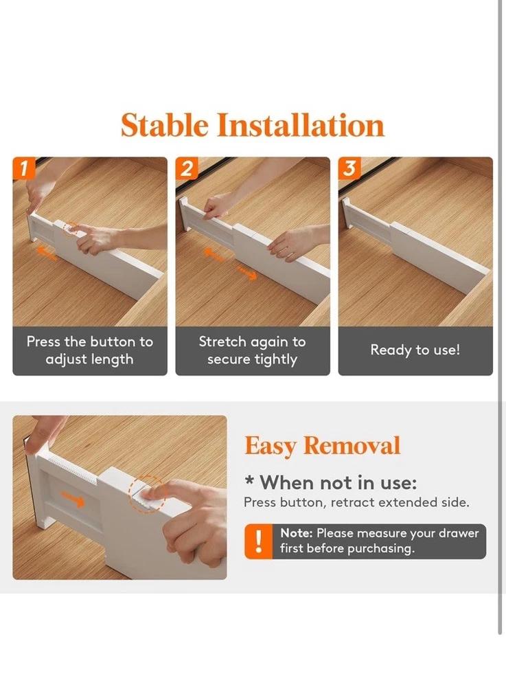 Open box New item! Expandable & Adaptable: With a compact width of 0.8", a height of 4", and an adjustable length ranging from 13.5" to 22", our drawer dividers effortlessly fit into most drawers and cabinets, providing a perfect solution for organizing your items and maintaining tidy drawers consistently. Stable Installation: Simply press the top button to adjust the length before placing it. After placing, secure it tightly by stretching it out again. The strong spring tension ensures that each dresser organizer stays securely upright. To retract, press the button and push in the stretched side. Advanced Design: Our drawer organizer for clothing is made from stable ABS material and has high-quality EVA foam sponges at the ends to prevent scratches and damage to drawer walls, leaving no trace or residue. Additionally, our divider is patented (Patent No: US12133593B2) for a unique experience. Versatile: These drawer organizers can be installed in any drawer of your house or office, and specifically designed to organize clothing, kitchen utensils, office supplies, cosmetics, bathroom essentials, and more. Ensuring your belongings stay neatly organized and easily accessible. Custom-fit Placement: Our versatile drawer dividers offered in sets of 5, 8, and 12, and can be positioned in either a vertical or horizontal orientation, ensuring a perfect fit for your organizing requirements. This flexibility enables you to select the ideal quantity for your needs.
