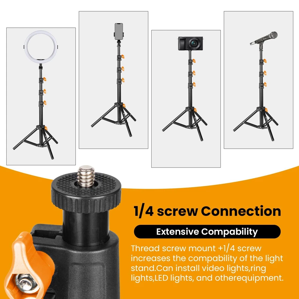 light stand tripod cell tripod photography arm iphone mount heavy duty boom stand stick mobile stand travel lightweight tripod portable Lightweight and Portable: Weighing only 1.08lb and folding down to a compact 15 inches, the lightweight light stand is effortless to carry and set up, making it perfect for on-the-go shooting and quick lighting adjustments. Robust Load Capacity: With a high load capacity of 22lb, the iron legs of the portable light stand are engineered with a sturdy support structure, allowing for versatile angle adjustments and reliable stability even when handling heavy equipment. Adjustable Height: This adjustable light stand can expand from 15 to 51.2 inches with 4 telescopic sections, easily lock the desired height using the knob for secure adjustments. The bottom knob structure ensures a firm and stable setup, catering to various shooting scenarios, especially ideal for outdoor use, travel, live stream and video recording. Universal 1/4 Interface: Versatile Compatibility: Equipped with a standard 1/4-inch interface, our light stand tripod is universally with a wide range of devices, including ring lights, mounts, cameras, reflectors, and more. Versatile and Portable Solution: The perfect balance of lightweight design, sturdy construction, and easy height adjustment makes this compact light stand an indispensable tool for content creators, photographers, vloggers, and anyone in need of reliable and portable lighting stand support.