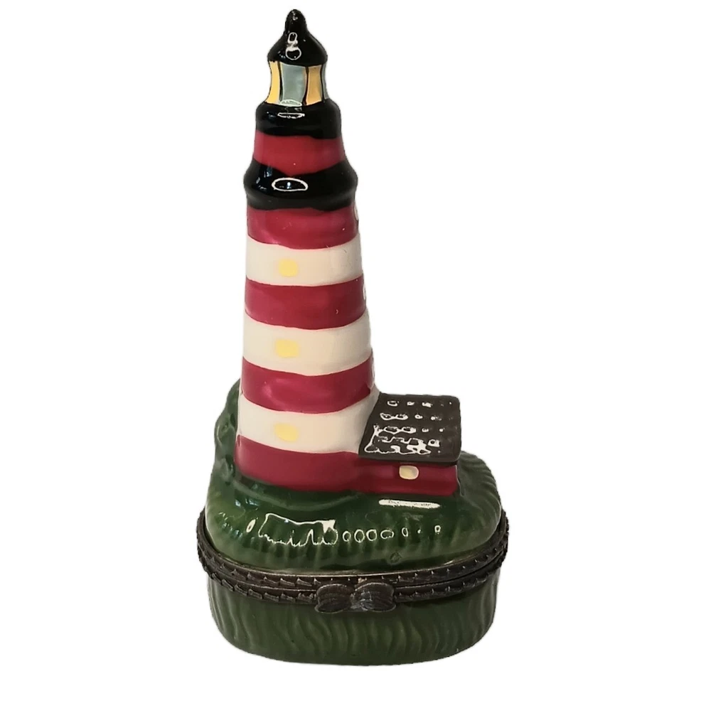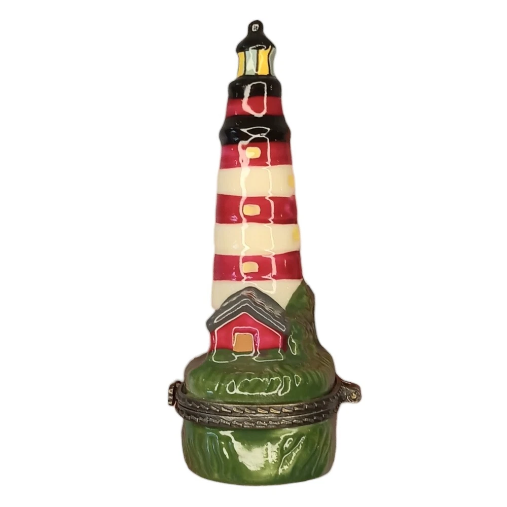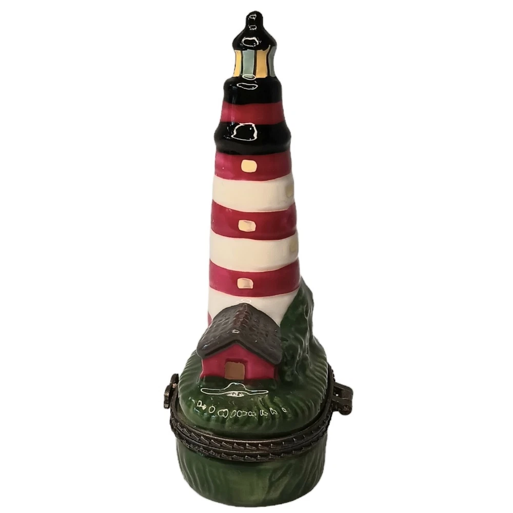 Vintage Porcelain Hinged Lighthouse Trinket Box Red, White and Green Approximately 3.5" x 1.5" x 1" Weighs approximately 1.5 ounces Excellent condition