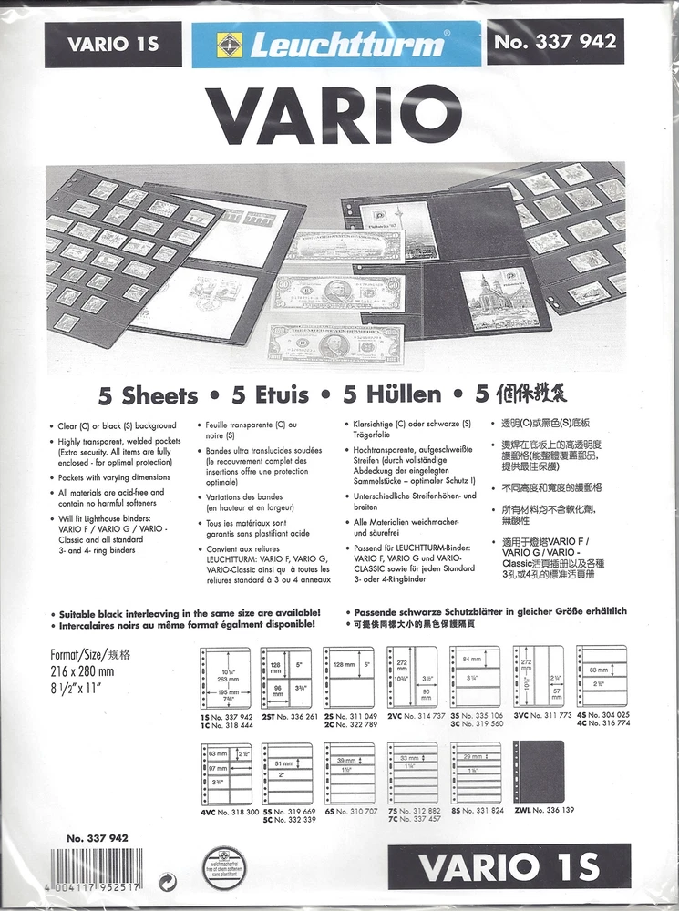 Product Description Lighthouse VARIO Sheets: V1S - 1 large pocket for mint sheets or large covers (Pack of 5 BLACK Sheets). VARIO Black pages are made of hard PVC and are 100% acid- and chemical softener-free. VARIO Sheets are punched to fit most 3-ring or 4-ring binders. 100% acid- and chemical softener-free.