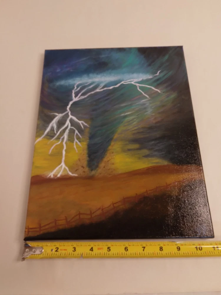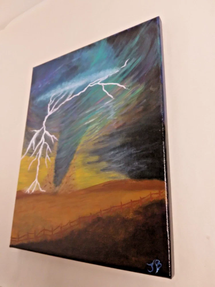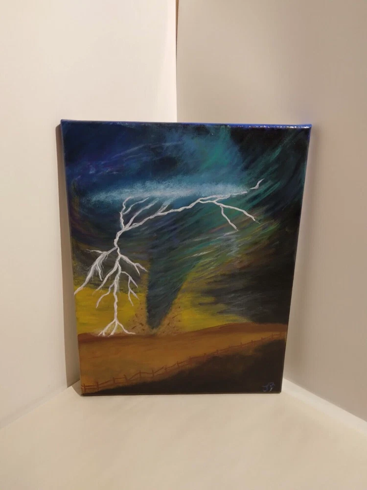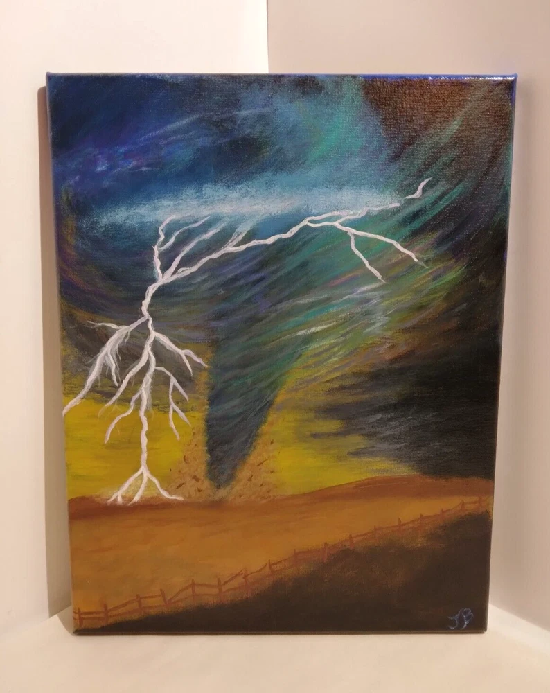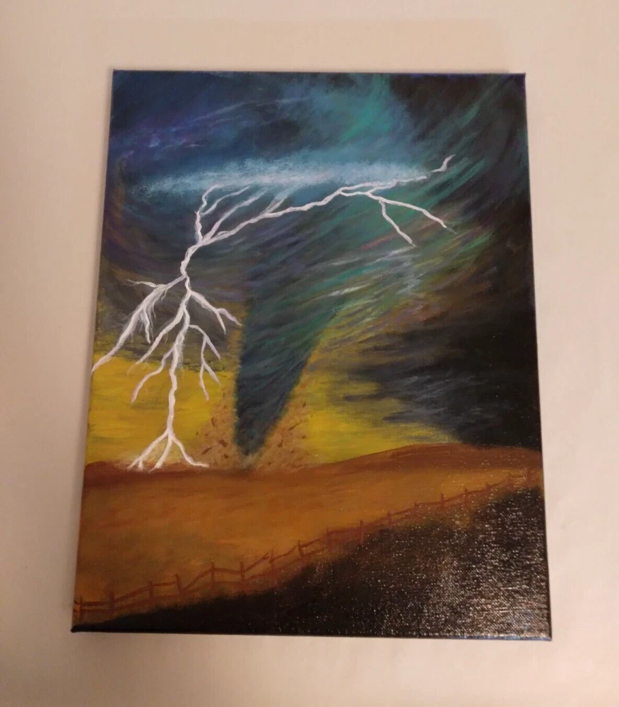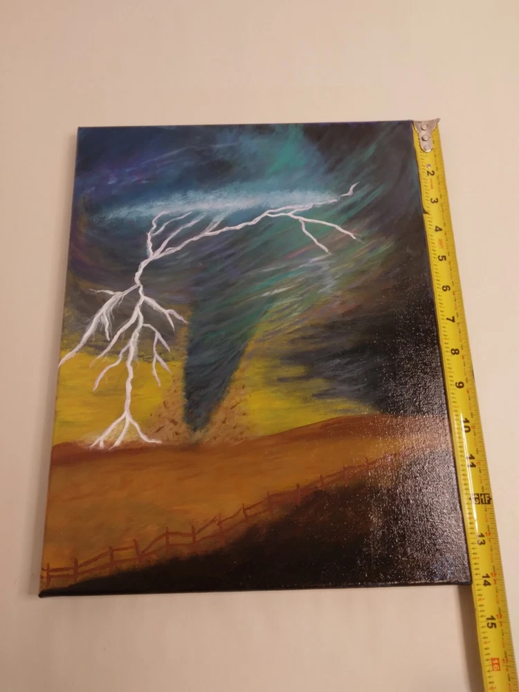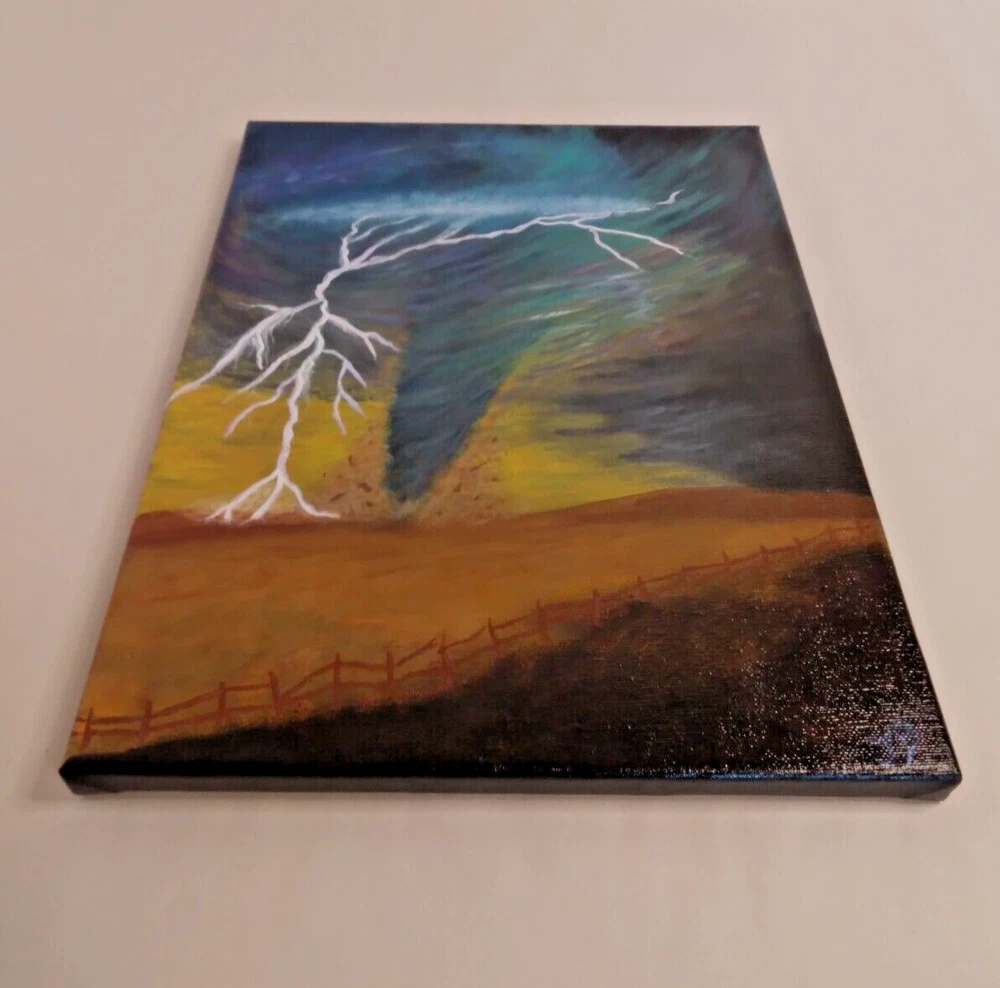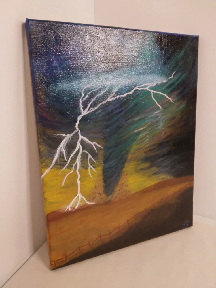 "Lightning Tornado” 11"x 14" Original Acrylic Painting on Framed Stretched Canvas with a beautiful tornado scene. I am the artist of this painting, it was painted in 2024 and I signed it, it was finished with a light glossy varnish. See photos for details and measurements. Fast shipping and carefully packed!