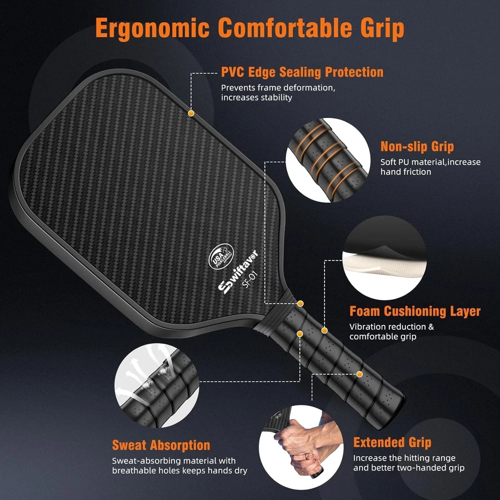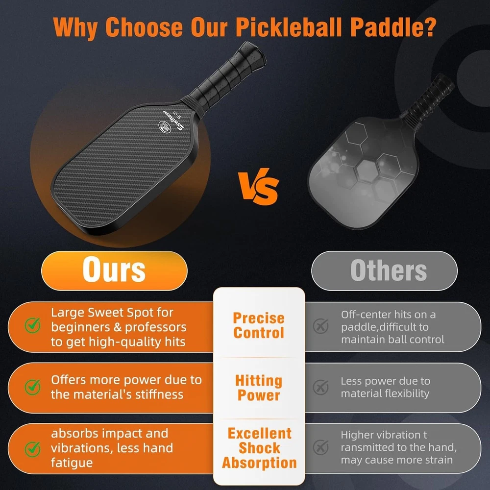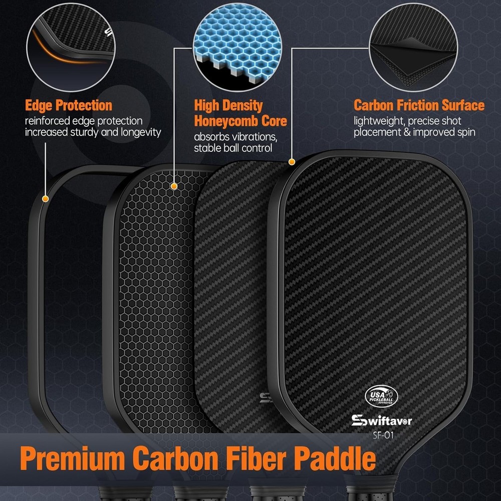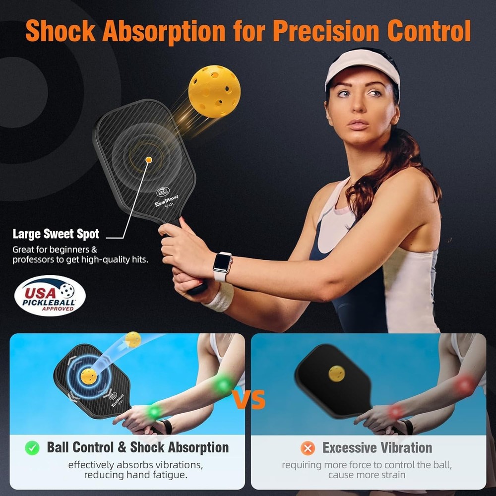 This paddle is an absolute game-changer! The carbon fiber surface gives it fantastic control and power, while the lightweight design keeps it easy to maneuver. The shock absorption is great—no more sore wrists after long matches. The large sweet spot makes it forgiving for beginners yet precise enough for advanced players. Plus, the reinforced edges really hold up against rough play. Super comfortable grip too. Highly recommend for anyone serious about pickleball!