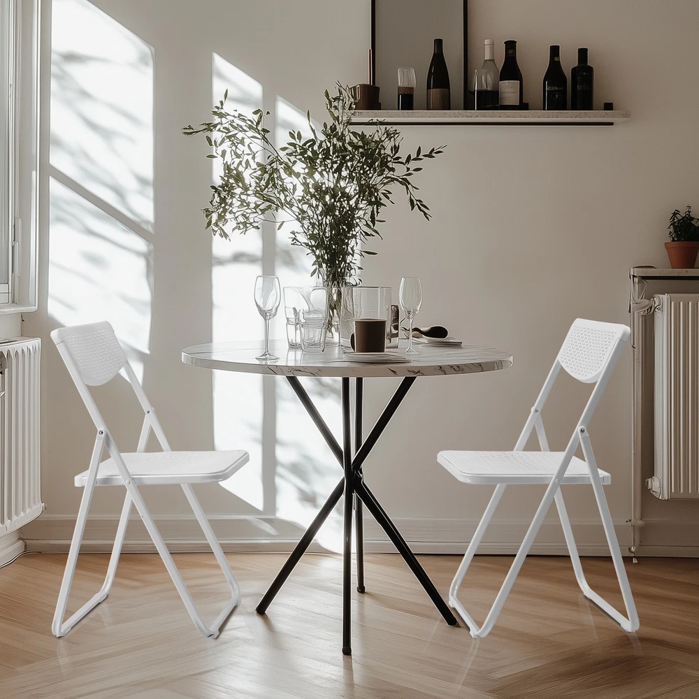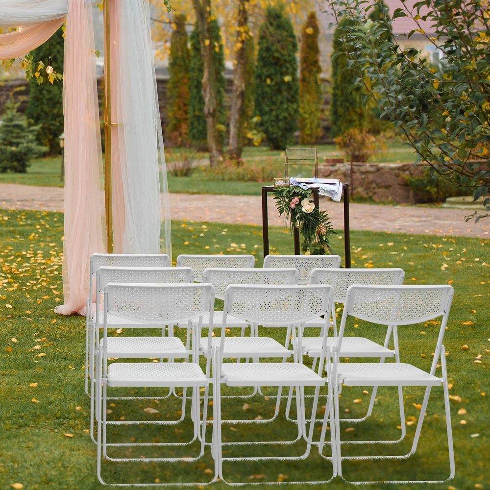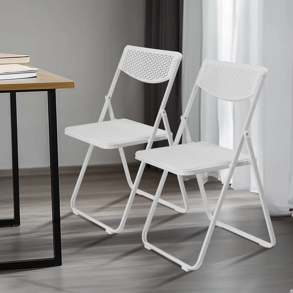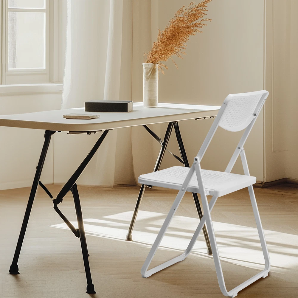 Introductions: Upgrade your seating solutions with our Plastic Folding Chairs. Designed for both comfort and convenience, these lightweight and stackable chairs are perfect for a variety of events, both indoors and outdoors. Featuring an ergonomic mesh seat and backrest, these chairs ensure maximum comfort for your guests. The folding design allows for easy storage and transport, making them an ideal choice for family gatherings, parties, weddings, and more. Features: 1. Exceptional Comfort: Each chair is equipped with a breathable mesh seat and backrest, providing maximum comfort and support for extended periods. The ergonomic design ensures your guests stay comfortable throughout any event. 2. Effortless Storage and Transport: The folding design allows the chair to open and close in seconds, making storage and transportation a breeze. Whether you're hosting a family gathering, going camping, or planning a celebration, these lightweight chairs are easy to carry and store. 3. Weather-Resistant Durability: Constructed from waterproof and moisture-proof resin material, these chairs offer-lasting use both indoors and outdoors. 4. Robust Triangular Structure: Engineered to meet the needs of different body shapes, these chairs provide outstanding stability and each chair supports up to 280 lbs. 5. Versatile and Stylish Design: With a simplistic modern appearance, these chairs enhance any setting. Perfect for decorating your garden, embellishing your balcony, or adding elegance to indoor and outdoor events like weddings and church functions. Specifications: 1. Material: PP, Iron 2. Color: White 3. Total Net Weight: 29.5 lbs / 13.4 kg 4. Single Chair Dimensions: (19.1 x 18.9 x 32.5) in / (48.5 x 48.0 x 82.5) cm Package Includes: 4 x Folding Chairs