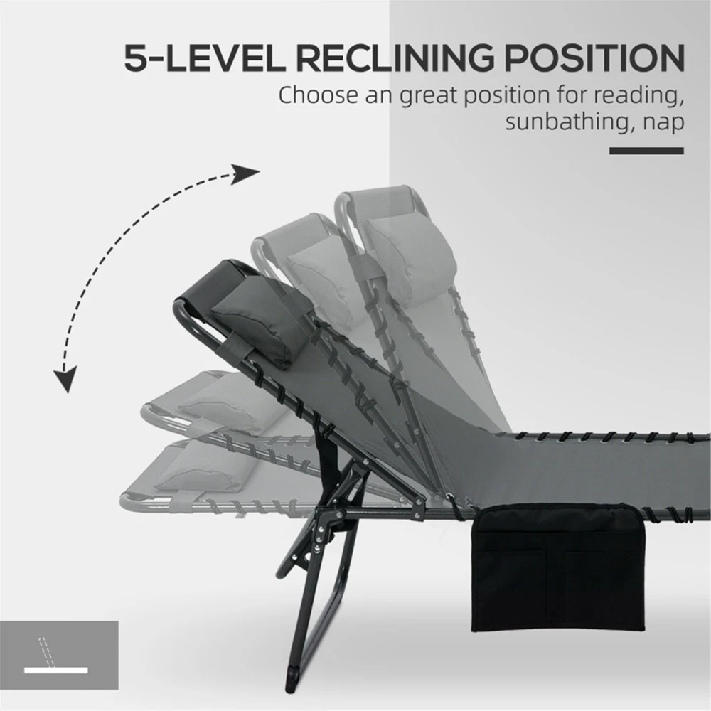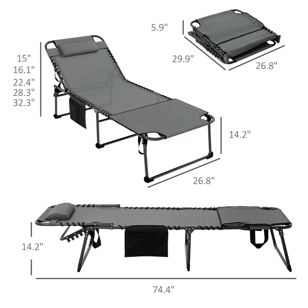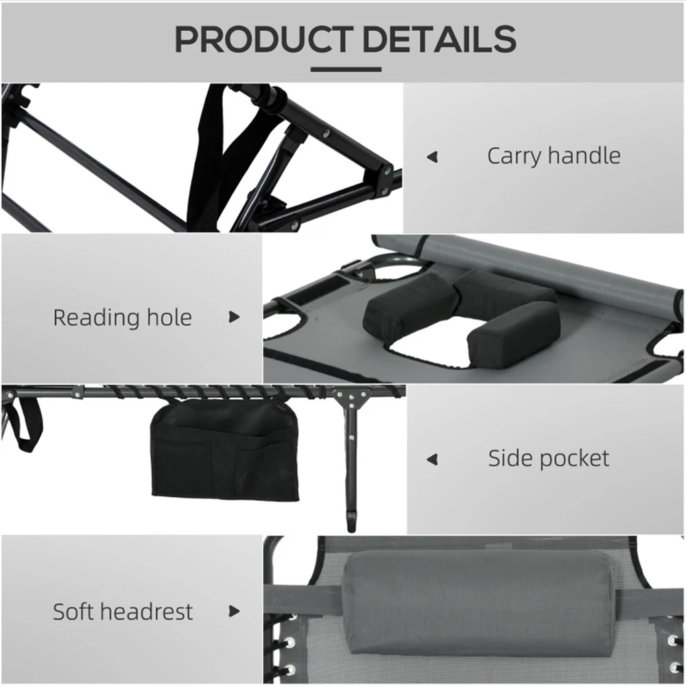 Features: - Lounge around the pool - Back reclines to 5 different positions to find your favorite tanning angle - The reading hole lets you lie face down or cover it when not in use - Load-bearing, water-safe powder-coated steel frame - Foldable design with a handle to make storage and transport easy - Side pocket for keeping your items close at hand - No assembly required Specification: - Color: Black, Gray - Materials: Steel, Mesh Fabric, Polyester - Fully Reclined Dimensions: 26.75" W x 74.5" D x 14.25" H - Folded Dimensions: 30" L x 26.75" W x 6" H - Seat Dimensions: 26.75" W x 51.25" D - Backrest Dimensions: 23.25" L x 26.75" W - Backrest Height to Ground: 15", 16.25", 22.5", 28.25", 32.25" H - Backrest Adjust Angle: 180/160/140/120/100° - Headrest Dimensions: 14.25" L x 6.25" W - Weight Capacity: 264 lbs. Package Includes: - 1 x Sun Lounger - 1 x Manual