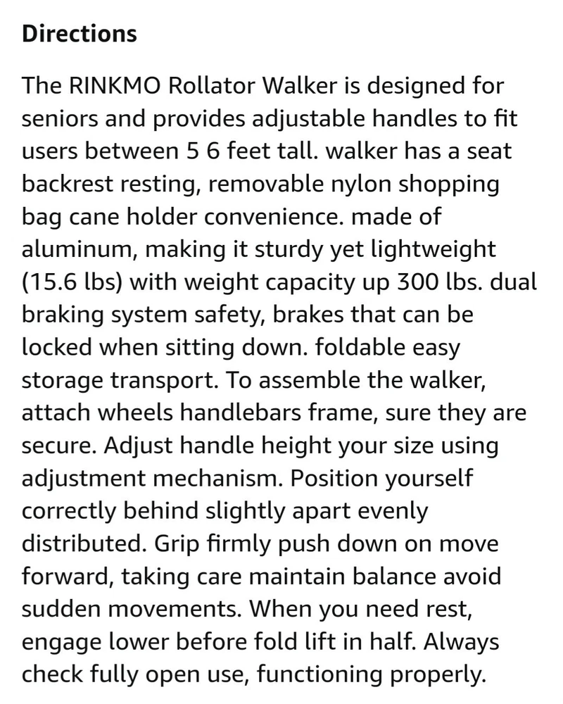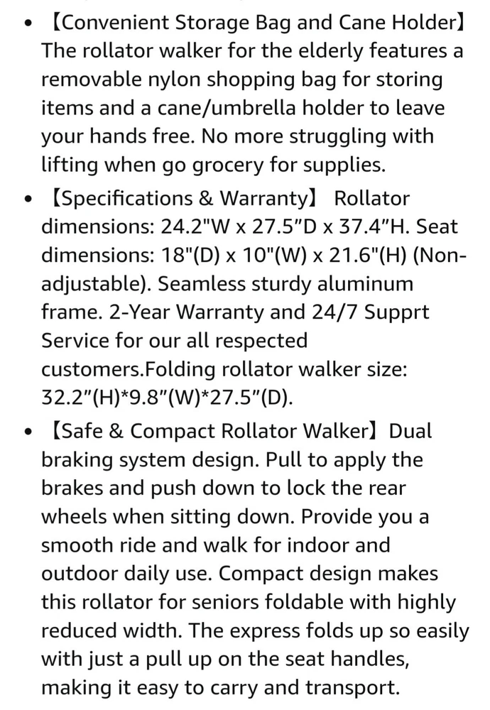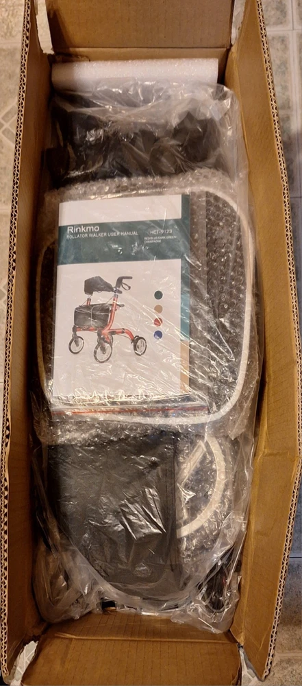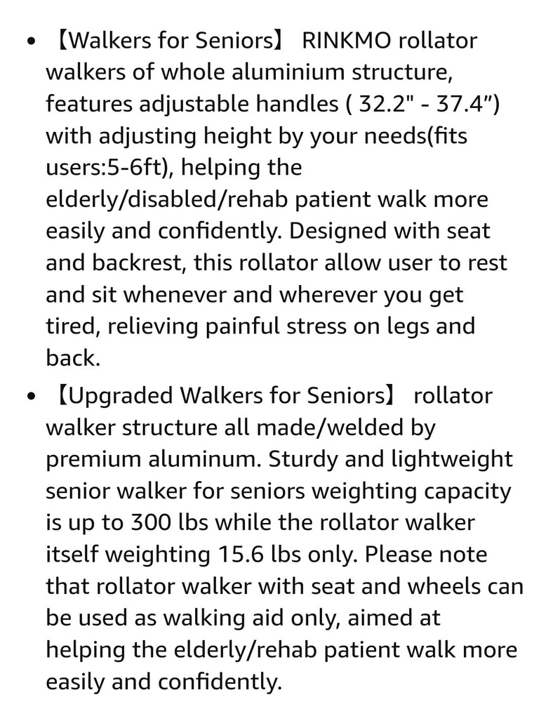 RINKMO ROLLATOR WALKER FOR SENIORS, MOBILITY WALKING AID FOR SENIORS OR ADULTS INCREASES INDEPENDENCE FOR EVERYDAY LIFESTYLE ACTIVITIES AND NEEDS....... THE RINKMO ROLLATOR WALKER IS DESIGNED FOR SENIORS PROVIDES ADJUSTABLE HANDLES TO FIT USERS WHO ARE 5-6 FEET TALL PROVIDING GOOD POSTURE AND COMFORT....... RINKMO DESIGNED WITH A WIDE PADDED SEAT 18"X 10", PADDED BACKREST ALLOWING YOU TO SIT AND REST WHEN EVER YOU GET TIRED, RELIEVING PAINFUL STRESS ON LEGS AND BACK...... RINKMO FRAME STRUCTURE IS MADE AND WELDED FROM PREMIUM WHOLE ALUMINUM, OFFERS STRONG, DURABLE, STABLE, SAFE BODY FRAME FOR USER WON'T TIP OVER...... COMPACT GREAT FOR TRAVEL, EASY FOLDING DESIGN, LIGHTWEIGHT WEIGHS ONLY 15.6 LBS, BUT STRONG HEAVY DUTY BUILT SUPPORT’S 300LBS....... DUAL BRAKING SYSTEM: DUAL BRAKING SYSTEM DESIGN, PULL TO APPLY THE BRAKES AND PUSH DOWN TO LOCK THE REAR WHEELS WHEN SITTING DOWN.... PROVIDES YOU A SMOOTH RIDE INDOORS AND OUTDOORS WITH IT'S 8" TPU WHEELS, EASY MANEUVERING THROUGH ALL OBSTACLES AND SURFACES........ CONVENIENT STORAGE BAG AND CANE/UMBRELLA HOLDER FOR SENIORS: The RINKMO ROLLATOR WALKER FOR SENIORS FEATURES A REMOVABLE NYLON SHOPPING BAG FOR YOUR PERSONAL ITEMS AND A CANE/UMBRELLA HOLDER TO LEAVE YOUR HANDS FREE...... THE RINKMO ROLLATOR WALKER AIMS AT HELPING THE ELDERLY/REHAB PATIENTS WALK MORE EASILY AND CONFIDENTLY..... THE RINKMO ROLLATOR WALKER FOR SENIORS HAS A HIGH POSITIVE STAR RATING PERFORMANCE FROM TRUSTED CUSTOMER'S WORLDWIDE...... BRAND NEW-RED- I OPENED THE BOX TO PROVIDE A PICTURE OF THE ROLLATOR WALKER......