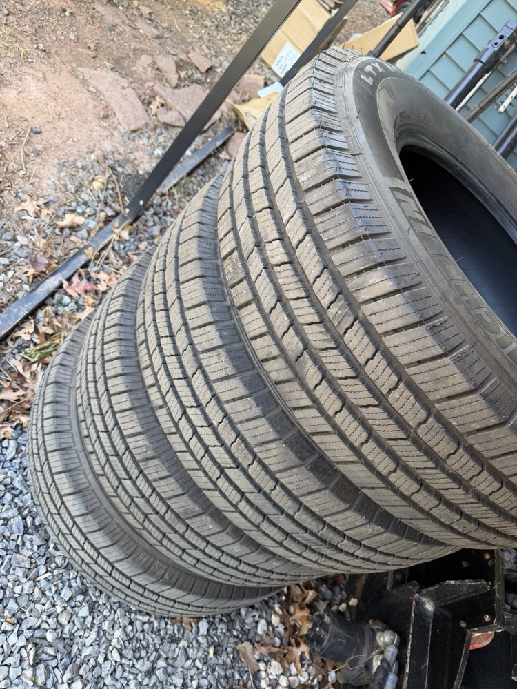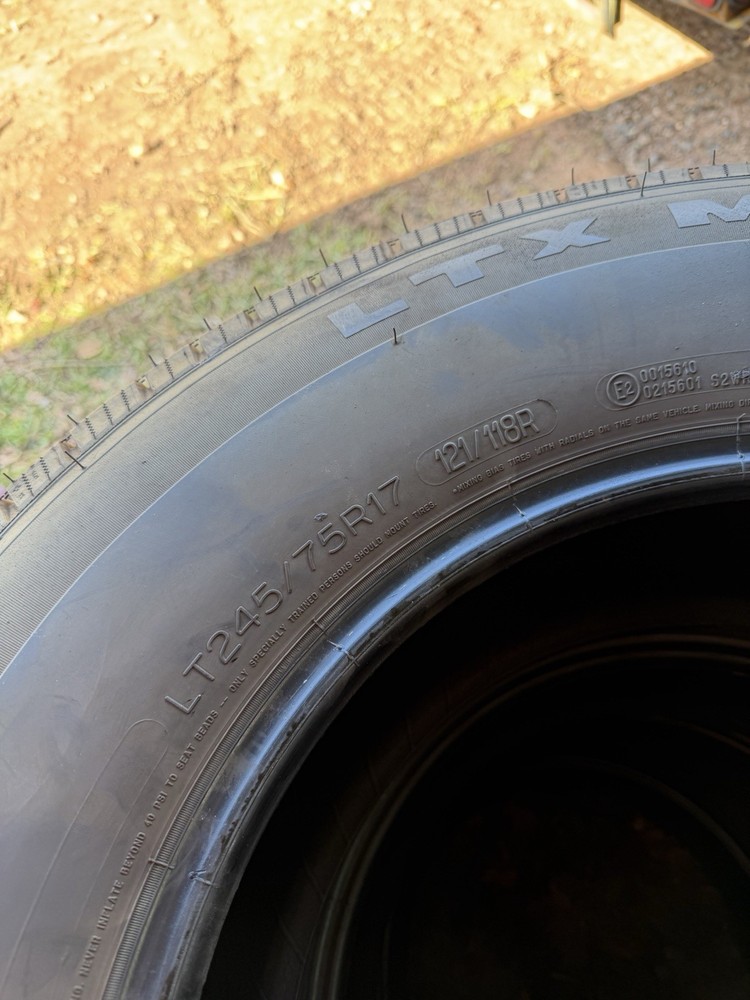 The product is a set of four like-new Michelin LTX MS2 all-terrain tires with a size of 245/75/R17. These tires have a tread depth of 10/32 inches and a load range of E. With a load index of 121 and a speed index of S, they are designed for vehicles that require a durable and reliable all-terrain tire. The black sidewall feature adds a stylish touch to the tires, making them both functional and aesthetically pleasing for your vehicle.