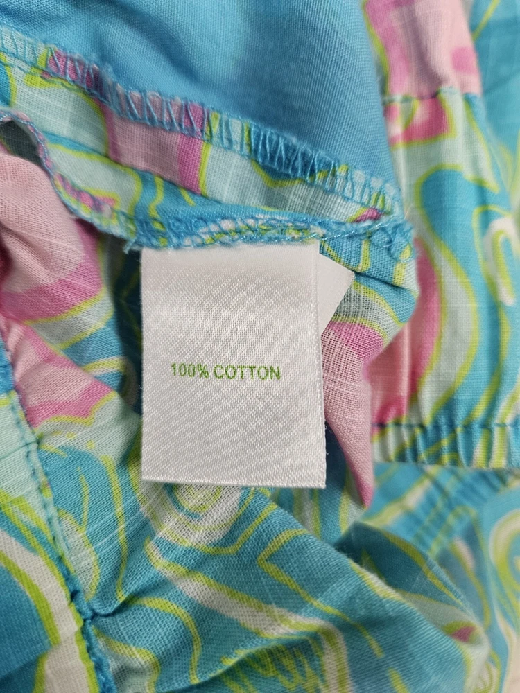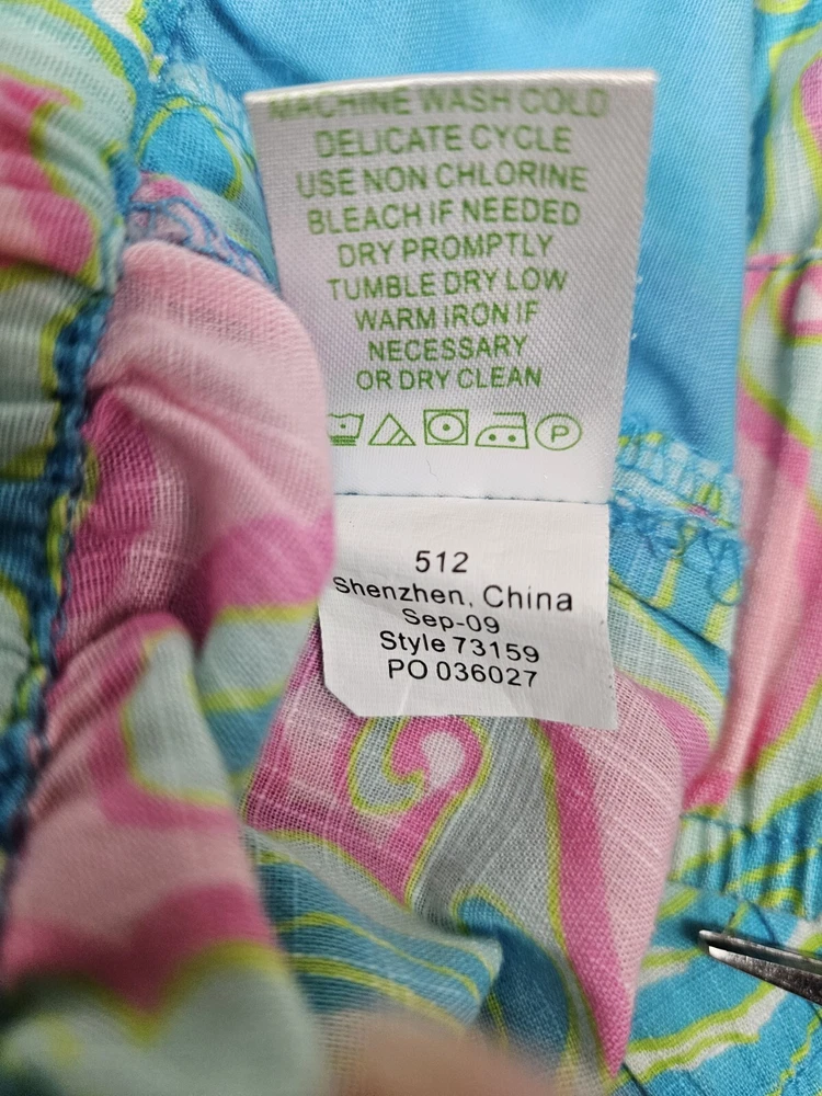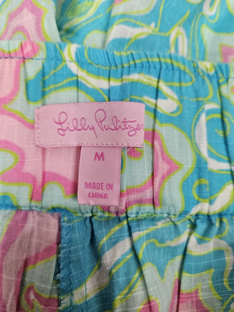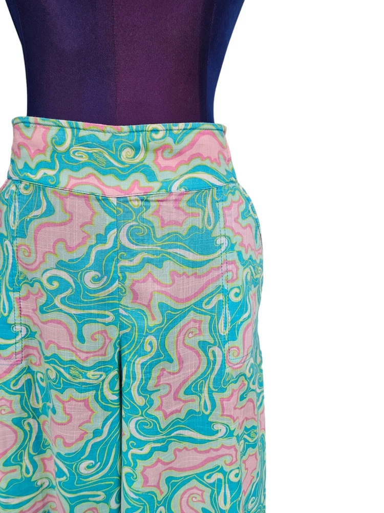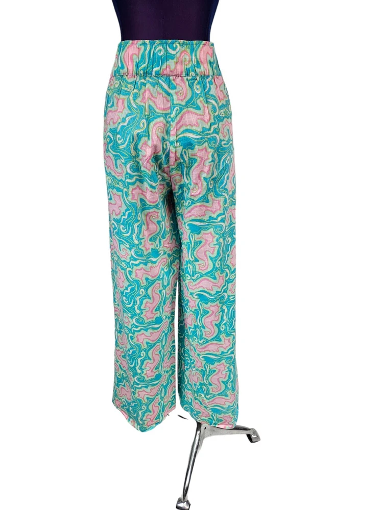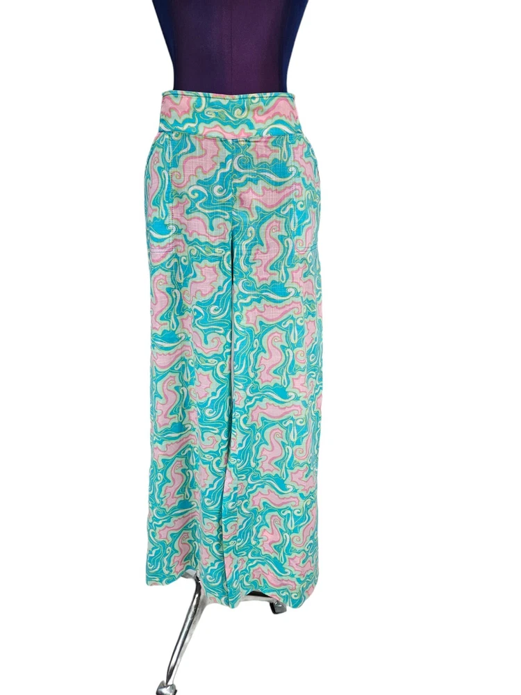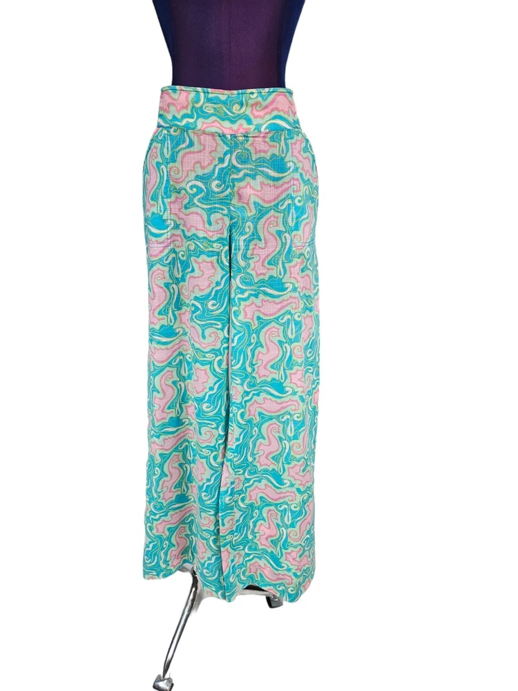 Lilly Pulitzer Resortwear Wide Leg Palazzo Pants Seahorse Print Size Medium K61 In excellent condition Lilly Pulitzer Resortwear Wide Leg Palazzo Pants Seahorse Print Size Medium Women's. Features classic bold and colorful Lilly Pulitzer linen-like wide leg palazzo pants in a fun resortwear print, teal with pink seahorses and neon green with hidden Lilly signature in pants, back elastic waistband, 2 front patch pockets, mid to high rise, wide leg, flowy and breathable, sorority style, resort vibes, Caribbean feel. Perfect comfy pants to dress up or down! Measurements laying flat waist 15.5" unstretched front rise 10.5" hips 20.5" inseam 30" leg opening 12.5" Fabric 100% cotton This is a pre-owned item that may show signs of wear. In excellent condition, no flaws.