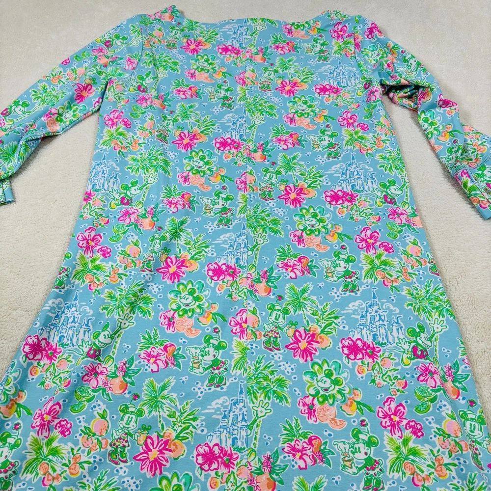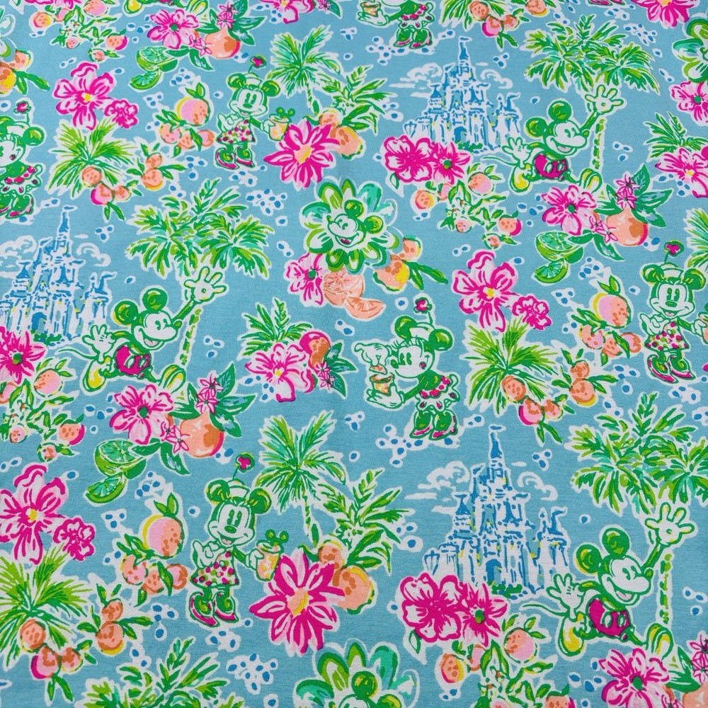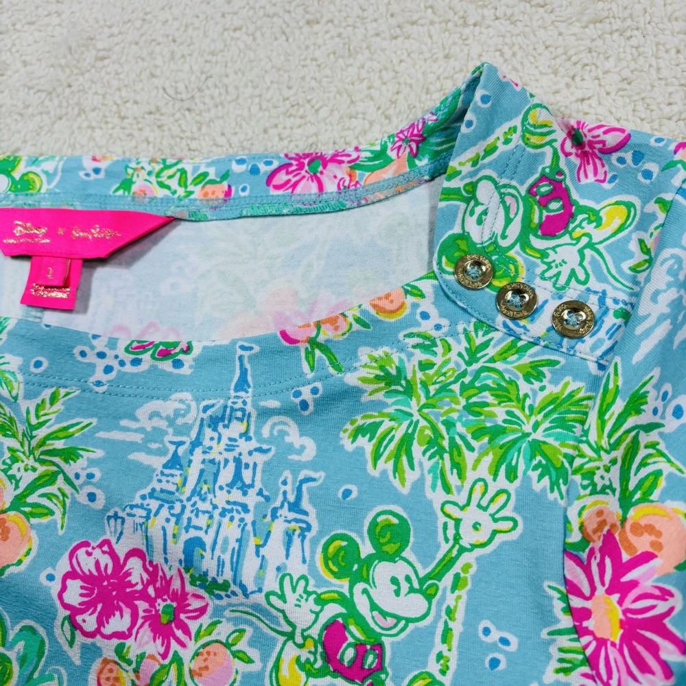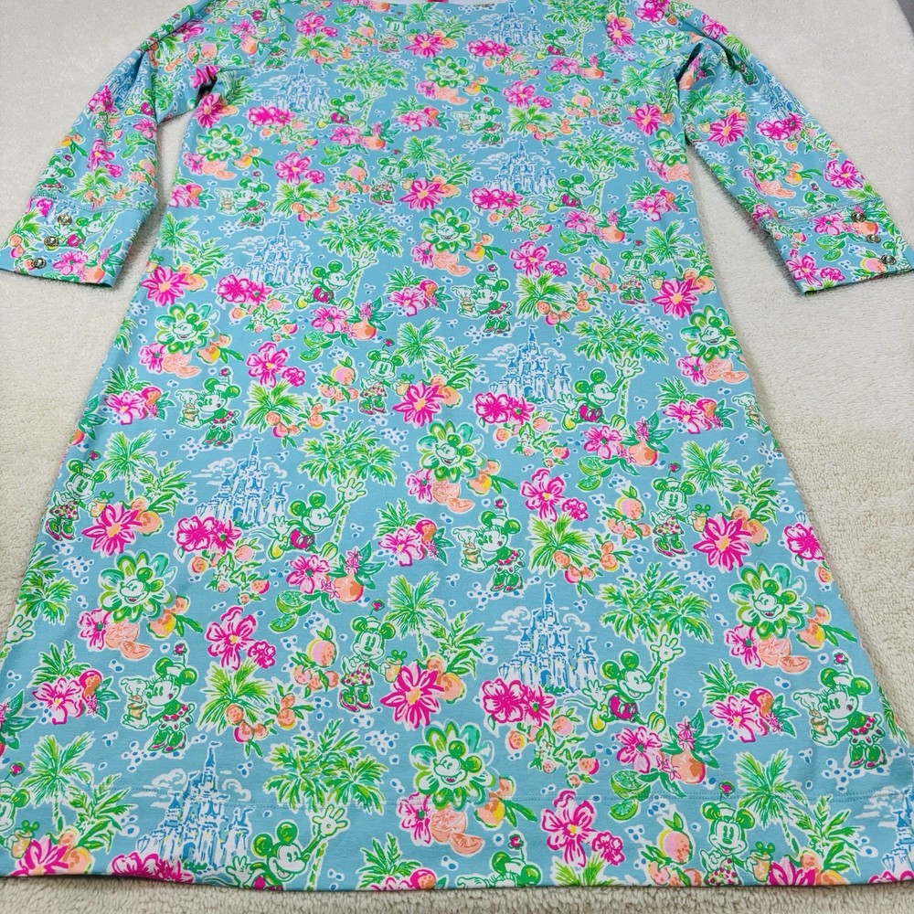 The Lilly Pulitzer X Disney Parks Mickey Minnie Castle Sophie Dress in size Large is a stylish and lightweight swing dress perfect for various occasions. Made from a knit fabric blend of spandex and 100% cotton, this knee-length dress features a boat neckline, pullover closure, and 3/4 sleeves. The dress showcases a beautiful floral pattern with accents of Mickey and Minnie Mouse characters, making it a fun and tropical addition to your wardrobe. Machine washable and suitable for summer, fall, and spring, this dress is a must-have for any Disney or Lilly Pulitzer fan.