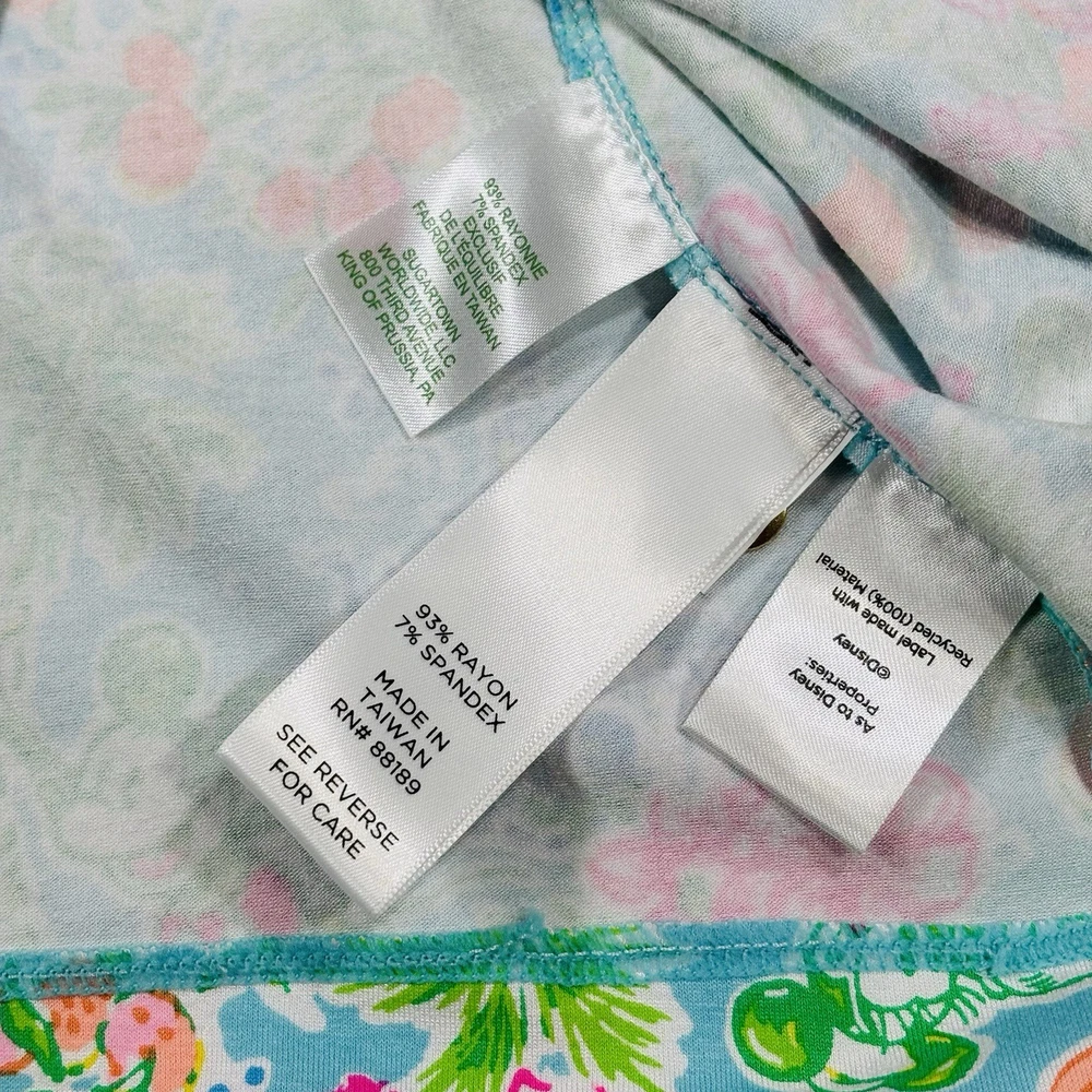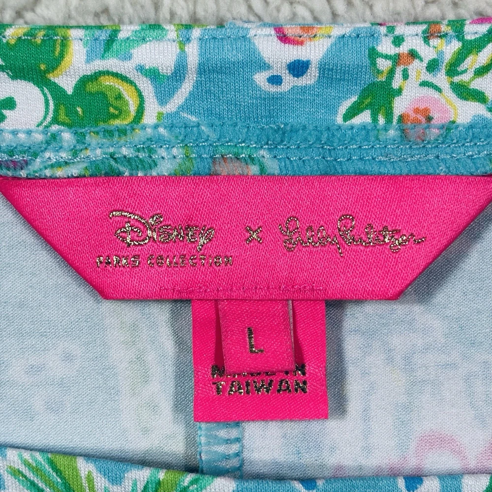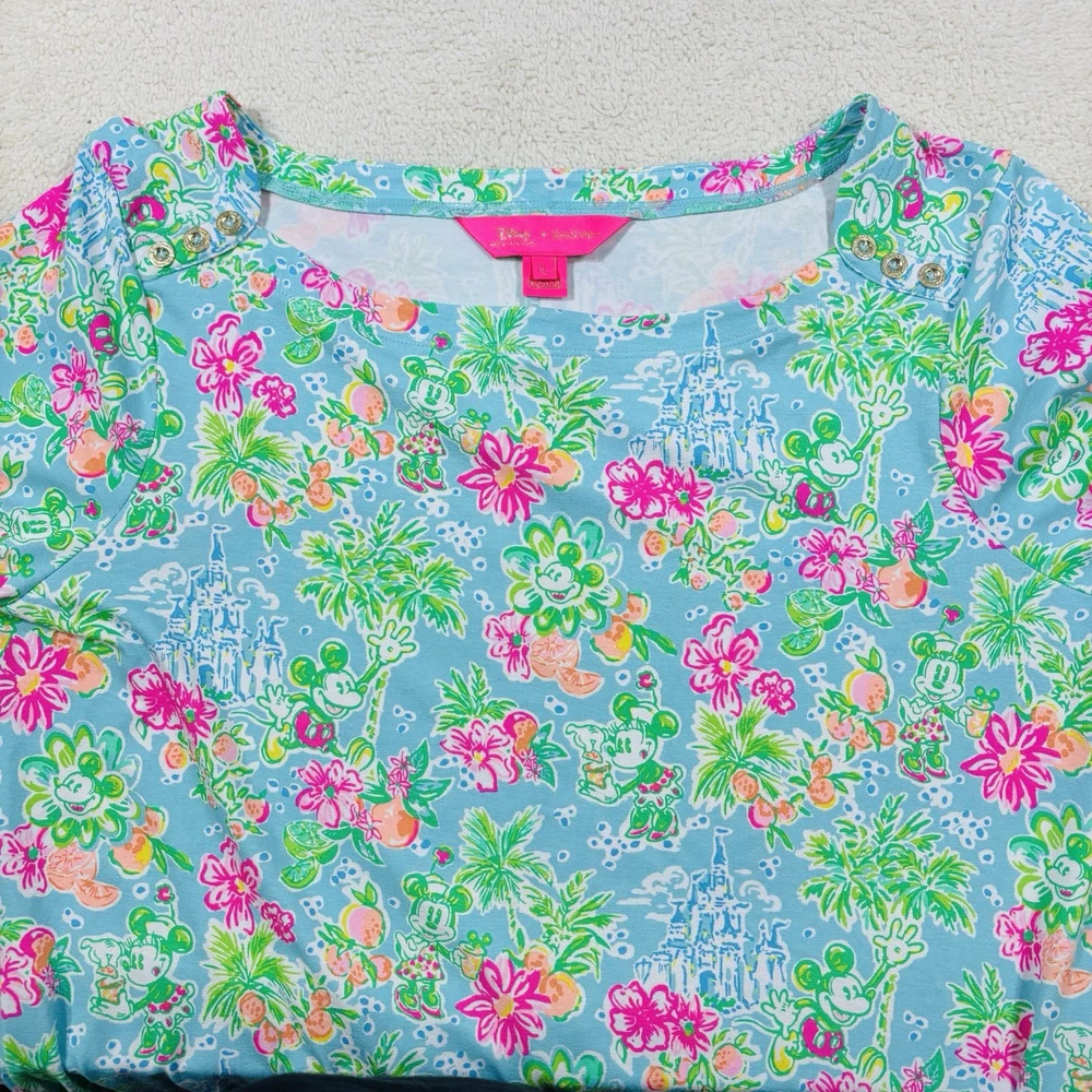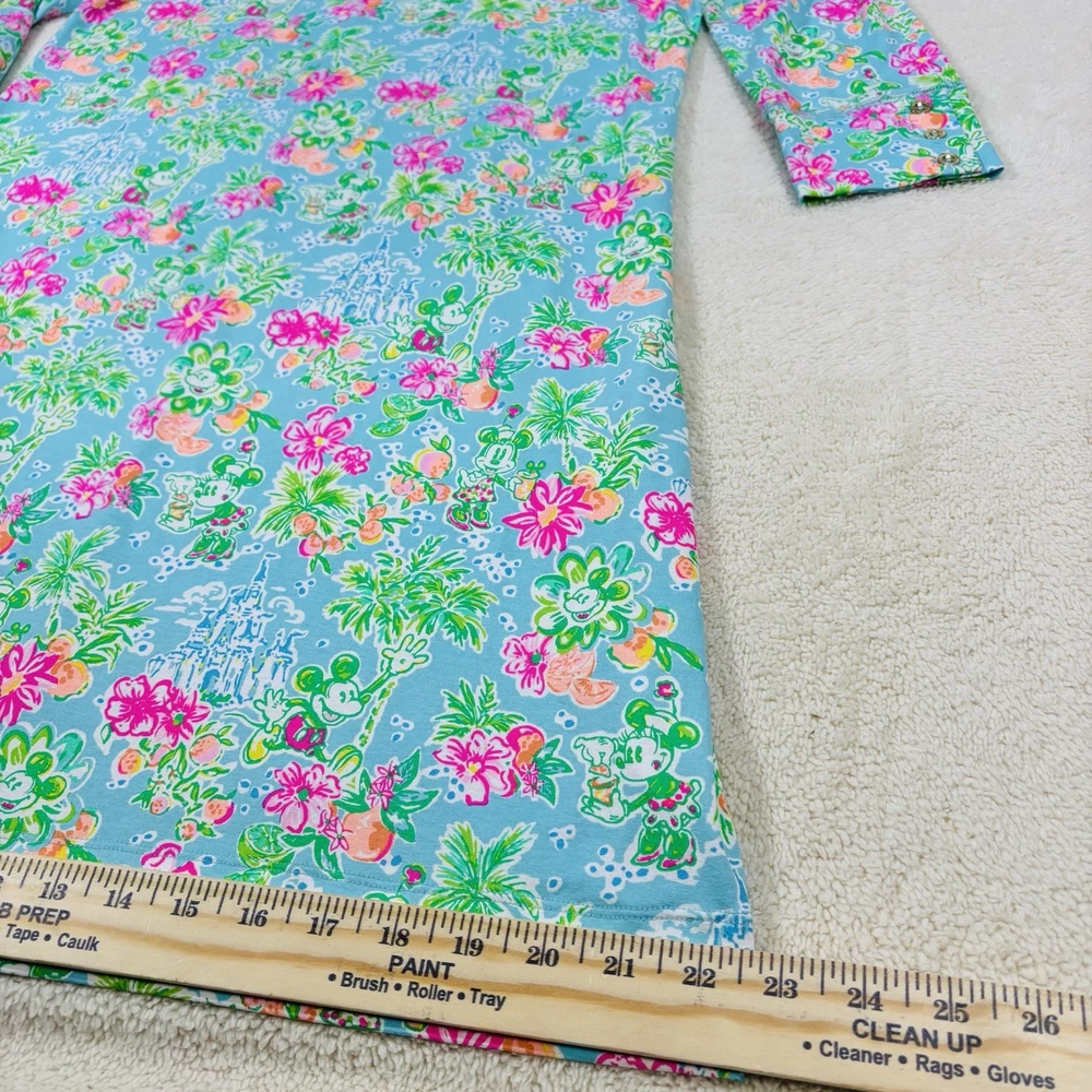 The Lilly Pulitzer X Disney Parks Mickey Minnie Castle Sophie Dress in size Large is a stylish and lightweight swing dress perfect for various occasions. Made from a knit fabric blend of spandex and 100% cotton, this knee-length dress features a boat neckline, pullover closure, and 3/4 sleeves. The dress showcases a beautiful floral pattern with accents of Mickey and Minnie Mouse characters, making it a fun and tropical addition to your wardrobe. Machine washable and suitable for summer, fall, and spring, this dress is a must-have for any Disney or Lilly Pulitzer fan.