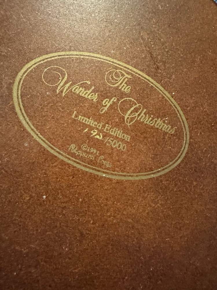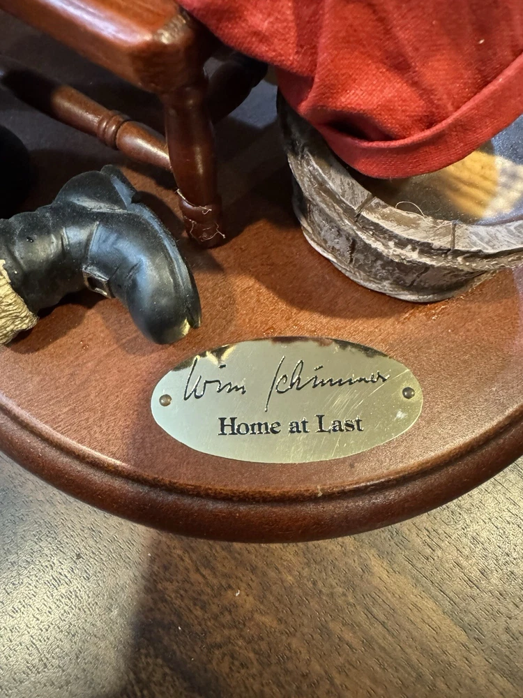 Potpourri Press Christmas Traditions Home At Last is a vintage Fabric Mache Santa depicting a festive scene. Manufactured in Taiwan in 1991, this holiday collectible features a mix of red, white, green, brown, and black colors, celebrating the Christmas occasion.