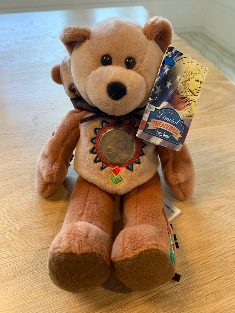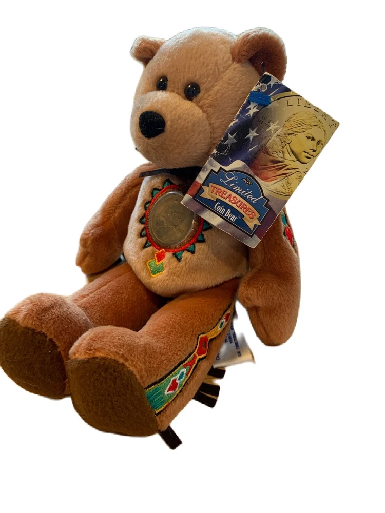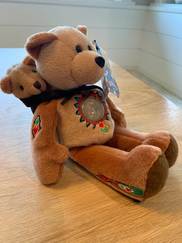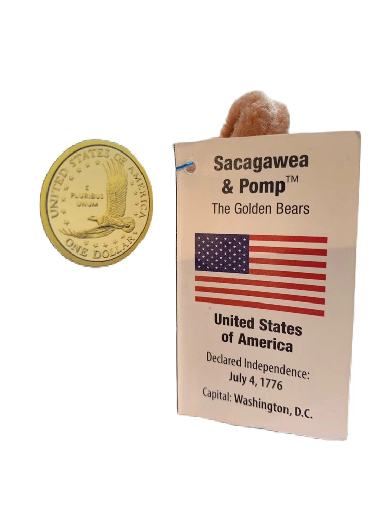 This Limited Treasures Sacagawea & Pomp The Golden 2000 Liberty Coin Bear is a must-have for collectors and children alike. With its soft and cuddly exterior, this stuffed animal is perfect for playtime or display. Made in China and recommended for ages 3 and above, this bear features a special edition gold coin commemorating the year 2000. Add this unique piece to your collection or gift it to someone special. Celebrate American history with the iconic image of Sacagawea and her son, Pomp, on this adorable plush toy. Don't miss out on the opportunity to own a piece of history with this Limited Treasures creation.