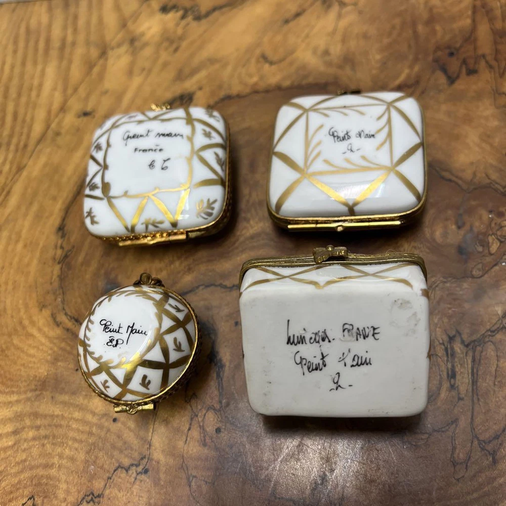 Limoges Pill Case 4-Piece Accessory Set Hand Painted Features Specifications Limoges Pill Case 4-Piece Accessory Set This exquisite vintage Limoges pill case accessory set features a charming hand-painted design. Each piece showcases delicate floral patterns on a white base, adding a touch of elegance to your collection. Features: 4-piece set Hand-painted with small flowers Decorative patterns inside the lids Gold trim accents Beautiful clasp design Condition: This Limoges box is in good condition for its age, with no notable damages such as cracks or chips. However, please note that it has been used over the years, and minor stains, scratches, or blemishes may be present. It is recommended for buyers who appreciate antiques. Rare Find: This set is a rare collectible, perfect for enthusiasts of vintage Limoges items. Item Title Limoges Pill Case 4-Piece Accessory Set Hand Painted Description Messages Thanks for taking a look at my products. We are located in Japan, and we hope you will consider them. We also sell a variety of other products, and we hope you will considerpurchasing them as well. You can also save on shipping costs by purchasing multiple items. If so, please let us know about it. If you are looking for a particular item that is not in my listing, pleasedo not hesitate to contact us. We will look it for you. Contact us International Buyers -Import duties, taxes, and charges are not included in the item price orshipping cost.These charges are the buyer's responsibility. -Please check with your country's customs office to determine what theseadditional costs will be prior to bidding or buying. -These charges are normally collected by the delivering freight (shipping)company or when you pick the item up-do not confuse them for additionalshipping charges. -We do not mark merchandise values ??below value or mark items as “gifts”-USand International government regulations prohibit such behavior. payment We accept PayPal,Payoneer and other payments. Shipping Our shipping methods is mainly using FedEx. Shipping is generally done within 5-10 days or shorter. The tracking number will be sent to you as soon as it is issued. We strictly adhere to handling time in our shipping process. Copyright 2020 Trans solutions at ebay All rights reserved.