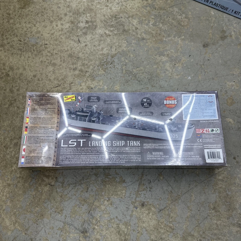 The Lindbergh Line LST Landing Ship in 1:245 scale is a detailed plastic model kit that depicts a WWII D-Day LST. This unassembled kit comes factory sealed and includes a tank set, perfect for intermediate skill level enthusiasts aged 17 years and up. The gray-colored model features a realistic design of the Lindbergh HL213 ship, making it a valuable addition to any militaria collection. Made in the United States by Lindberg, this model is a must-have for hobbyists interested in historical naval vessels.
