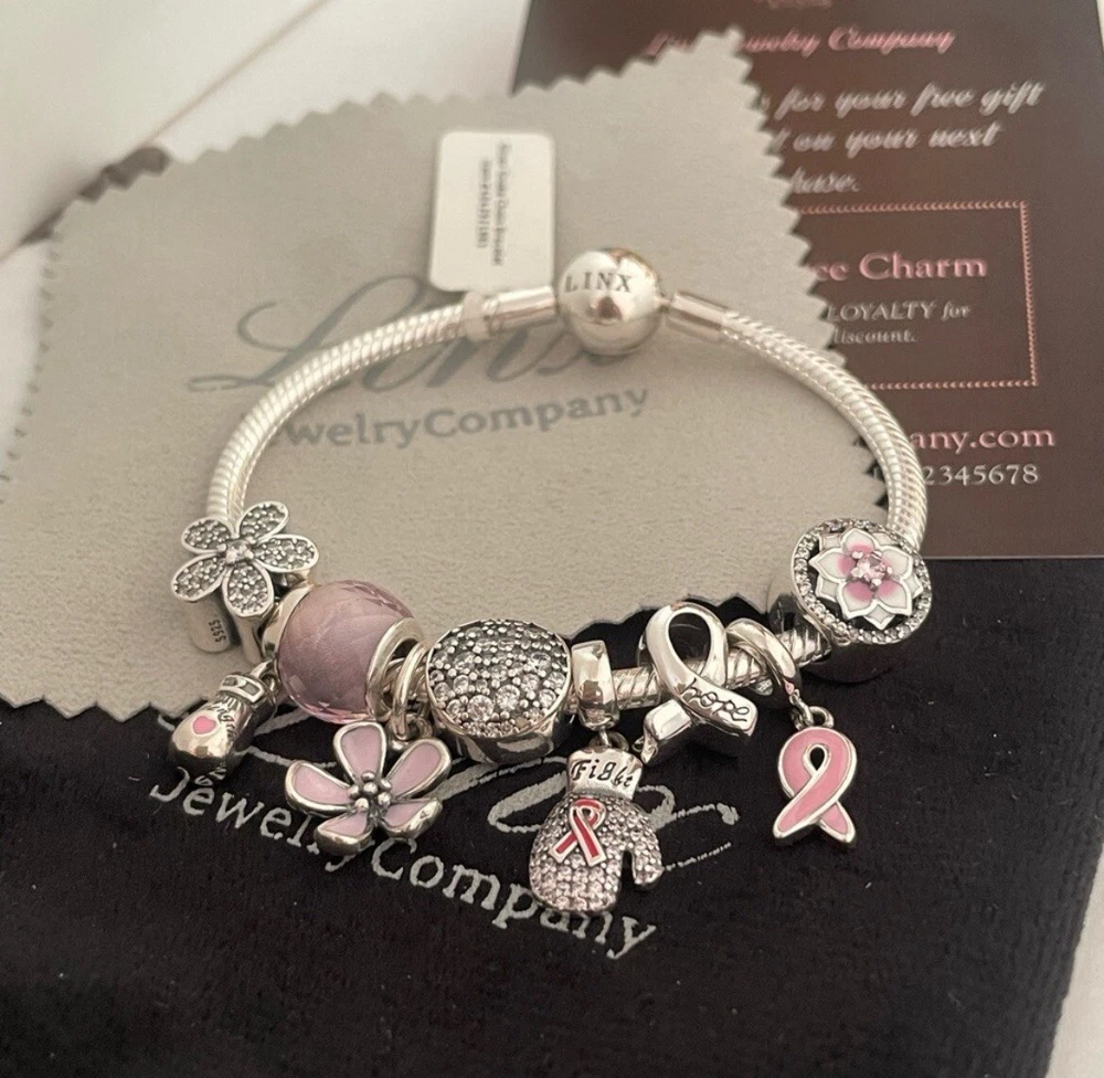 Linx snake chain style charm bracelet in 925 sterling silver, with a ball clasp, featuring the signature Linx logo. This beautiful bracelet features 9 Linx charms also in 925 Sterling silver. Size 7.5 Bracelet is also available in sizes 6.3 (toddler size), 6.7, 7.1, 7.9, and 8.3. Should you require one of these sizes, please message us prior to purchasing and we will create a listing for you in your requested size. Please remember to add an additional inch to the measurement of your wrist in order to allow room for your charms, as the charms will cause the bracelet to fit a bit tighter. Bracelet is new with tags and will also come with the original Linx velvet jewelry pouch, and Linx sterling silver polishing cloth.
