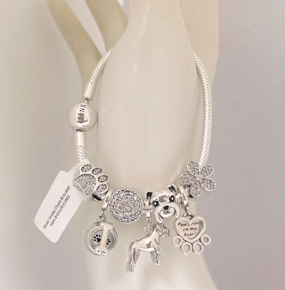 Linx snake chain style charm bracelet in 925 sterling silver, with a ball clasp, featuring the signature Linx logo. This beautiful bracelet features 7 Linx charms also in 925 Sterling silver. Size 7.5 Bracelet is also available in sizes 6.3 (toddler size), 6.7, 7.1, 7.9, and 8.3. Should you require one of these sizes, please message us prior to purchasing and we will create a listing for you in your requested size. Please remember to add an additional inch to the measurement of your wrist in order to allow room for your charms, as the charms will cause the bracelet to fit a bit tighter. Bracelet is new with tags and will also come with the original Linx velvet jewelry pouch, and Linx sterling silver polishing cloth.