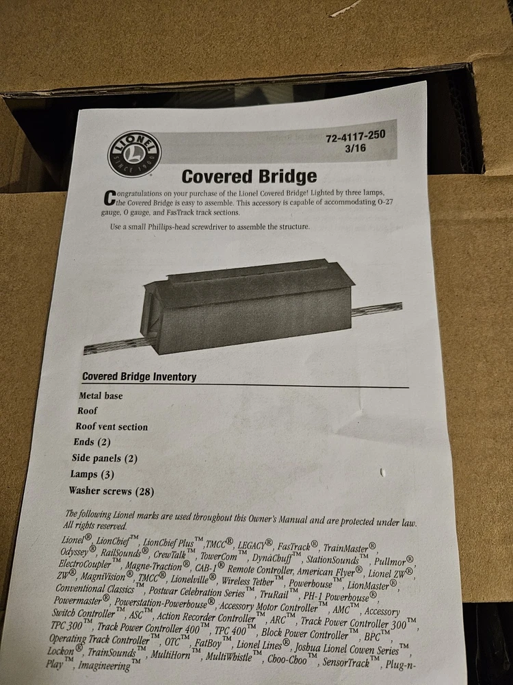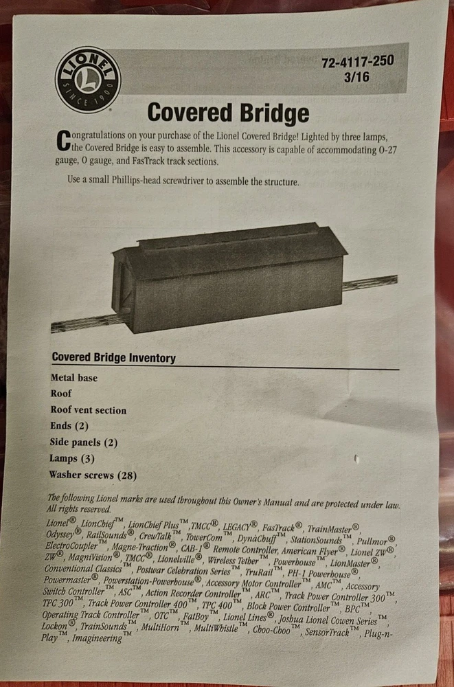 Lionel 6-83305 O 24 Illuminated Red Covered Bridge