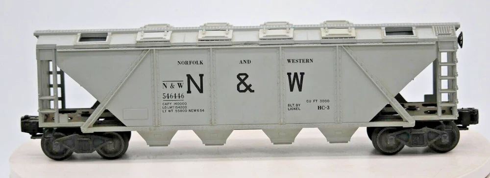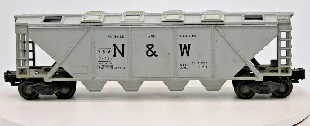 Lionel N&W 6446 Covered Cement Car 546446 Norfolk & Western 4-bay Hopper Train SKU#005514 Look closely at the pictures to see further details. We ships USPS PLEASE see photos for detailed condition!! . PLEASE LOOK AT THE PHOTOS CAREFULLY BEFORE PURCHASING!! If you are purchasing more than one item from us and would like combined shipping, PLEASE request an adjusted invoice from us while still in the cart and BEFORE paying. Ebay does not usually calculate combined shipping accurately and you might get overcharged. Please be aware that when we photograph items, we use lighting that will show the details well. Although we try to present the product as accurately as possible, the lighting may affect the overall look of the item by appearing lighter/darker or possibly a different hue than the actual item. Depending on the type of lighting you have in your home, there may be some differences between the photos and the actual item. If this is a concern of yours, please feel free to request additional photos made in natural lighting or ask for a more detailed description of the item PRIOR TO PURCHASE! PLEASE NOTE: We greatly appreciate your interest in our item for sale. We look forward to a pleasant, quick and satisfying transaction for everybody, so please note the following information before bidding. Thank you! ITEM DESCRIPTIONS: * We will try to describe items well and provide plenty of photos. Please review these carefully before bidding or purchasing. * Only the items pictured and described are what you will receive when purchased. * We will occasionally offer an item clearly marked "AS-IS". This means that we are not sure if it works because we are unable to test it for whatever reason. We will offer these at a discounted price then a similar "working" item. It is possible that these items will work fine, but it also is possible that these items are more useful for their parts. Please only bid on or purchase these items if you are well aware of this, as we will only provide refunds of actual item price (no shipping cost refunds) for these items. * If you have any questions that aren't addressed by the descriptions or photos, please feel free to ask before you bid. * There may be pieces that are missing or broken including, but not limited to, couplers, brake wheels, steps, ladders, railings, etc. May need detailed cleaning SHIPPING: * We usually do not offer shipping to international addresses, but ARE WILLING TO TAKE CONSIDERATIONS. * We try to pack items as carefully as possible, but damage may occur during shipping. If you receive an item that was damaged in shipping, please contact us and we will work with you to resolve the problem. * We will combine shipping costs for all items the same buyer purchases from us within 2 days. Please wait to pay for items until you're done shopping with us. Please contact us if you're expecting to buy more items from us, or to have us adjust the shipping costs. * We will usually ship items out within 24 hours of payment being received Sunday through Friday at noon. We will notify the buyer if there will be a delay in shipping for some reason. Please allow additional time for holidays and weekends when the post office is closed. If payment is received after noon (EST) on Friday, the item might not be shipped until the following Monday. * We do try to recycle shipping materials as much as possible. RETURNS: We abide by eBay's Money Back Guarantee. We definitely want our customers to be happy with their purchase! You may return an item within 30 days of receiving it with the following guidelines: * If the item is defective or damaged (unless we clearly marked the listing "AS-IS"), the buyer will receive a full refund after the buyer returns it and it is received by us. Customers who falsely claim their item is defective, damaged, or not as described in order to receive a full refund and free return shipping will be permanently blocked from making future purchases from us. * If the item is as described (including "AS-IS" items) and the buyer decides for any other reason than defective/damaged to return it, only the actual price of the item will be refunded once it has been returned and it is received by us. The buyer will be asked to pay all original and return shipping charges. This includes all reasons other than defective/damaged, including wrong size, wrong type, changed mind, etc. All "AS-IS" items will fall into this category of return. Please make sure the item is what you want before purchasing it. * Please contact us before initiating a refund request. FEEDBACK: We always leave feedback at the end of transaction. We consider the transaction to be over when we receive feedback from the buyer confirming the item arrived satisfactorily. If you are unsatisfied with your purchase please contact us before leaving neutral or negative feedback. WE APPRECIATE POSITIVE FEEDBACK IF YOU ARE SATISFIED WITH YOUR PURCHASE! THANK YOU FOR YOUR INTEREST IN THIS ITEM!