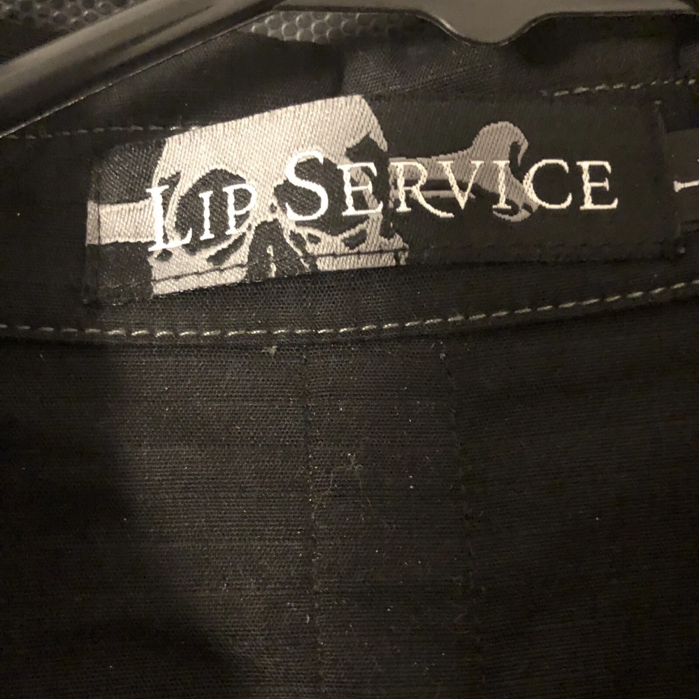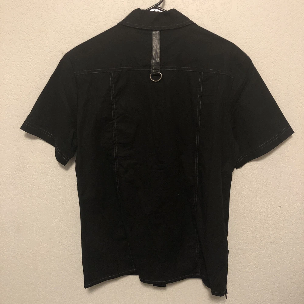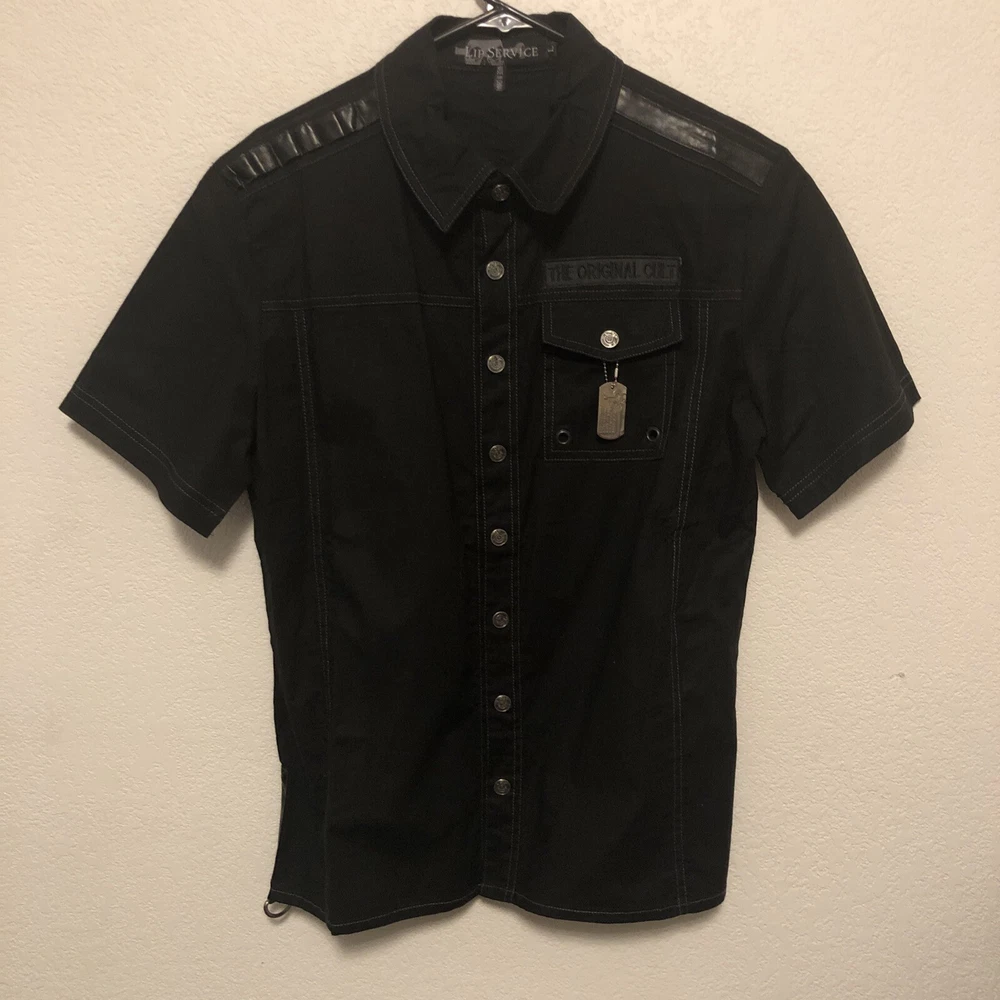 Look at pictures and bid accordingly this shirt has dog tag embroidery rings bullet holders and pleather stripes and snap button so much very unique new never worn bought early 2000’s I have other like Vintage and Goth items up for auction from my personal 40++ years of collecting them check back weekly as I will list them when time allows thanks for looking This Lip Service shirt is a rare find for fans of goth and punk fashion. The black snap button front shirt features a dog tag and is made of stretch material. The short sleeve shirt is perfect for clubwear and has a chest size of 20. The shirt is an original piece and has a vintage look. The brand is known for its unique and edgy designs. This shirt is a must-have for any collector of vintage clothing.