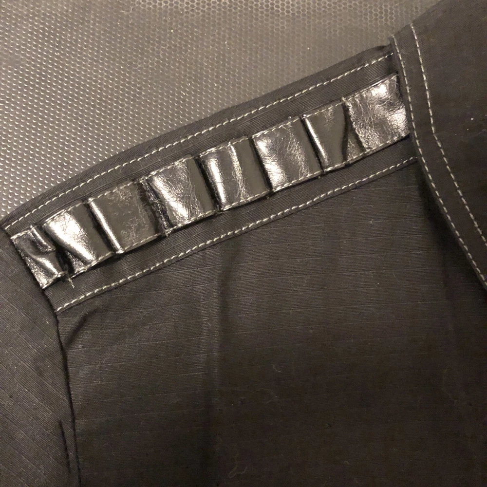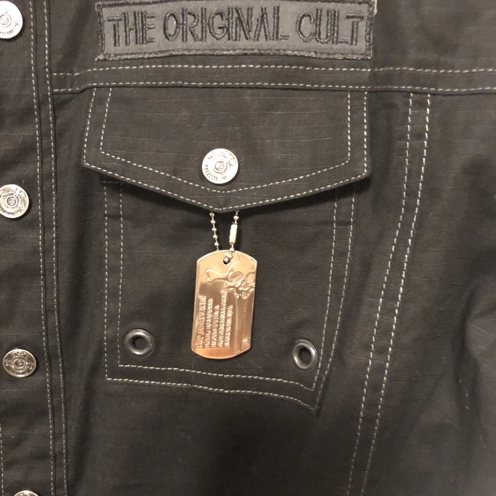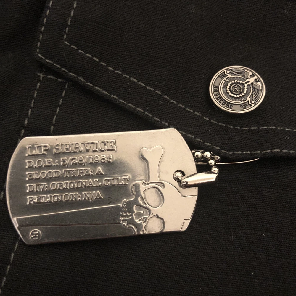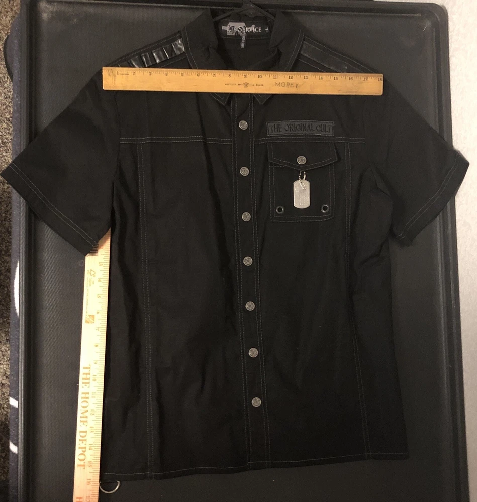 Look at pictures and bid accordingly this shirt has dog tag embroidery rings bullet holders and pleather stripes and snap button so much very unique new never worn bought early 2000’s I have other like Vintage and Goth items up for auction from my personal 40++ years of collecting them check back weekly as I will list them when time allows thanks for looking This Lip Service shirt is a rare find for fans of goth and punk fashion. The black snap button front shirt features a dog tag and is made of stretch material. The short sleeve shirt is perfect for clubwear and has a chest size of 20. The shirt is an original piece and has a vintage look. The brand is known for its unique and edgy designs. This shirt is a must-have for any collector of vintage clothing.