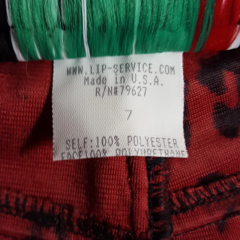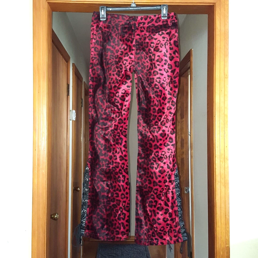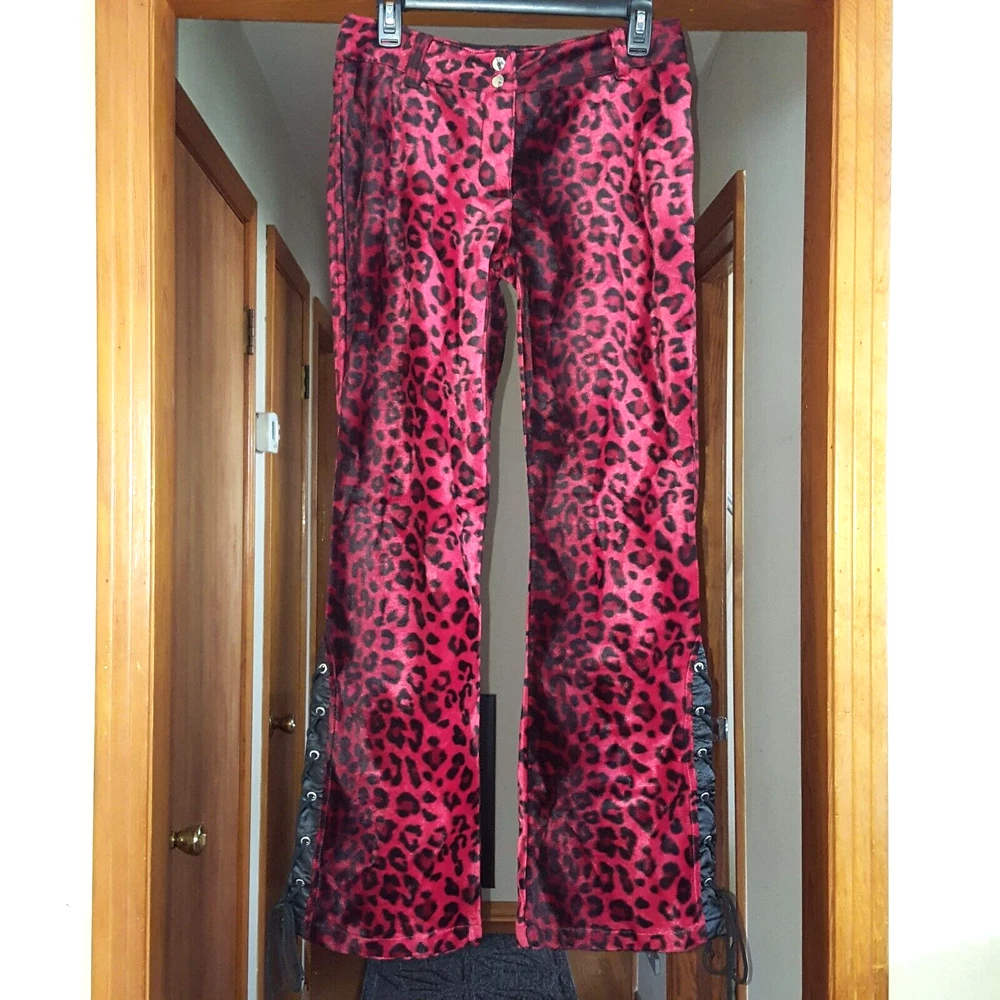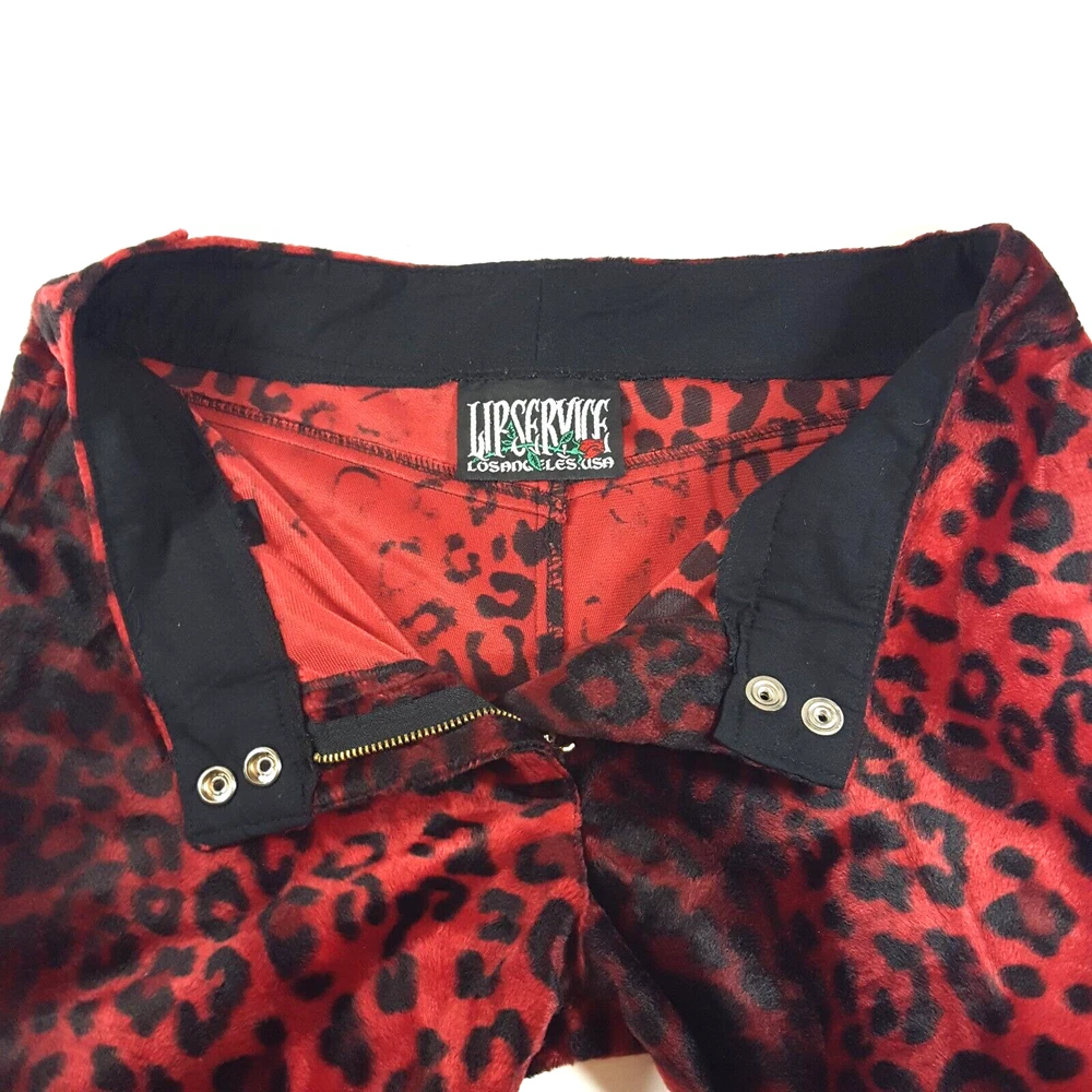 Vintage Lip Service Women's Pants Leopard Animal Print Red Black Belted USA One of a kind vintage 90s Lip Service leopard print pants in a color and pattern that can't be found on any retail platform anywhere in the world. In other words, this is an extremely rare vintage piece of apparel. Important Notes: When buying apparel items online always be sure to rely on the actual measurements in the item's listing. "Do Not" rely on the label size only as many manufacturers surprisingly have different measurements for their sizes. Prior to purchase , please flat lay a pair of your similar style pants, measure them using our specs below and if the numbers match or come very close, these will certainly fit you. Yes, these are a bit long with relationship to the inseam and waist. Due to the rare iconic nature of these, purchasing them will not be a mistake as you will always be able to sell them for at least what you purchased them for and likely much more as the years pass. So if you have to have to invest in having the length altered, no big deal. They will easily retain their value. These have to be dry cleaned and can't be machine washed. Measurements: Waist (inside edge to inside edge): 14 3/4" (29 1/2" total) Inseam (crotch mid-point to inside leg bottom): 32" Outseam: 40 1/2" Rise: 9" Leg Opening: 9 3/4"