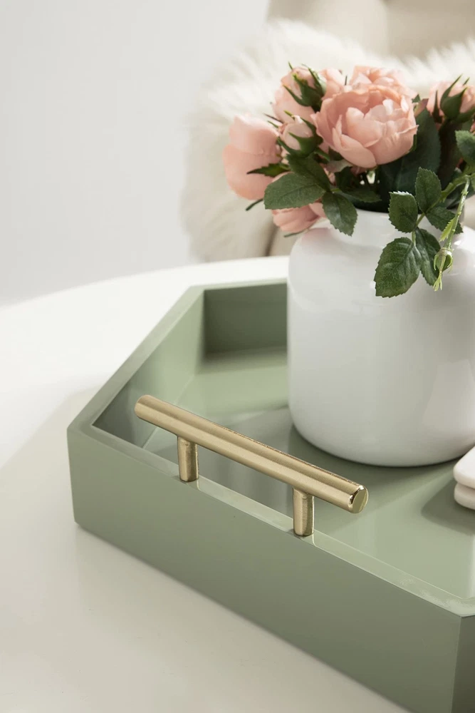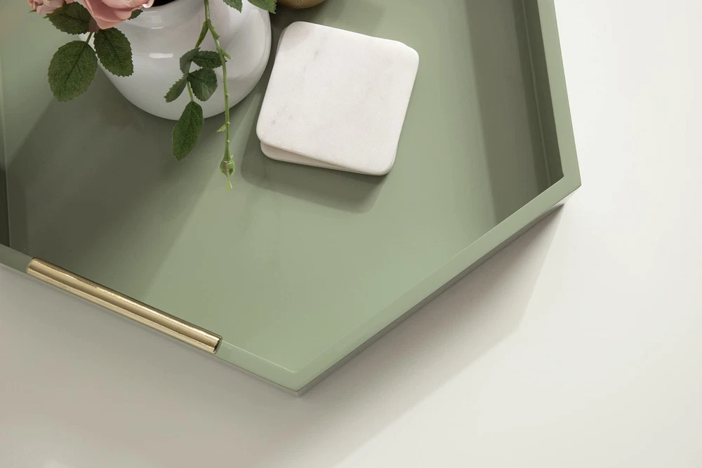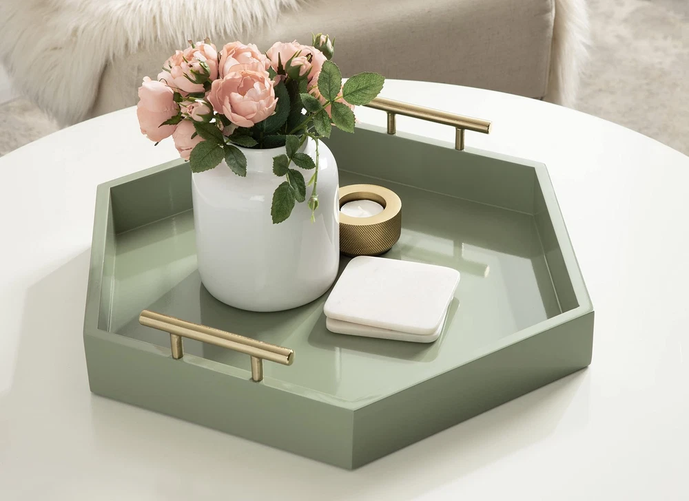 Modern Design: This Lipton tray features a geometric hexagon shape with a sage green finish, making it a standout accent piece for a console, ottoman, or vanity Robust Handles: The Lipton tray features metal handles with a gold finish for a bold yet handy detailing that makes carrying from room to room a breeze Ample Size: The overall dimensions of this serving tray are 18 inches wide by 3.25 inches tall by 18 inches deep, making it fantastic for a variety of surfaces Versatile: Use the Lipton tray to serve drinks on coasters, showcase your favorite plants, or your favorite makeup and beauty supplies Protective Bottom: Felt pads are attached to the bottom of this tray to prevent damage to your hard surfaces