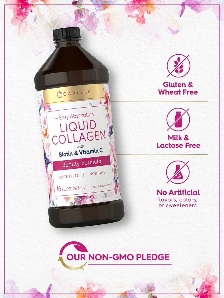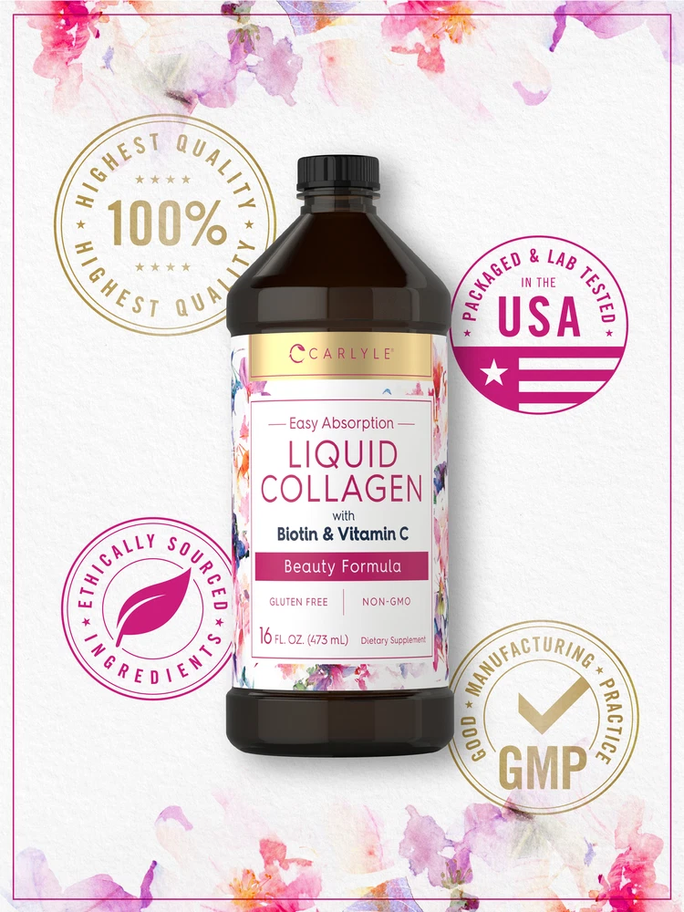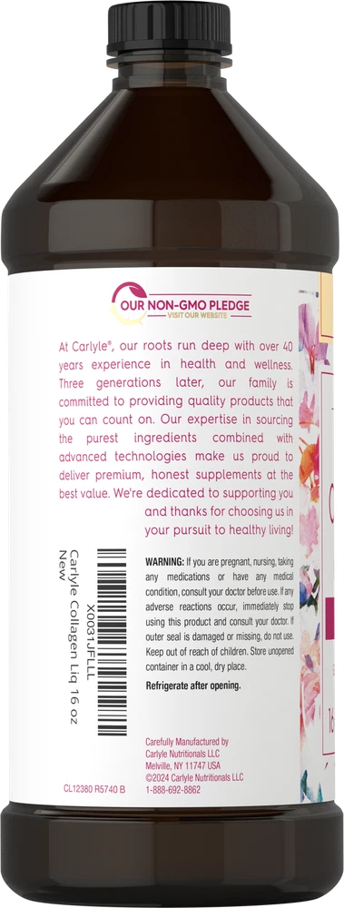 Supplementing with Collagen: Collagen is the most abundant protein in the body and is naturally found in hair, skin, and nails. With a strong presence in hair, skin, and nails, it has quickly become a favorite beauty ingredient for men and women. Traditionally found in topical products, collagen can also be obtained from dietary supplements such as powder, liquid, tablets, capsules, and gummies. Carlyle Liquid Collagen: Fuel your inner beauty with the best, Carlyle Liquid Collagen. This liquid formula provides 1,000 mg of Hydrolyzed Collagen and amino acid protein in each tablespoon, with delicious natural berry flavor. Also added is Amino Acid Protein, Biotin, and a special Herbal Blend, for maximum support. Our beauty formula is non-GMO and contains no artificial flavor, so there is nothing standing in the way of adding it to your beauty routine today! Rooted in Wellness: Our expertise in sourcing the purest ingredients combined with advanced technologies makes us proud to deliver premium, honest supplements at the best value. Carlyle Liquid Collagen is a testament to our commitment to excellence, made with powerful ingredients rooted in wellness. Thanks for choosing us in your pursuit of living healthy
