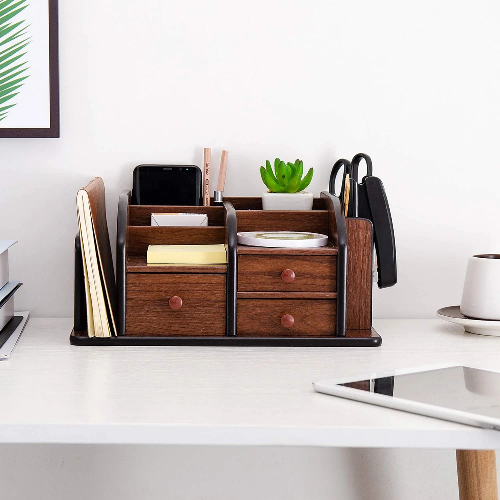 CHARMING WOODEN DESKTOP ORGANIZER FOR OFFICE & HOME: Bring organization and professionalism to your workspace with this beautifully-crafted vintage tabletop storage cabinet. A perfect sorter for office supplies, files, , crafts, and stationery, it helps create a clean workplace environment that enhances productivity and efficiency. Also set this wooden organizer on any desktop at home to random objects, cosmetics, and accessories while enhancing the beauty of your already stylish living space. MULTIPLE COMPARTMENTS & DRAWERS FOR VERSATILE STORAGE: Featuring compartments of different sizes and shapes, this all-in-desktop organizer provides great storage space for you to , display or classify your daily essentials. - 3 flat surface slots: ideal for sorting sticky notes, tape, correction tape, erasers, pencil sharpener, hole puncher, and staplers, and great for displaying crafts, photos, and potted plants - 3 vertical dividers: Use these slots to place scissors, pens, pencils, markers, ruler, cutter knife, calculator, and cellphone - 3 drawers: Excellent for storing smaller items such as paper clips, binder clips, thumbtacks, stamps, or staples - 1 side shelf: Exceptionally useful for you to organize your incoming/outgoing , book, note pads, documents, files, iPads, or ; also excellent for displaying newspapers, books, or magazines DURABLE & STURDY: Made from quality real wood, this charming dark-brown supply caddy guarantees durability and adds style to your home or workstation with a classic, elegant touch. The anti-slip pads at the bottom steady the organizer while protecting your desk from being scratched. Get this classy supply caddy now to make your day less hectic and more organized! Elegant Wooden Organizer: Made of premium wood, this finely crafted desktop organizer boasts an elegant dark brown finish and is adorned with sleek black edges. Place this charming wooden caddy on top of any desk, table, counter, shelf, or bedside drawer to get organized and beautify your space in go Large & Versatile Storage: Featuring 3 flat surface compartments, 3 vertical dividers, 3 drawers, and 1 side rack, this multifunctional desk organizer offers large storage space while taking up only little desktop or countertop space. It is ideal for keeping all your daily necessities and office supplies within convenient reach Ideal for Home & Office: Bring organization and style to your space with this storage caddy. Use the slots and drawers to sort a myriad of office essentials such as pens, pencils, markers, tape, staplers, scissors, post-it notes, glue, white-outs, paper clips, cellphones, make-up accessories, and eyeglasses. Also take advantage of the side rack for storing , books, notebooks, magazines, calculators, pads, files, or Sturdy & Durable: The soft, anti-slip rubber adhesive pads prevent the organizer from sliding around on the desk and protect your desktop from being scratched Approximate Dimensions (in inches): 12"W x 8"D x 5.5"H