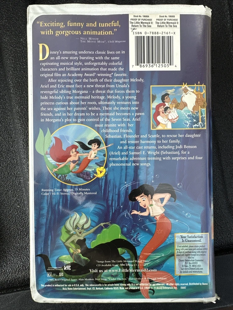 Movie/TV Title:Little Mermaid II-Return to the SeaCountry/Region of Manufacture:United StatesUPC:0786936125054Release Year:2000Former Rental:NoLanguage:EnglishSub-Genre:Animation/AnimeRating:Ggtin13:0786936125054Studio:Walt Disney VideoGenre:Children's VideoEdition:Full Screen