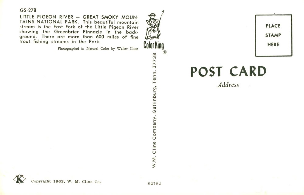 The East Fork of the Little Pigeon River, with the Greenbrier Pinnacle in the background, showcases the beauty of the Great Smoky Mountains National Park. This postcard features the natural color photography of Walter Cline.