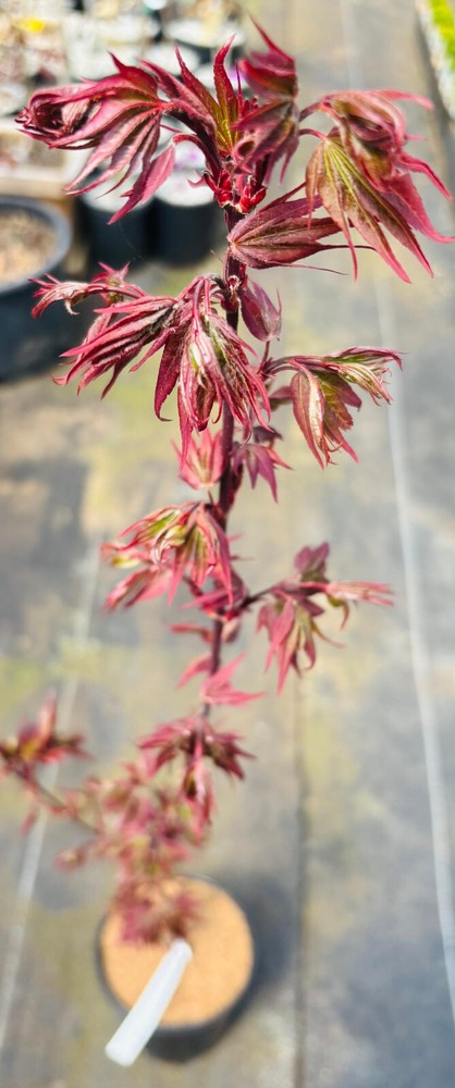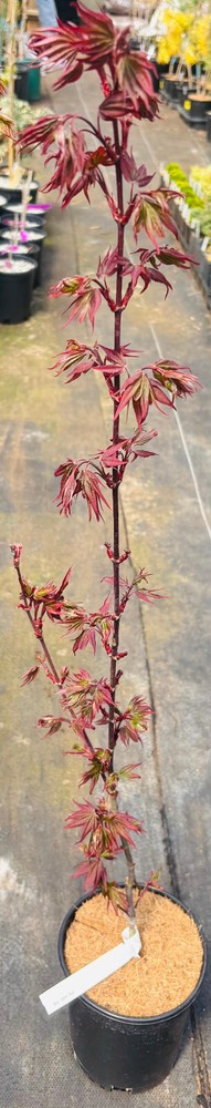 A small, narrow deciduous tree with bright red growth in spring that turns maroon in summer. New growth in summer emerges bright red, contrasting with the darker, older foliage beneath. Prefers sun/partial shade in well-drained soil. 6' tall x 2' wide in 10 years. Hardy to -20 degrees. USDA zone 5. The plants on sale are three-year-old grafts growing in one-gallon pots. The plant height: 3 feet. The plants will not be shipped to CA, OR, WA, or HI. Due to photo-sanitary regulations, plants will not be shipped to California, Oregon, Washington state, or Hawaii.