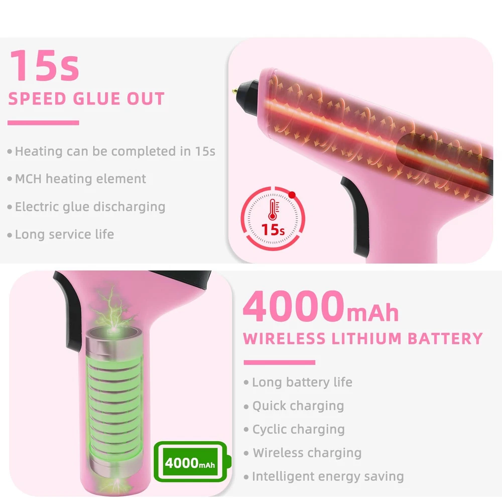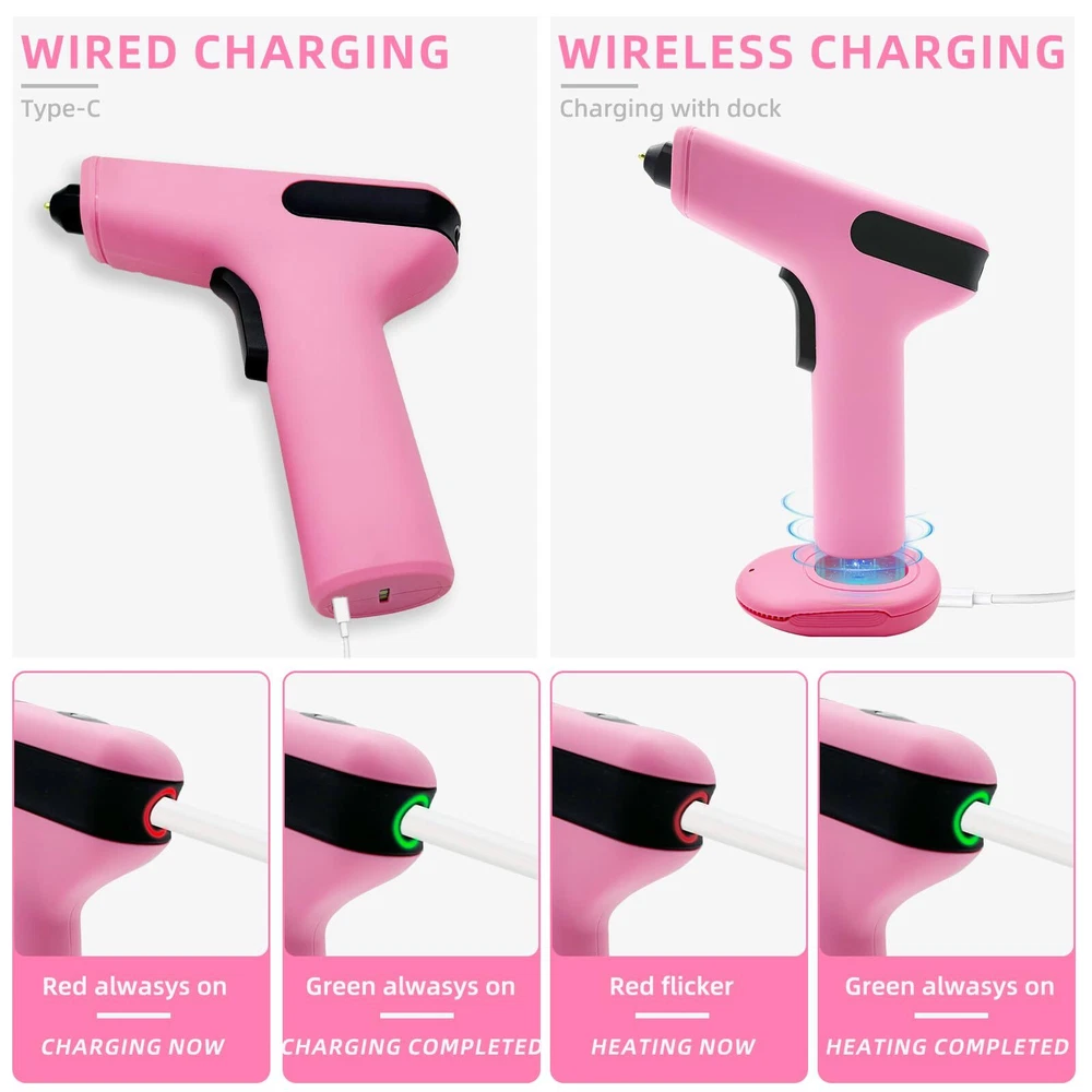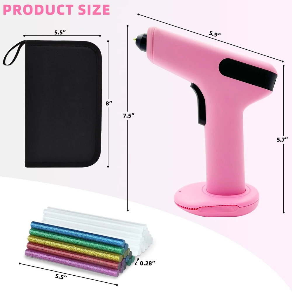15S FAST PREHEATING: The mini cordless glue gun fast preheat within 15s. It is faster than all the conventional glue guns! Eliminating long wait times and significantly enhancing work productivity. Press about 5s to turn on/off the cordless glue gun. 4000mAh LONG-LASTING BATTERY: This small hot glue gun is equipped with a 4000mAh premium lithium-ion battery, the cordless glue guns can work for up to 100 minutes. Come with a Type-C charging cable, Charging Anywhere! No cord No limits! 5 MINUTES AUTOMATIC POWER OFF PROTECTION: The cordless glue gun with intelligent safety system will power off automatically when it has been inactive for more than 5 minutes, safety and saves energy. Anti-drip Design and heat resistant silicone nozzle prevent leakage making this cordless glue gun extremely safe to use. Type-C QUICK CHARGING: TWO WAYS to charge the cordless glue gun. Charge the glue gun directly or Charge with dock. FRONT LED LIGHT FLASHING when glue stick is about to run out. This cordless glue gun perfect for Crafts, school DIY projects, home repairs CORDLESS HOT GLUE GUN KIT: This mini cordless hot glue gun come with 30 glue sticks(10 colored and 20 clear, Size: 0.28inch*4inch), 1 x Carry Case, 1x Type-C charging cable, 1 x charging Base. If you have any issues while using this cordless glue gun kit please contact us.