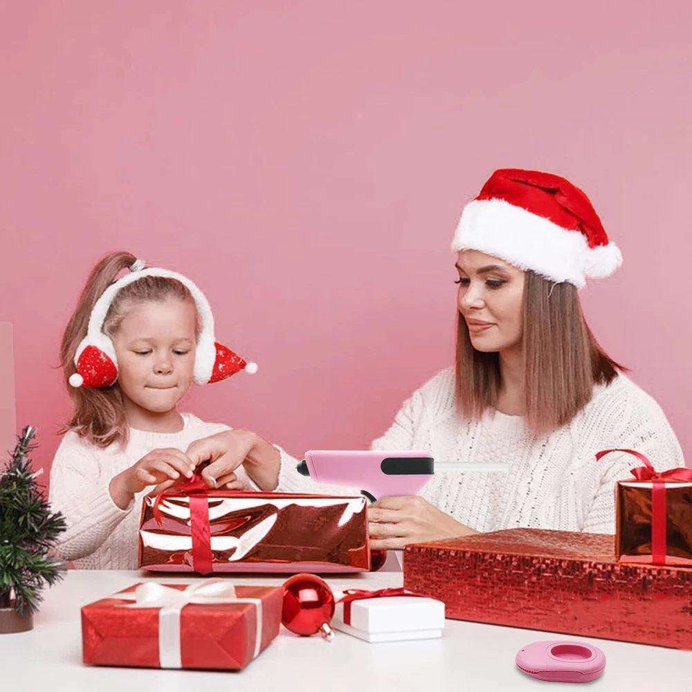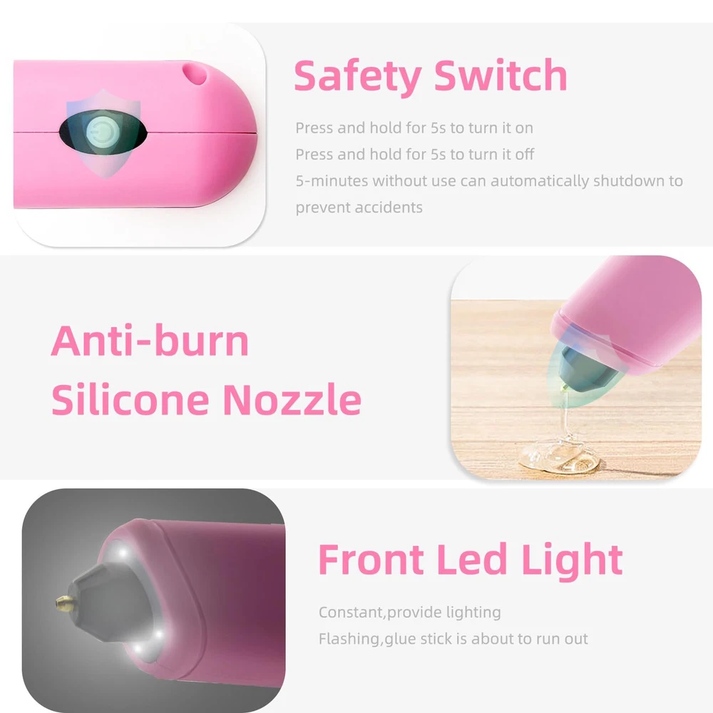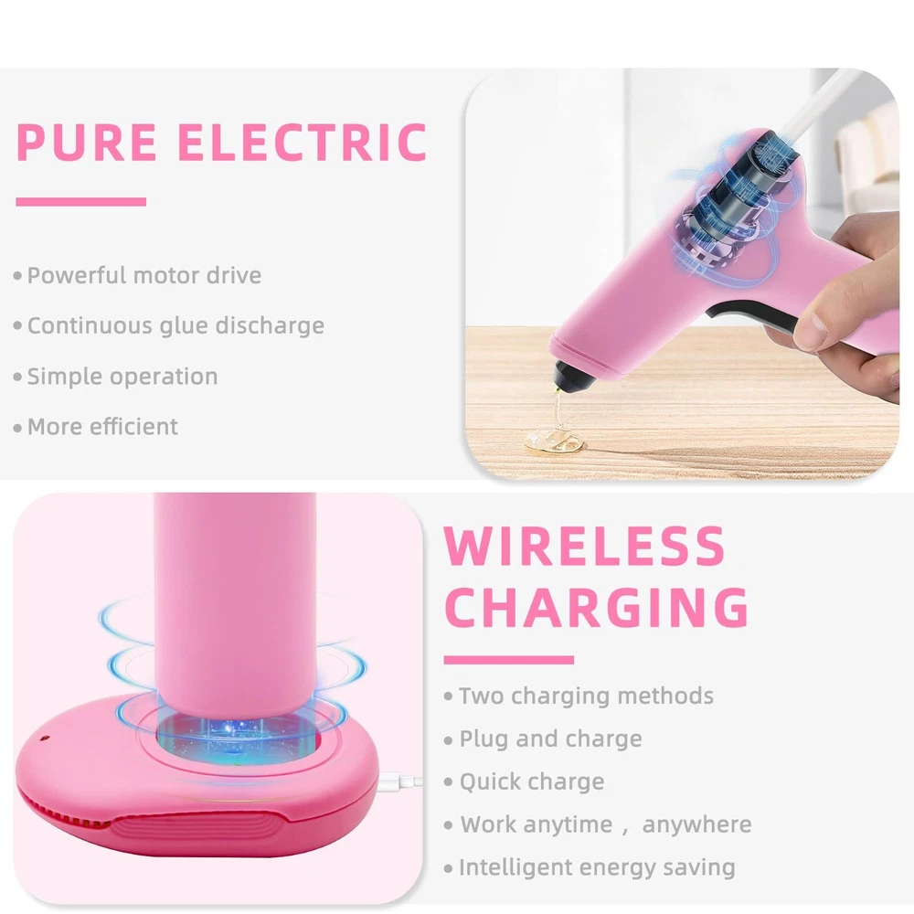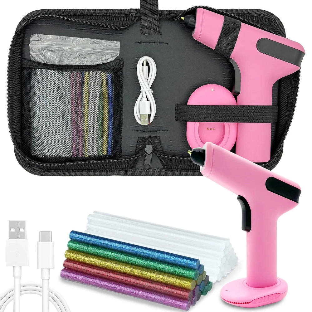 15S FAST PREHEATING: The mini cordless glue gun fast preheat within 15s. It is faster than all the conventional glue guns! Eliminating long wait times and significantly enhancing work productivity. Press about 5s to turn on/off the cordless glue gun. 4000mAh LONG-LASTING BATTERY: This small hot glue gun is equipped with a 4000mAh premium lithium-ion battery, the cordless glue guns can work for up to 100 minutes. Come with a Type-C charging cable, Charging Anywhere! No cord No limits! 5 MINUTES AUTOMATIC POWER OFF PROTECTION: The cordless glue gun with intelligent safety system will power off automatically when it has been inactive for more than 5 minutes, safety and saves energy. Anti-drip Design and heat resistant silicone nozzle prevent leakage making this cordless glue gun extremely safe to use. Type-C QUICK CHARGING: TWO WAYS to charge the cordless glue gun. Charge the glue gun directly or Charge with dock. FRONT LED LIGHT FLASHING when glue stick is about to run out. This cordless glue gun perfect for Crafts, school DIY projects, home repairs CORDLESS HOT GLUE GUN KIT: This mini cordless hot glue gun come with 30 glue sticks(10 colored and 20 clear, Size: 0.28inch*4inch), 1 x Carry Case, 1x Type-C charging cable, 1 x charging Base. If you have any issues while using this cordless glue gun kit please contact us.