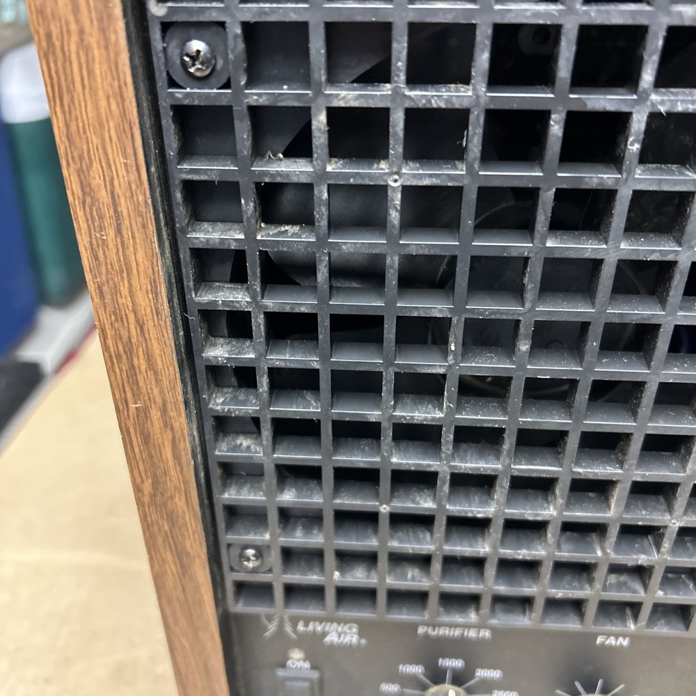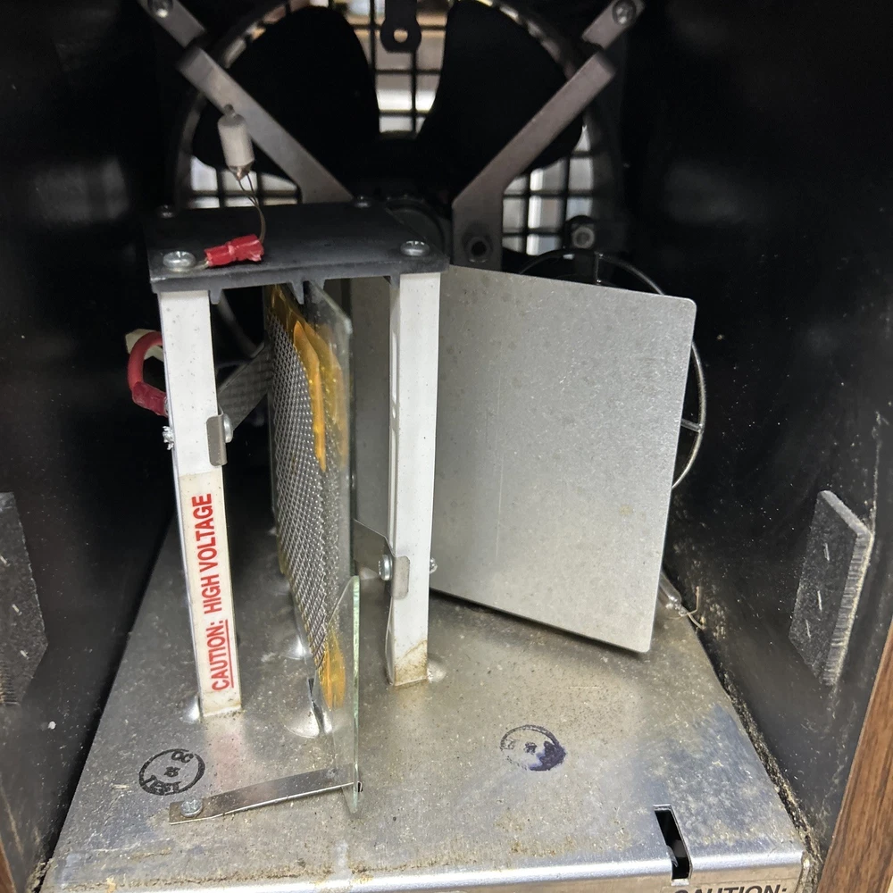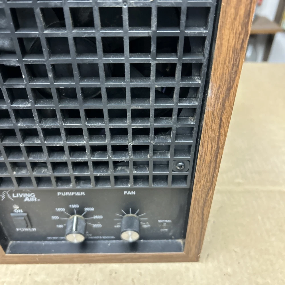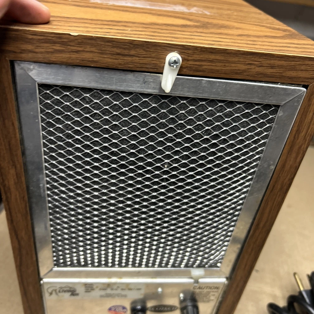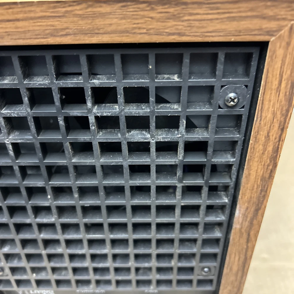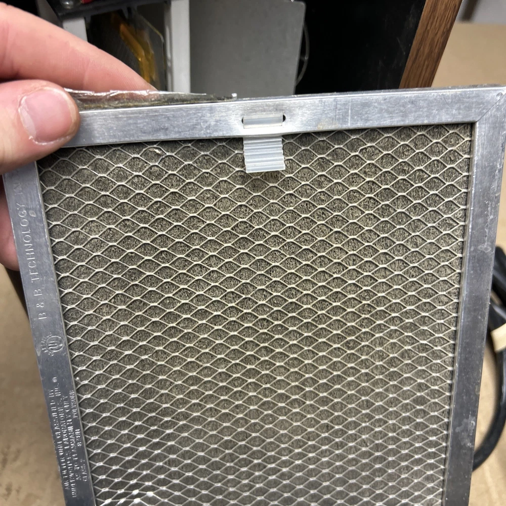 The item was tested and worked well. The item has some signs of wear and use. The grill and fan have some dust and debris in them. The back filter has a lot of wear and will probably need replaced. The inside of the back has some wear. The top corner of the wood has some wear and separation of the wood finish. The wood finish has some wear around the item. See pictures to see the item.