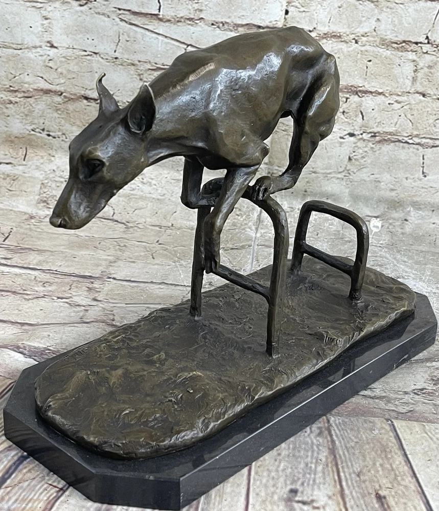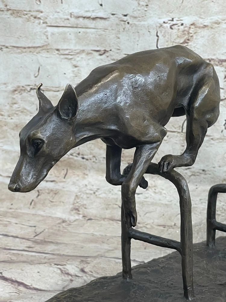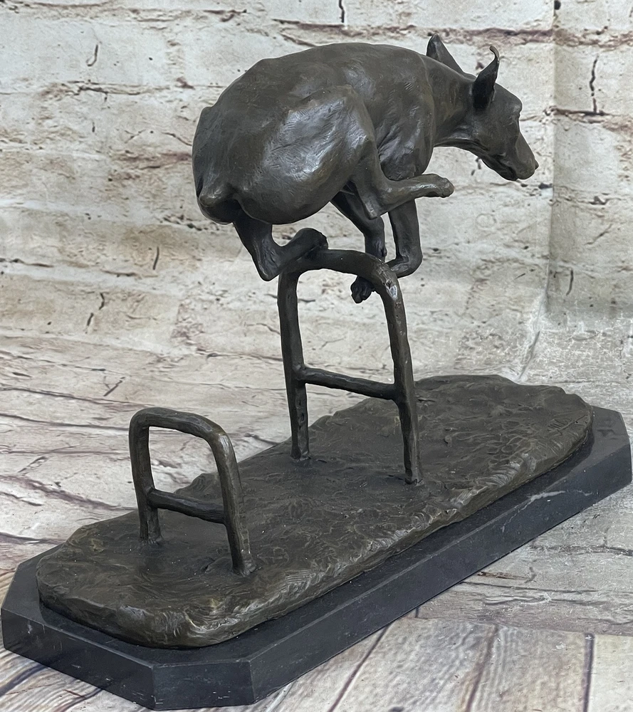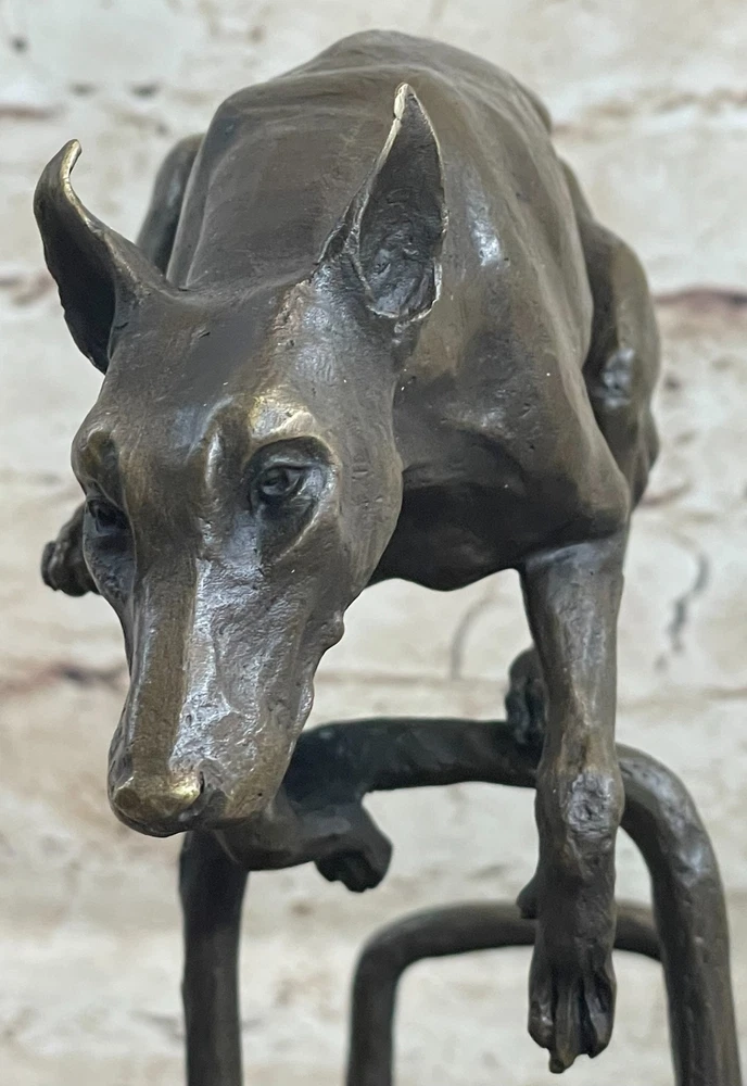 Living Bronze Doberman Pinscher Dog cast bronze statue on marble base 1994 Art Living Bronze Doberman Pinscher Dog cast bronze statue on marble base 1994 Art Condition : This sculpture is in perfect condition. Bronze Dimensions with Marble Base: Height 9" X Length 12" Marble Dimensions: 12"X 6" Height without base: 8.5" Weight: 12 LBS Inventory: 9440K13049 This high-energy dog leaps over hurdles with remarkable skill and vivacity, showcasing its talent and adventurous spirit. Crafted in bronze patina, this sculpture captures the essence of a jumping dog with exquisite details that bring out the dog's elegance and charm. The piece, signed by the artist Milo, depicts the dog gazing intently ahead, capturing a moment of pure athleticism and grace. The statuesque pose of this magnificent creature exudes aristocratic charm and grace. The intricate details of the sculpture, from the texture of the dog's fur to the muscular definition of its body, showcase the artist's dedication to capturing the true spirit of these animals. The warm brown patina finish adds depth and character to the artwork, making it a captivating addition to any space. Whether you're a dog lover, an art enthusiast, or simply appreciate the beauty of nature's creatures, this jumping dog bronze sculpture is a stunning representation of agility and elegance. Display it in your home, office, or gallery to celebrate the athleticism and grace of man's best friend. Shipping Terms : Most of our items are shipped via USPS (United States Postal Service) mail or UPS. Most orders are shipped within 24-48 hours of purchase. Please be aware that not all items are available for USPS shipping due to size and weight. We do ship to Hawaii, Alaska, Canada, Puerto Rico, APO/AE, and U.S. Virgin Islands, however, an additional charge may be required. Please contact us before making any purchases in these areas. For Non-USA customers, you may be responsible for all duty, tax, brokerage fees that may be due upon delivery (shipping costs cover freight charges only). We also ship internationally. Please refer to the "Shipping and Handling" chart for the rates for each area. Payment : We accept just about any form of payment. PayPal, Master Card, Visa or American Express credit cards. Money orders, cashiers checks, and even personal or business checks. For governmental institutions, we will also accept a purchase order. Please understand that for personal or business checks we have to wait for the check to clear (usually 7 days) before shipping. Condition : New Detailed Hand Crafted Hot Cast Bronze Satisfaction Guaranteed. This is Stock Photo, Slight Color Variation!! Listing and template services provided by inkFrog