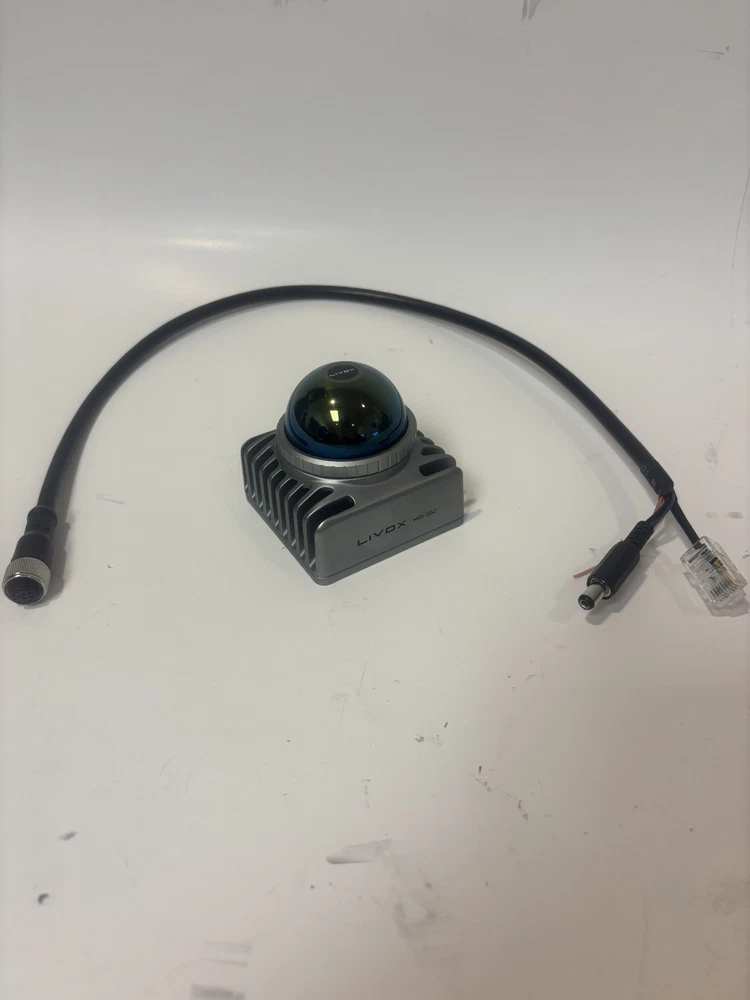 This Livox Mid-360 is a high-performance 3D LiDAR sensor designed for mobile robotics, SLAM mapping, and autonomous navigation. It features a unique hybrid solid-state design that provides a full 360° horizontal field of view , making it an essential tool for obstacle avoidance and environmental perception. Key Specs: Field of View (FOV): 360° Horizontal / 59° Vertical Detection Range: Up to 100m (40m @ 10% reflectivity) Precision: $\le 2\text{cm}$ range precision at 10m Points Per Second: 200,000 pts/s Durability: IP67 waterproof/dustproof rating Integrated IMU: Built-in 3-axis accelerometer and gyroscope Condition & Included: Condition: Unit is in excellent physical condition with clear optics. Cables: Includes the official M12 Aviation 1-to-3 Splitter Cable (connects to Power, Ethernet/RJ45, and Function)