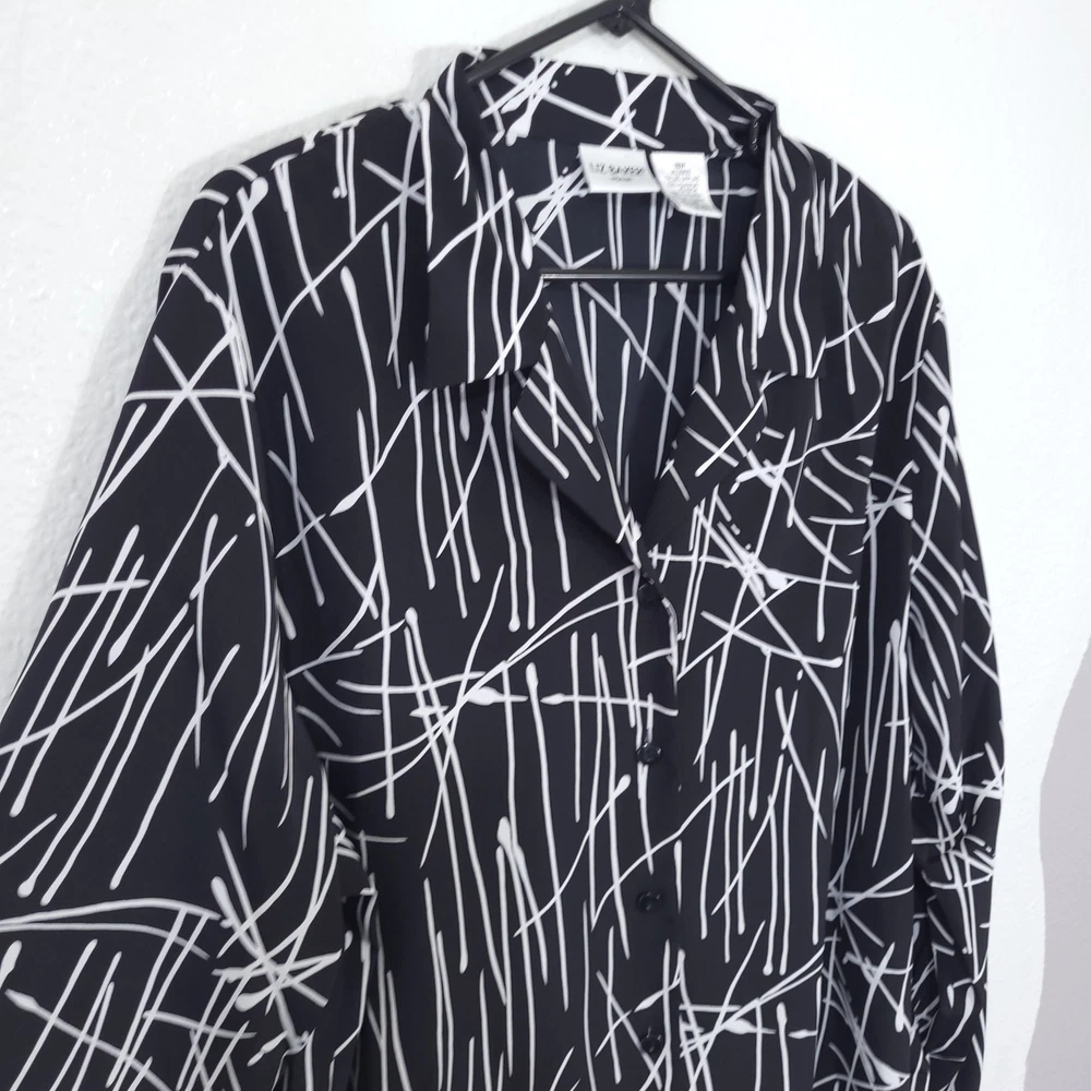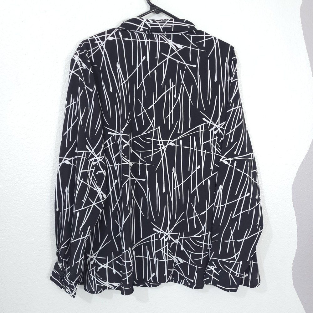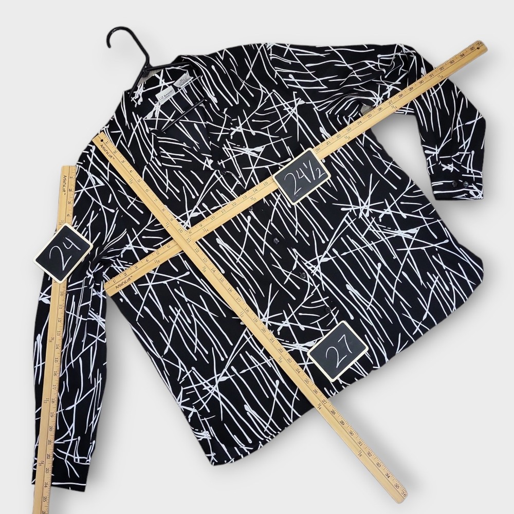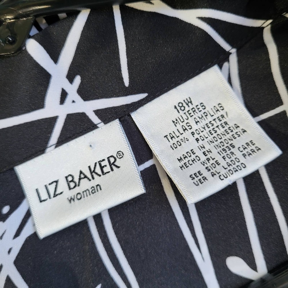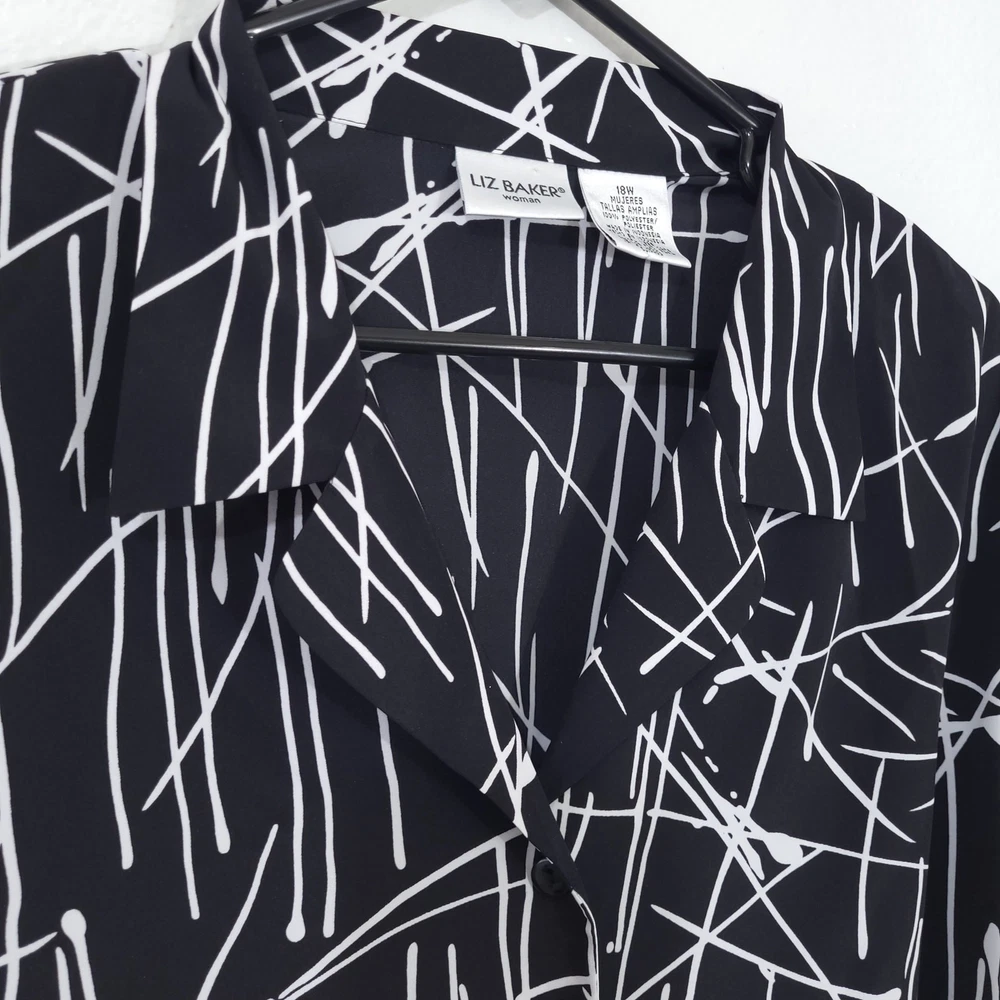 Liz Baker Blouse Shirt SIZE: Tagged Size 18W *** ~ Approx measurements in pics CONDITION: Preloved and in Great Condition. No holes, tears, stains. FABRIC: Polyester CARE: Machine Wash DETAILS: ~ Black and White with Artsy Graphic abstract Print ~ Long Sleeves with Button Cuffs ~ Button Closure, Button Up, Button Down ~ Collared V Neck STYLES: Modern, Artistic, Professional, Casual, Year Round, Office, Work Blouse, Graphic Print, Versatile, Edgy, Dressy to Casual, Day to Evening *** Make sure it fits - Sizing varies between brands and decades. It's best to know your body measurements and compare them to clothing measurements and your preferred fit. If you need help on how to do this, or additional measurements, let me know. I will be happy to help.