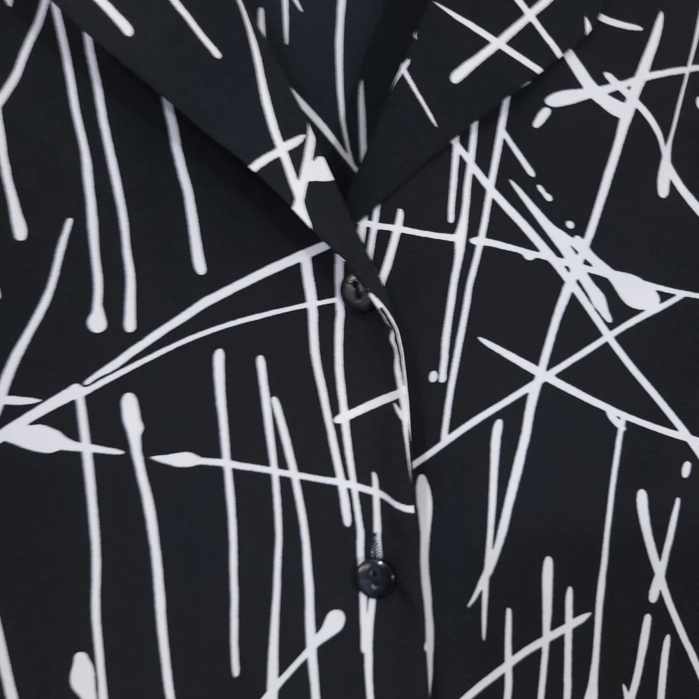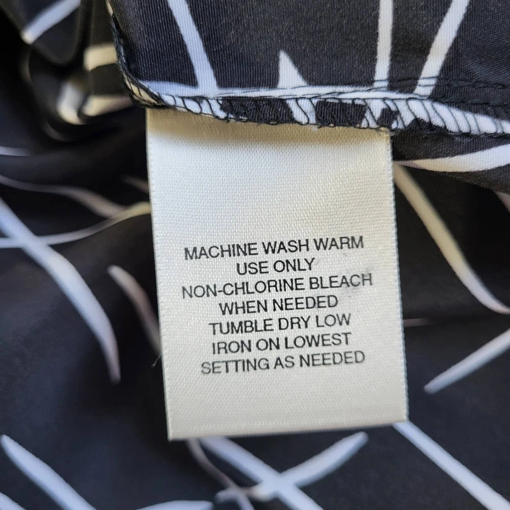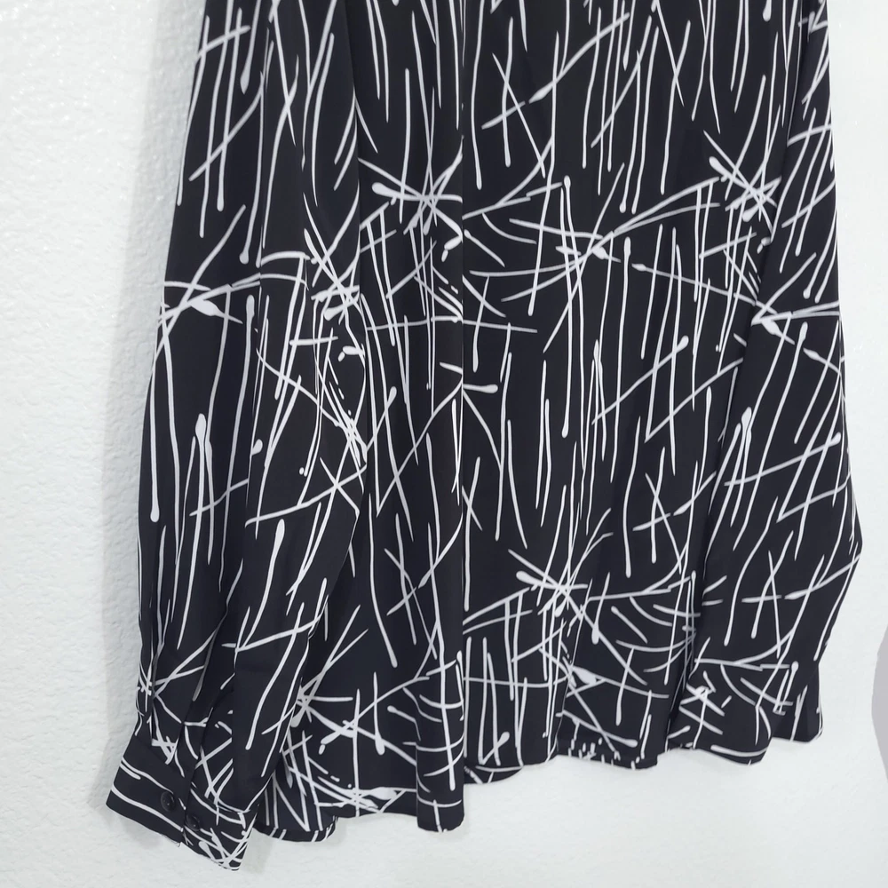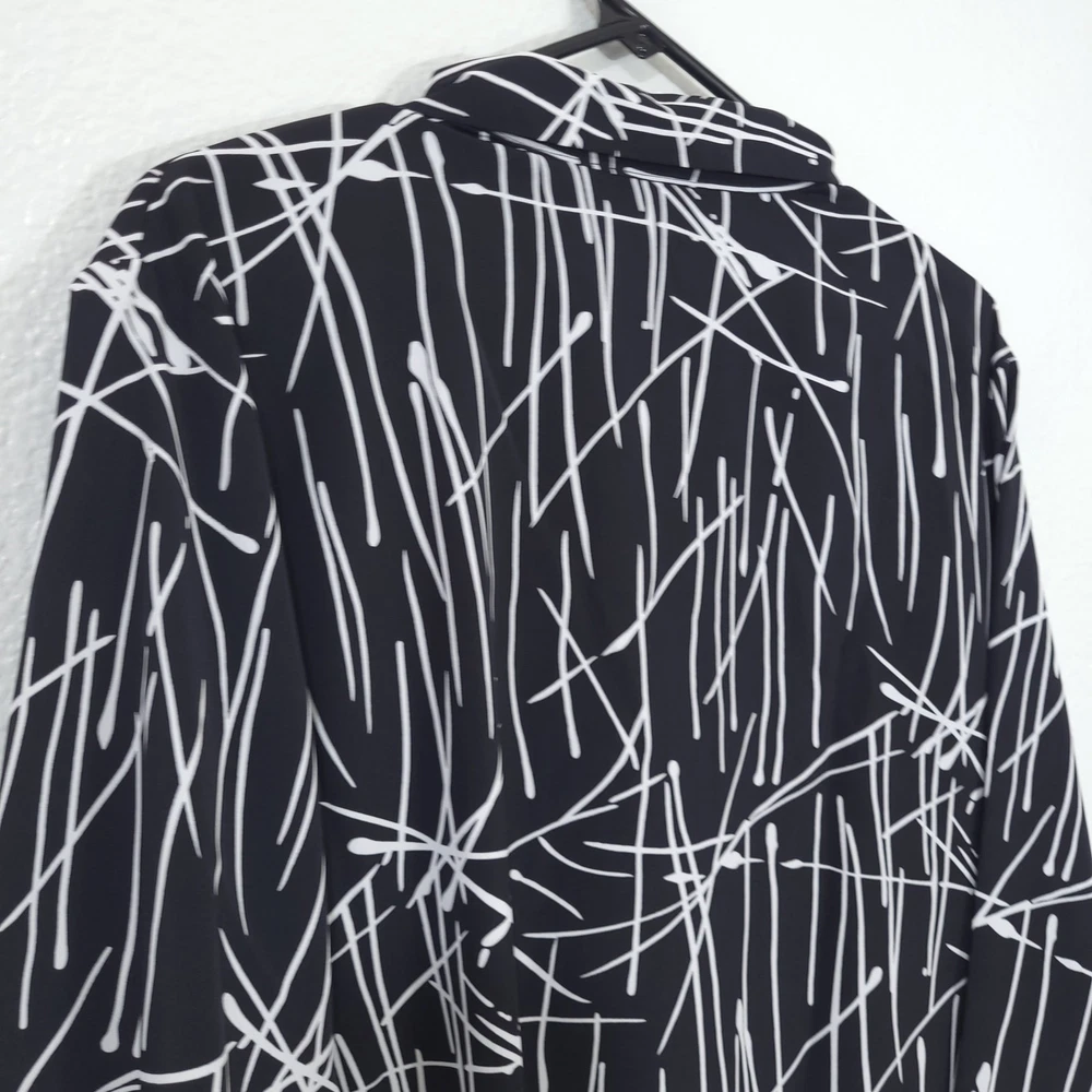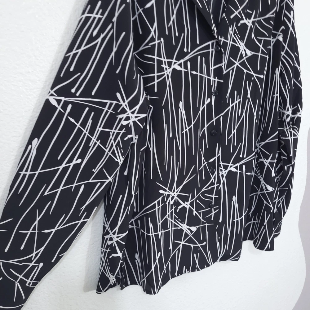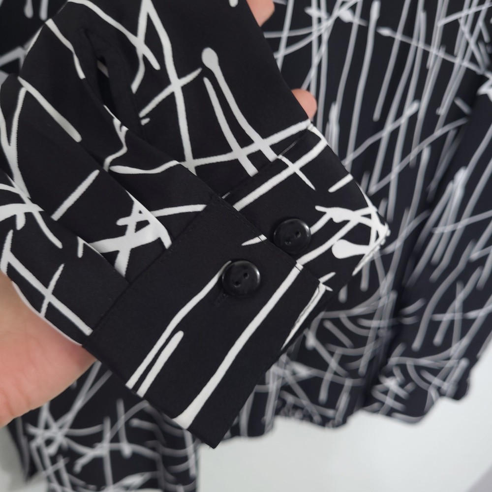 Liz Baker Blouse Shirt SIZE: Tagged Size 18W *** ~ Approx measurements in pics CONDITION: Preloved and in Great Condition. No holes, tears, stains. FABRIC: Polyester CARE: Machine Wash DETAILS: ~ Black and White with Artsy Graphic abstract Print ~ Long Sleeves with Button Cuffs ~ Button Closure, Button Up, Button Down ~ Collared V Neck STYLES: Modern, Artistic, Professional, Casual, Year Round, Office, Work Blouse, Graphic Print, Versatile, Edgy, Dressy to Casual, Day to Evening *** Make sure it fits - Sizing varies between brands and decades. It's best to know your body measurements and compare them to clothing measurements and your preferred fit. If you need help on how to do this, or additional measurements, let me know. I will be happy to help.
