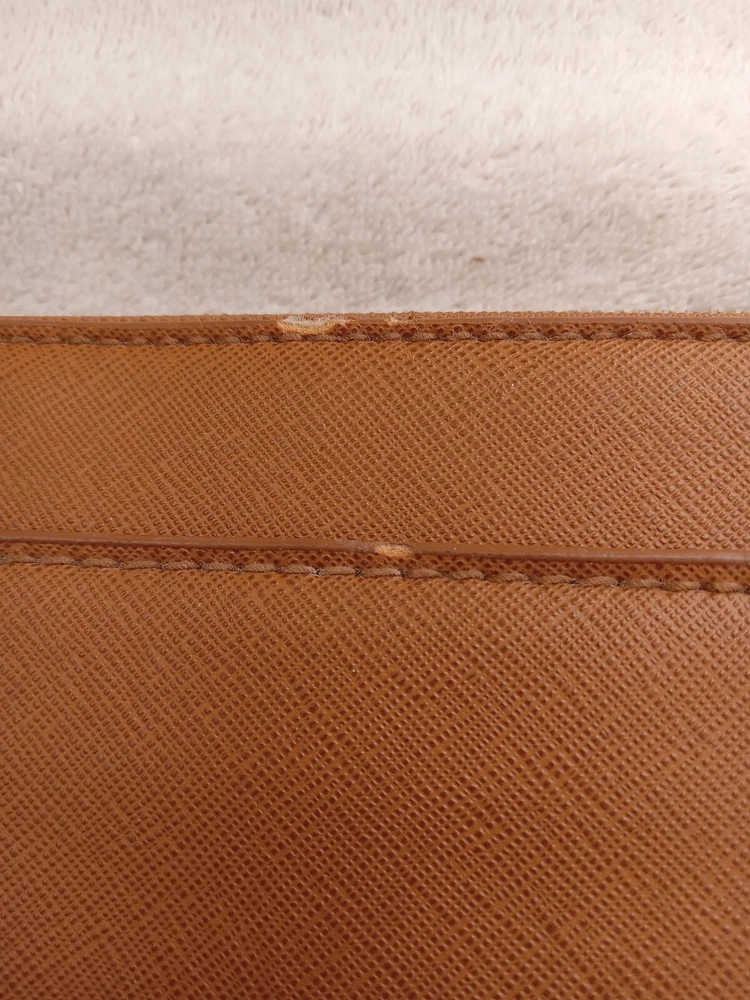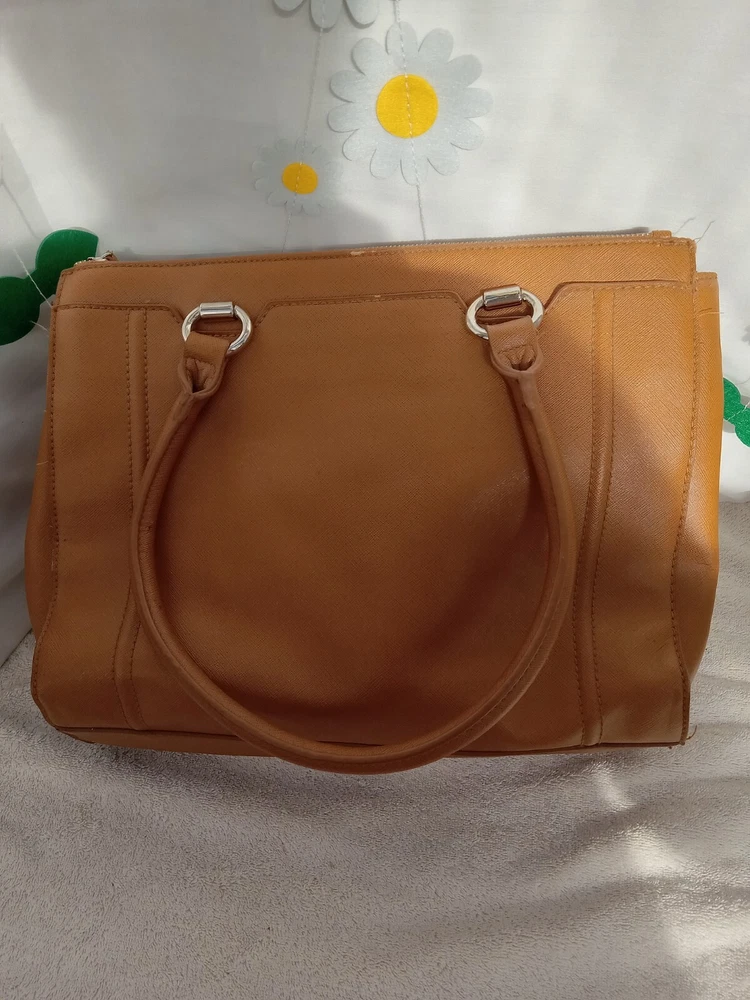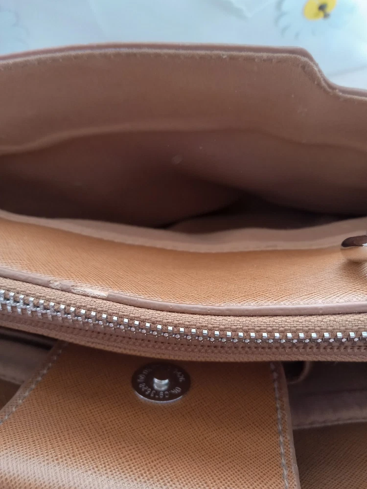 Really great bag in good condition. One small scrape shown in picture. This is a large bag 14 in wide 11 in tall opens up to 5 1/2 in and is 14 in deep. Lots of compartments for just about anything. Lining is 100% polyester. Has 3 top zipper pockets, 1 inside zipper pocket 3 pouch type pockets on the inside and a slid in pocket on the outside. Closed buckle loops hold the handle metal in a gold tone. Magnetic snap close. Lots of space great bag for work or day trip. No rips holes fraying.