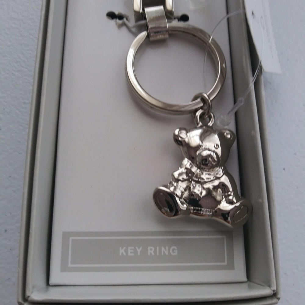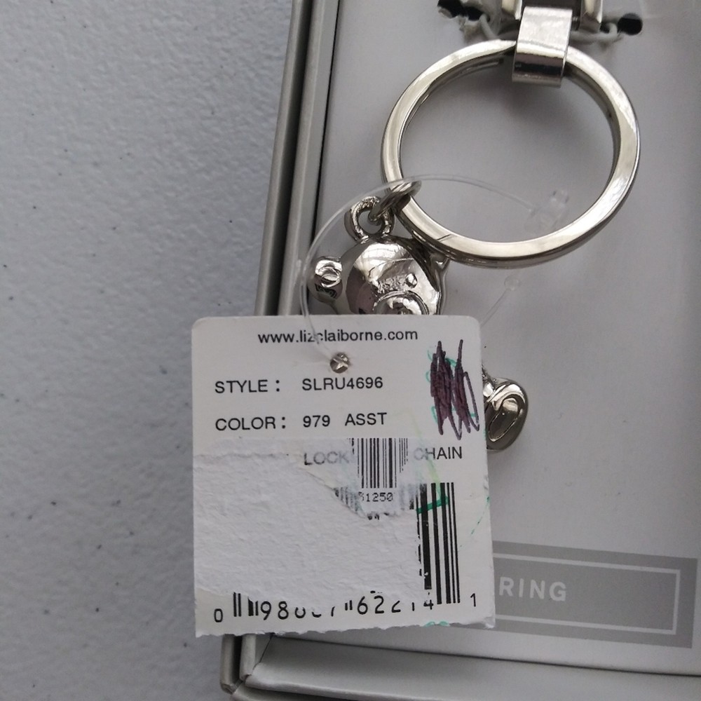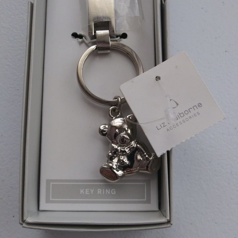 Liz Claiborne Silver Bear Keychain Leather Strap Silver metal bear Leather strap O ring New in box