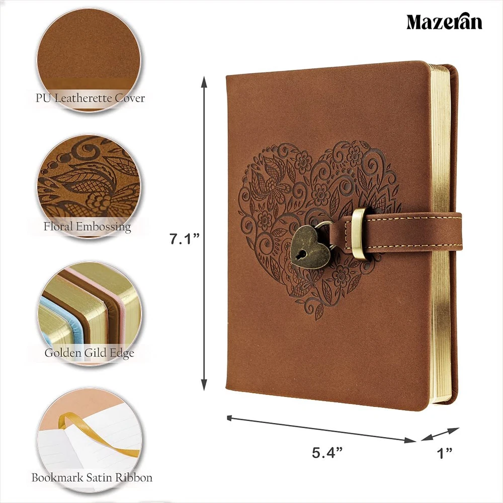 FFEATURE DESIGN: Heart-Shaped gold tone lock with 1 Key; Super comfort feel PU leather Hard Cover; 8mm article ruled pages and exquisite durable satin ribbon, 3 sides golden gilded edges; Bilateral Sewing. Best craftsmanship protects your precious ideas. Nice accessory for photographing in most occasion as well INNER PAGES: ACID FREE PAPER. high quality 100 gsm thick and durable papers. Smooth writing, fountain-pen ink friendly. Ink DOESN'T bleed through the page. 288 Pages (144 sheets) DIMENSION: 135 x 180mm (B6), Easy for handwriting and carrying in your bag. Perfect for taking in backpacks for nature hikes. Perfectly work as writing journal, diary, planner, general memory book, travel notebook, photo album ect GREAT GIFT: If you are looking for an elegant unique gift which would make any writer excited, then our Personal Journal is your right choice. For HER (friends / daughter / wife) in any special days. Many of our customers are artists, diary lovers, poets, students, etc SATISFACTION GUARANTEED: Fall in love with the locking journal! If you don't, just return it and receive or full ; no questions asked. WE VALUE YOUR PRIORITIES